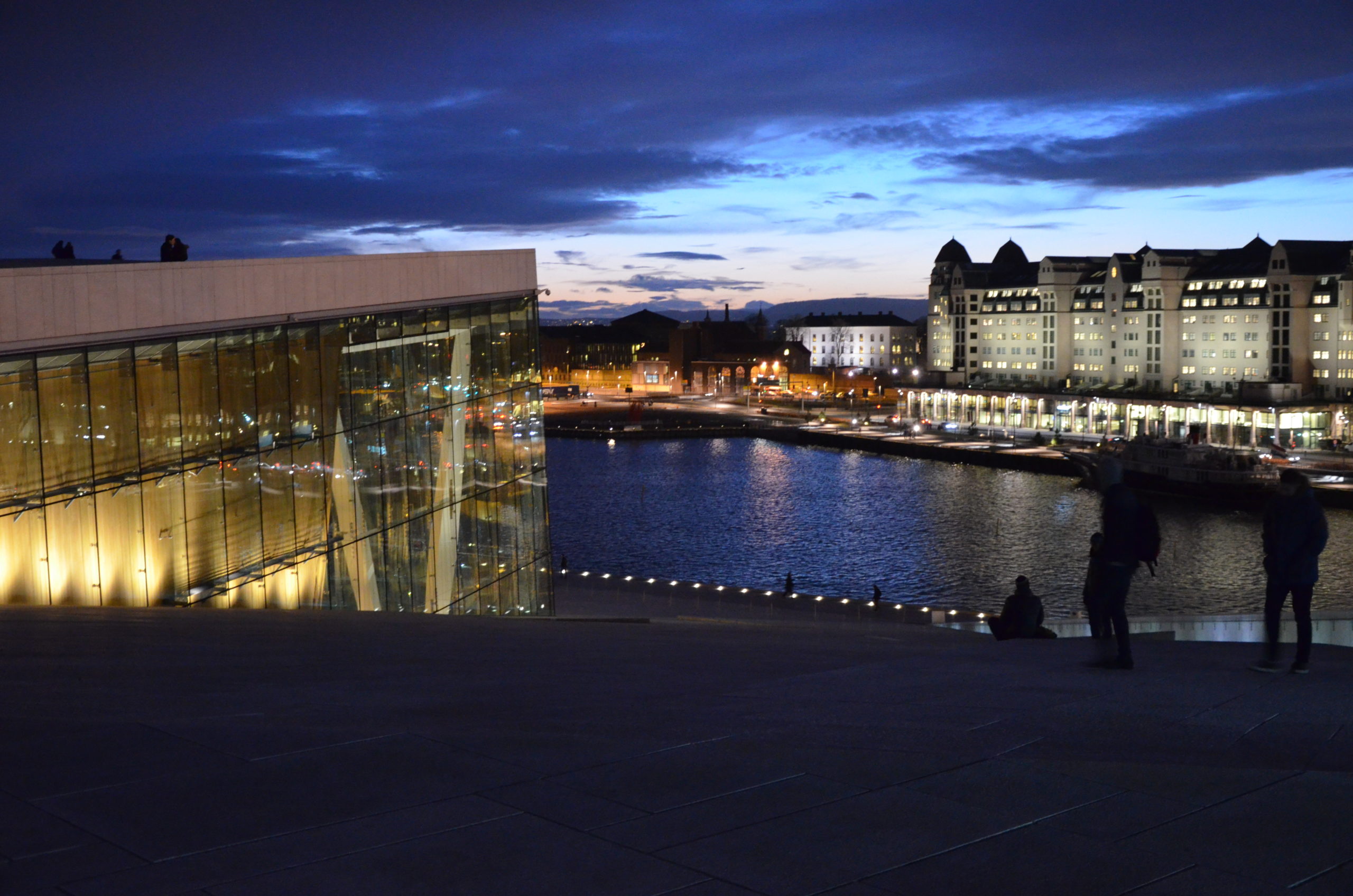 Vom Dach des spektakulären Opernhauses kann man der einen Seite eine Fjordlandschaft mit kleinen, traditionellen Holzhäusern, bemalt in hellen, freundlichen Farben und auf der anderen Seite das pulsierende Stadtleben der Hauptstadt entdecken.
