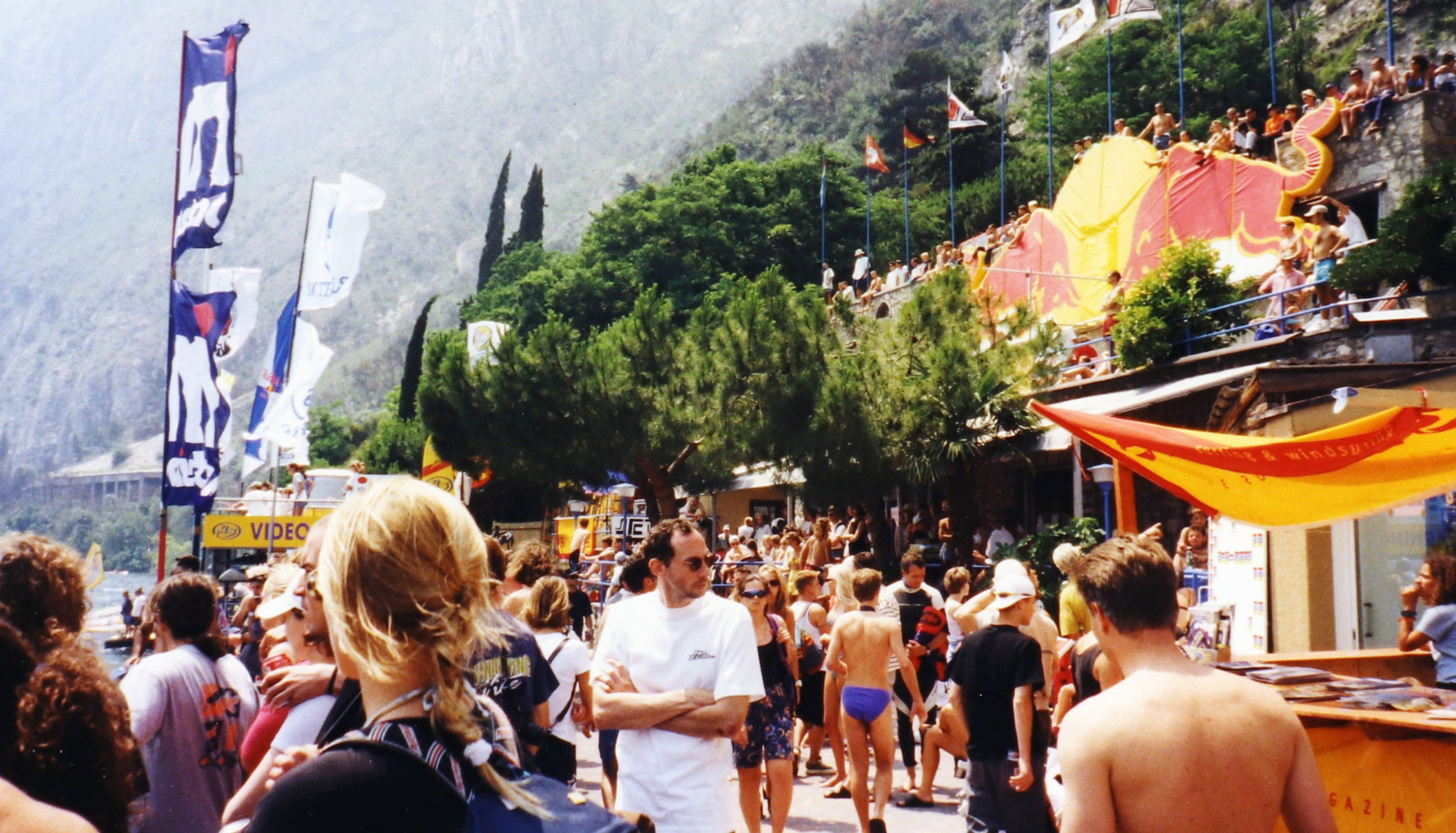 Die Jungs der Weltcup-Surfszene waren verwöhnt. Mit Wind, karibischem Wasser, weissen Sandstränden und den nötigen Wellen. Egal ob Profi oder passionierter Amateur - alle versuchten während der Saison ihre Zeit in den besten Surfrevieren der Welt zu verbringen. Und natürlich waren die Pro's immer auf der Suche nach zahlungskräftigen Sponsoren und Marken, die sie unterstützten. Das war eine Art Gegengeschäft, denn die Strahlkraft einer Surfmarke hing immer davon ab, wer gerade unter deren Flagge surfte. Waren die angesagten Heroes drunter, war die Gefolgschaft der Fangemeide gesichert und dadurch auch der Umsatz. Mit der Lancierung neuer Hardware oder hipper Surfklamotten war es schon lange nicht mehr getan, so waren gute Ideen gefragt, um noch mehr Aufmerksamkeit auf North Sails zu lenken. Die "creative Schaltzentrale", sprich unsere Marketingabteilung und Michi Plank, überboten sich mit den wildesten Ideen. Nach heissen Diskussionen entschieden wir uns für einen Event. Generell nichts Neues, aber der Inhalt hatte wirkliches Potential. Der "King of the Lake" war geboren. Wer hätte zu diesem Zeitpunkt gedacht, daß sich der Freestyle-Weltcup am Lago di Garda mal zu einem der prestigeträchtigsten Surf-Events entwickeln würde. Wie immer ging es nicht nur um Ruhm & Ehre, sondern um ein nicht unerhebliches Preisgeld und wichtige Worldcup-Punkte. Zwar nicht mit den Antrittsgeldern beim Tennis zu vergleichen, aber immerhin. Wir schickten unsere damaligen Zugpferde Björn Dunckerbeck und Robbie Naish ins Rennen. Das zog. Wo die sind, muß der Rest der Szene auch sein. Und da war das Surfhotel Pier am Nordwest-Ufer des Lagos zwischen Riva und Limone genau der richtige Hotspot. Die "Ora" konnte hier so richtig ausgekostet werden. Die Teams, die antraten waren eine Mischung aus Profis und Amateuren und in späteren Jahren kamen auch die Surfladies noch dazu. Blonde, braungebrannte und muskelgestählte Jungs, die die coolsten Tricks auf dem Wasser performten. Da konnte einfach keiner dran vorbeigehen. Wir hatten mit dem "King of the Lake" tatsächlich einen legendären Event ins Leben gerufen. Tagsüber gings auf dem Wasser zur Sache - abends in Torbole auf dem Dancefloor. Die Krönung der Kings and Queens of the Lake war dann der Höhepunkt der Veranstaltung. Schön ist, wenn man etwas ins Leben ruft, das lange Bestand hat. So waren wir in den Jahren nach dem ersten Event immer noch zu Gast am Pier und es hat sich einfach gut angefühlt. Eben wie "unser" Event.