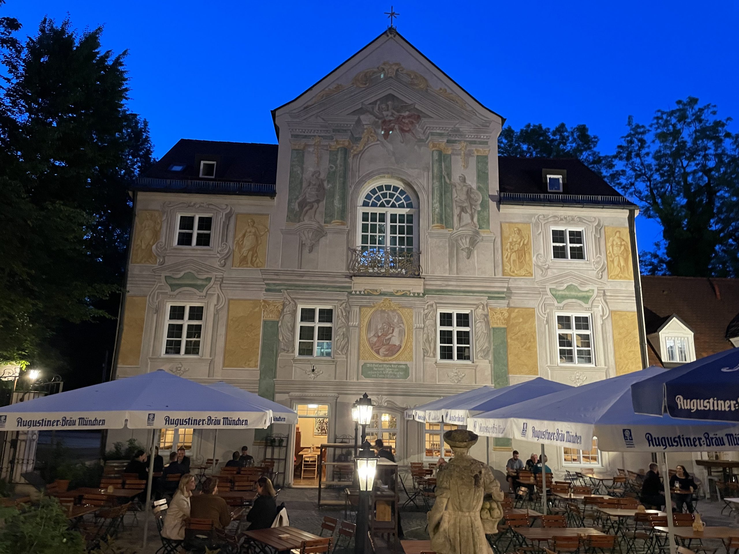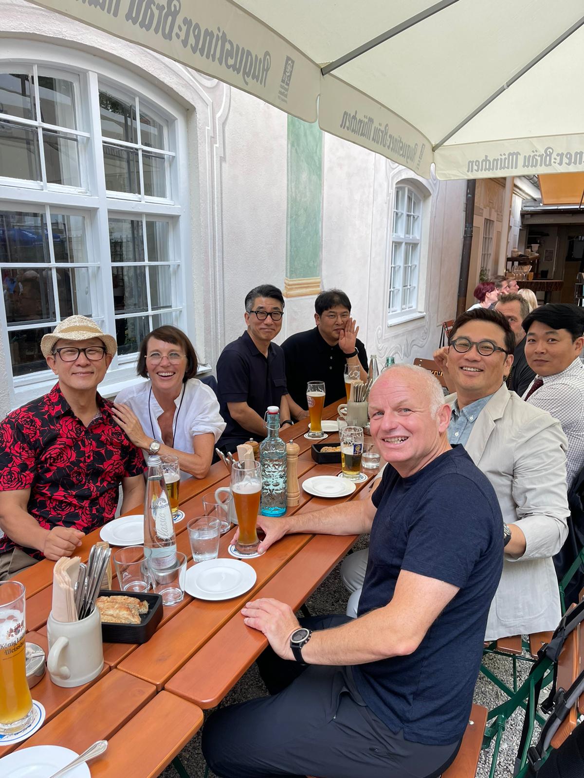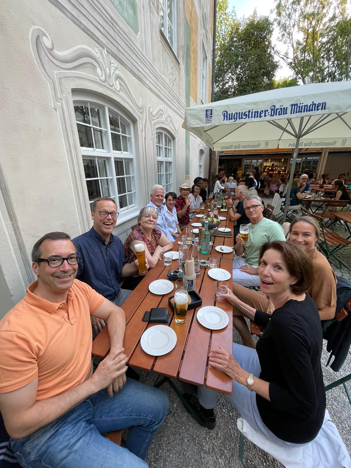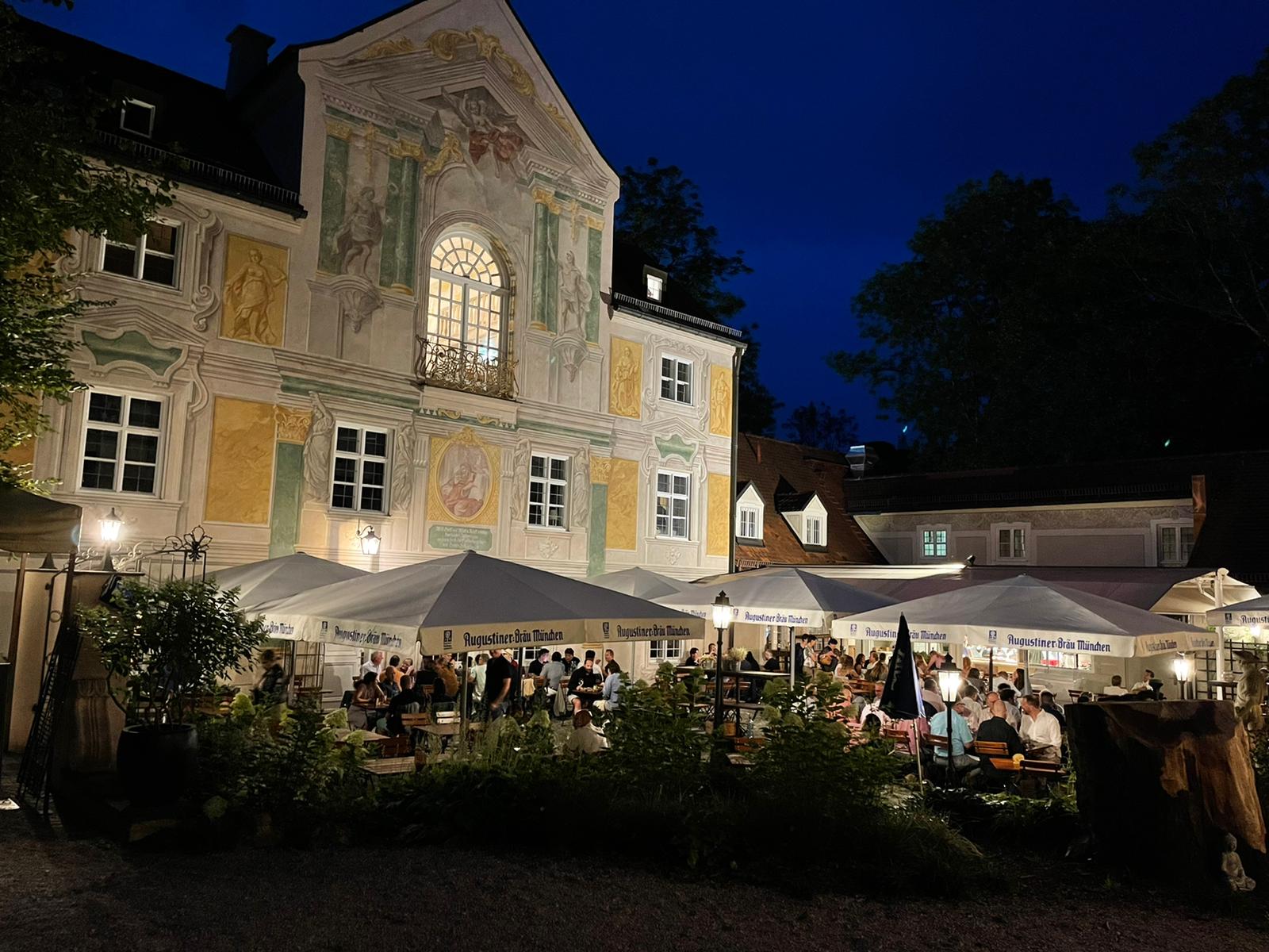 Im Rahmen eines beruflichen Besuchs meines langjährigen und daher eng vertrauten Aigner und Sympatex Mitarbeiters Steven Kim in München organisiere ich Ende Juli ein gemeinsames Treffen einiger Aigner Alumni mit Steven im Asam Schlössl. Dort werden sich die meisten von uns das erste Mal seit Jahren wieder einmal persönlich sehen. Ich selbst hatte Steven noch vor dem Ausbruch der Corona Pandemie in Korea besucht und ihn dort das letzte Mal getroffen. Mit insgesamt 17 Personen erleben wir am Donnerstag einen herrlichen Sommerabend im Biergarten des Asam Schlössl in der Nähe der Flosslände an der Isar. Das Asam-Schlössl ist ein Gebäude im Münchner Stadtteil Thalkirchen. Es war das Wohnhaus des Barockkünstlers Cosmas Damian Asam. Heute wird das Gebäude als historische Gaststätte genutzt. Es ist als Baudenkmal in die Bayerische Denkmalliste eingetragen und die Augustiner-Brauerei renovierte das barocke Anwesen, das außen wie innen ein echtes Schmuckstück ist: Reiche Fresken-Bemalung an der Fassade, dezent und gemütlich ausgestattete Gasträume und ein prächtiger Barocksaal, der für Festlichkeiten gemietet werden kann. Im Sommer ist der Wirtsgarten ein beliebtes Ausflugsziel. Das Haus liegt im zu Thalkirchen gehörenden Ortsteil Maria Einsiedel am Fuß des Isarhangs an dem Straßendreieck der von der Wolfratshauser Straße herabführenden Straße Kreppeberg, der vom Ortskern Thalkirchens herkommenden Maria-Einsiedelstraße und der von der Zentrallände herkommenden Benediktbeuerer Straße. Bereits 1687 erbaute der kurfürstliche Hofrat Adrian von Kray neben der seit dem 14. Jahrhundert bestehenden Schadeckmühle einen Landsitz in Thalkirchen, der damals deutlich vor München lag. Im Jahr 1724 kaufte Cosmas Damian Asam den Landsitz und baute ihn in der jetzigen Form zum Künstlersitz um. Die Kosten beglich er mit dem Honorar, das er für seine Freskoarbeiten im Schweizer Kloster Einsiedel erhalten hatte. Daher benannte er das Anwesen nach dem Schweizer Wallfahrtsort Asamisch Maria Einsiedel. Gegenüber dem Schlössl baute er eine Kapelle. Asams Tod beendete die Bautätigkeit und in der Folge wechselte das Schlössl mehrfach den Besitzer, bevor es eine Gastwirtschaft wurde. Von 1993 bis 2019 war Birgit Netzle Wirtin im Asam Schlössl. Nach einer umfassenden Sanierung des Schlössls führen Barbara und Shane McMahon seit September 2020 die traditionsreiche Wirtschaft als neue Wirte.