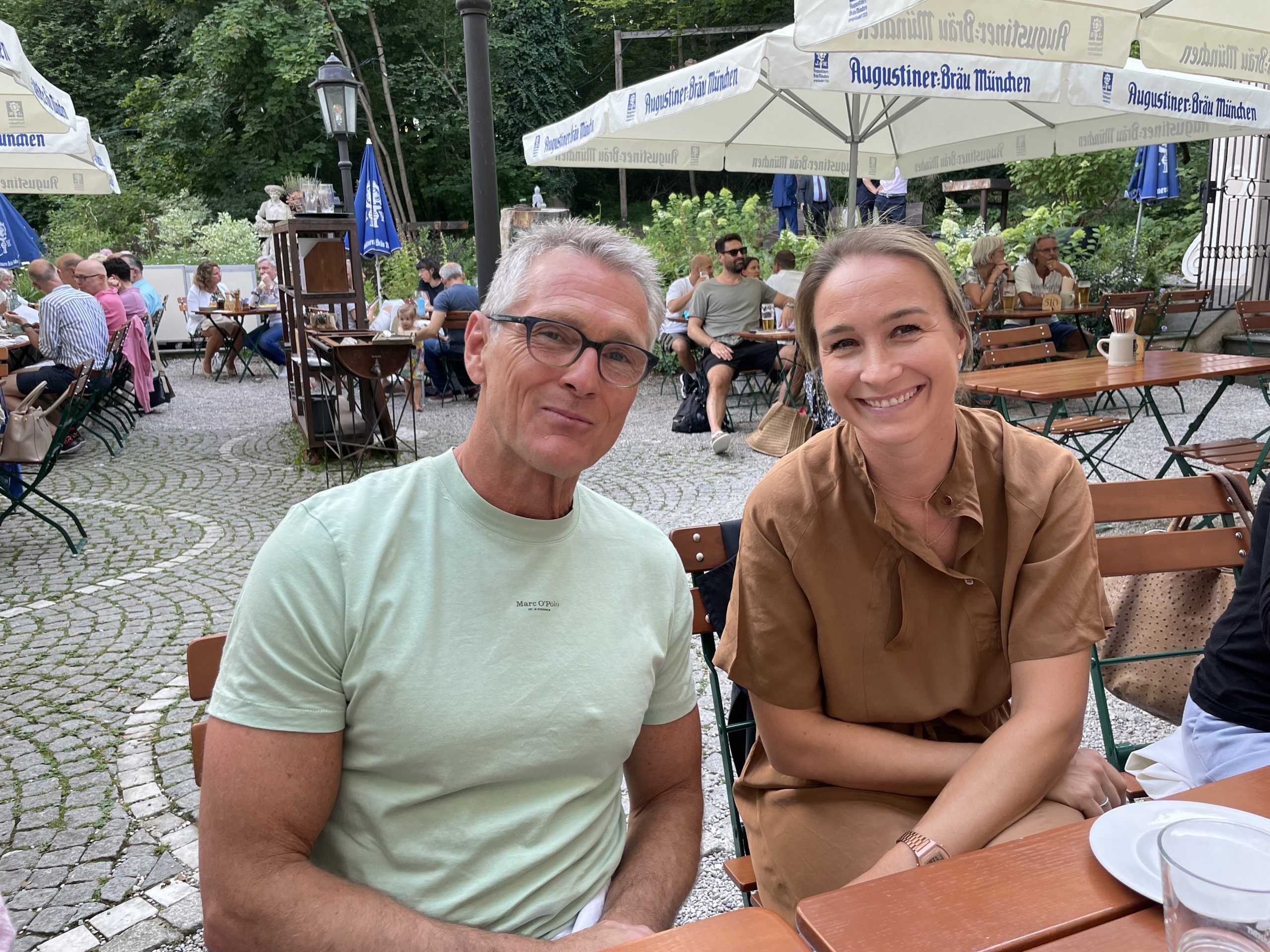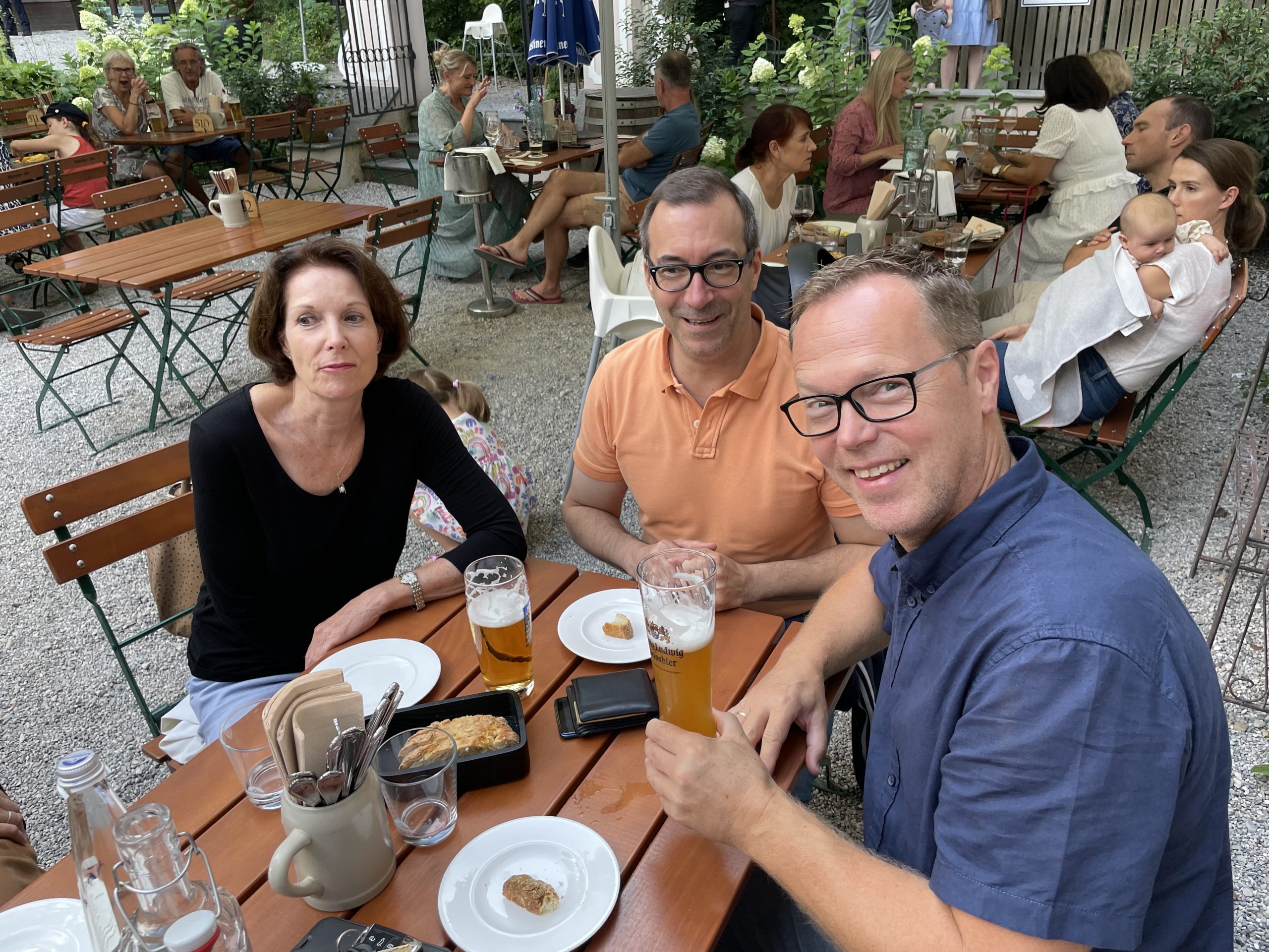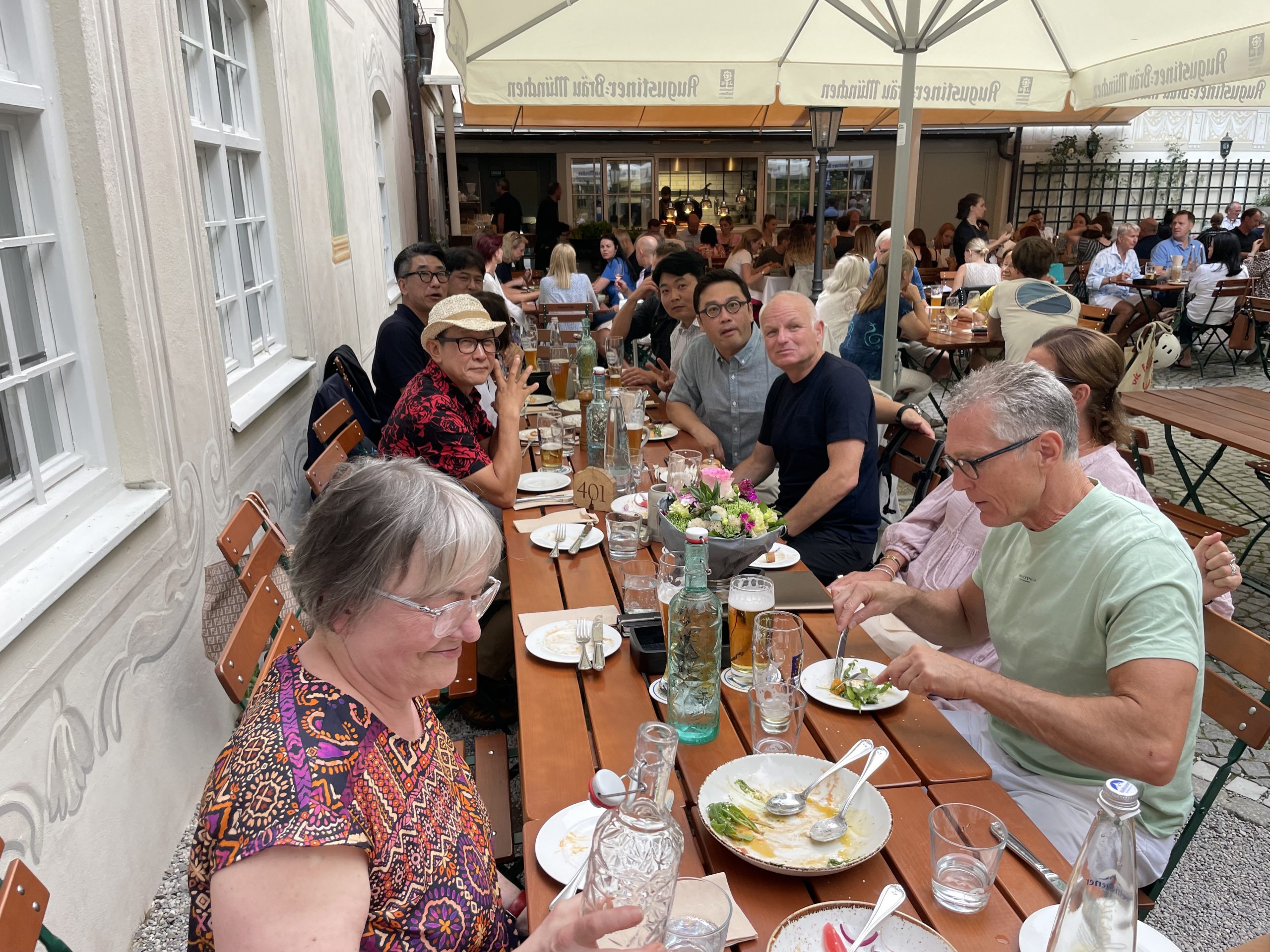 Im Rahmen eines beruflichen Besuchs meines langjährigen und daher eng vertrauten Aigner und Sympatex Mitarbeiters Steven Kim in München organisiere ich Ende Juli ein gemeinsames Treffen einiger Aigner Alumni mit Steven im Asam Schlössl. Dort werden sich die meisten von uns das erste Mal seit Jahren wieder einmal persönlich sehen. Ich selbst hatte Steven noch vor dem Ausbruch der Corona Pandemie in Korea besucht und ihn dort das letzte Mal getroffen. Mit insgesamt 17 Personen erleben wir am Donnerstag einen herrlichen Sommerabend im Biergarten des Asam Schlössl in der Nähe der Flosslände an der Isar. Das Asam-Schlössl ist ein Gebäude im Münchner Stadtteil Thalkirchen. Es war das Wohnhaus des Barockkünstlers Cosmas Damian Asam. Heute wird das Gebäude als historische Gaststätte genutzt. Es ist als Baudenkmal in die Bayerische Denkmalliste eingetragen und die Augustiner-Brauerei renovierte das barocke Anwesen, das außen wie innen ein echtes Schmuckstück ist: Reiche Fresken-Bemalung an der Fassade, dezent und gemütlich ausgestattete Gasträume und ein prächtiger Barocksaal, der für Festlichkeiten gemietet werden kann. Im Sommer ist der Wirtsgarten ein beliebtes Ausflugsziel. Das Haus liegt im zu Thalkirchen gehörenden Ortsteil Maria Einsiedel am Fuß des Isarhangs an dem Straßendreieck der von der Wolfratshauser Straße herabführenden Straße Kreppeberg, der vom Ortskern Thalkirchens herkommenden Maria-Einsiedelstraße und der von der Zentrallände herkommenden Benediktbeuerer Straße. Bereits 1687 erbaute der kurfürstliche Hofrat Adrian von Kray neben der seit dem 14. Jahrhundert bestehenden Schadeckmühle einen Landsitz in Thalkirchen, der damals deutlich vor München lag. Im Jahr 1724 kaufte Cosmas Damian Asam den Landsitz und baute ihn in der jetzigen Form zum Künstlersitz um. Die Kosten beglich er mit dem Honorar, das er für seine Freskoarbeiten im Schweizer Kloster Einsiedel erhalten hatte. Daher benannte er das Anwesen nach dem Schweizer Wallfahrtsort Asamisch Maria Einsiedel. Gegenüber dem Schlössl baute er eine Kapelle. Asams Tod beendete die Bautätigkeit und in der Folge wechselte das Schlössl mehrfach den Besitzer, bevor es eine Gastwirtschaft wurde. Von 1993 bis 2019 war Birgit Netzle Wirtin im Asam Schlössl. Nach einer umfassenden Sanierung des Schlössls führen Barbara und Shane McMahon seit September 2020 die traditionsreiche Wirtschaft als neue Wirte.