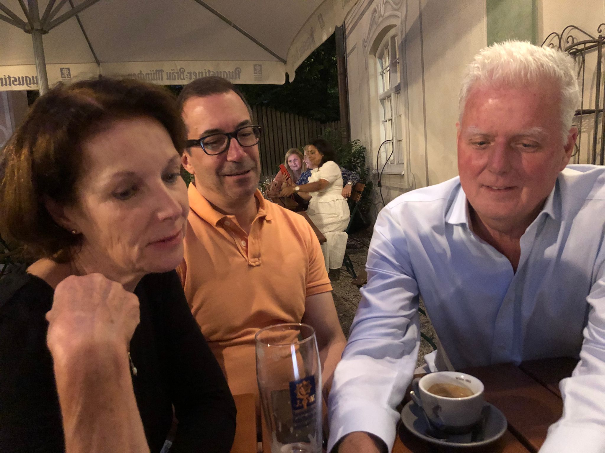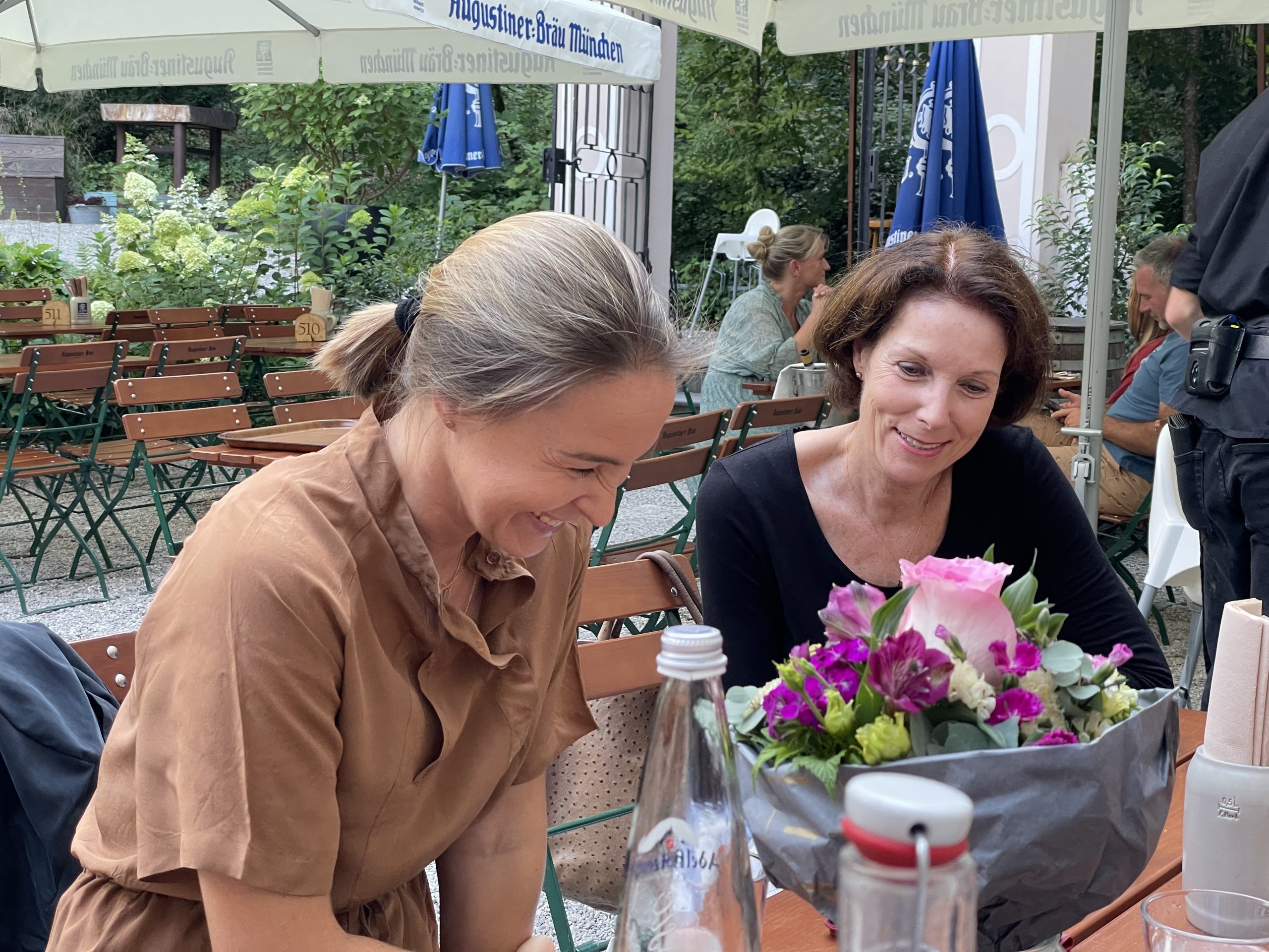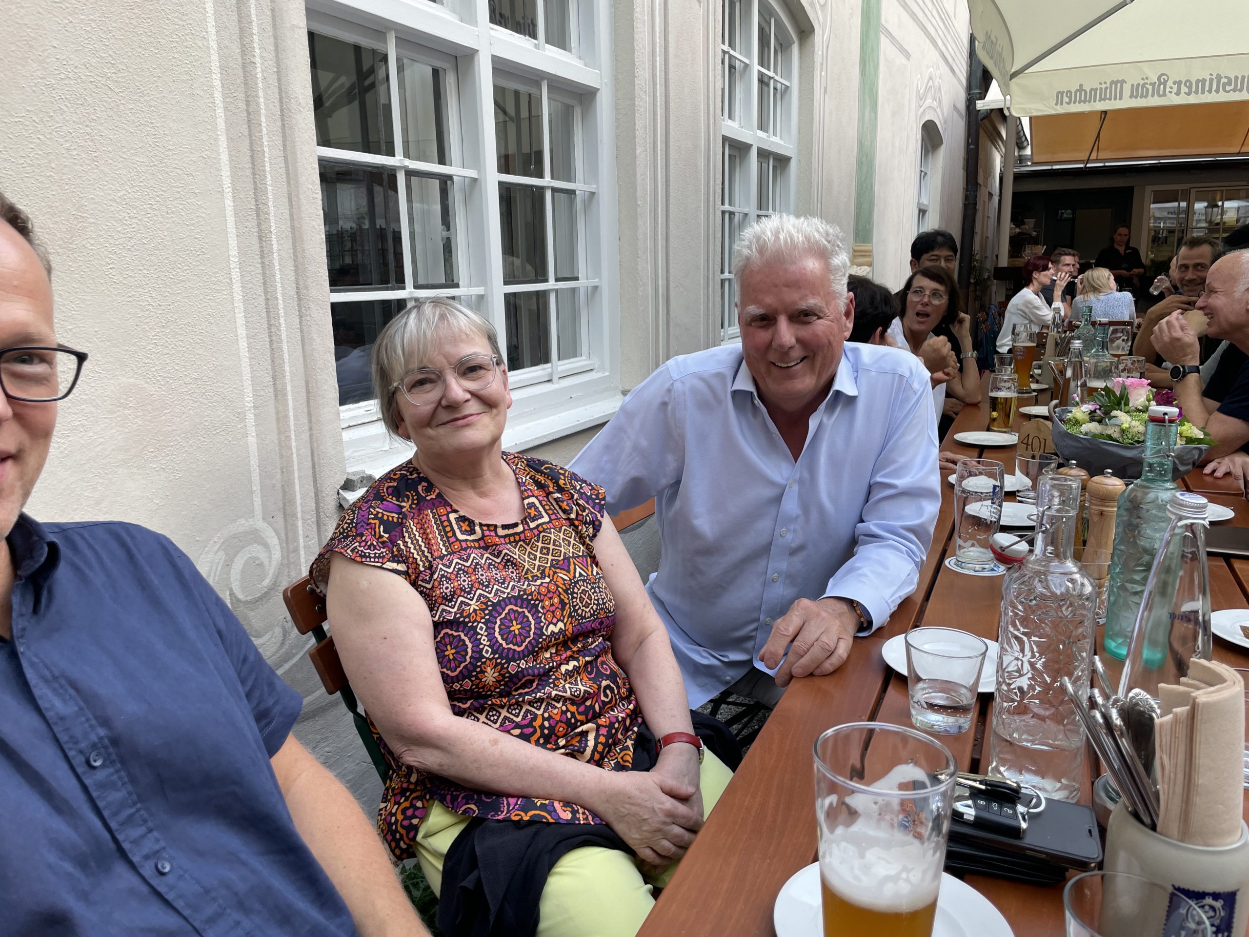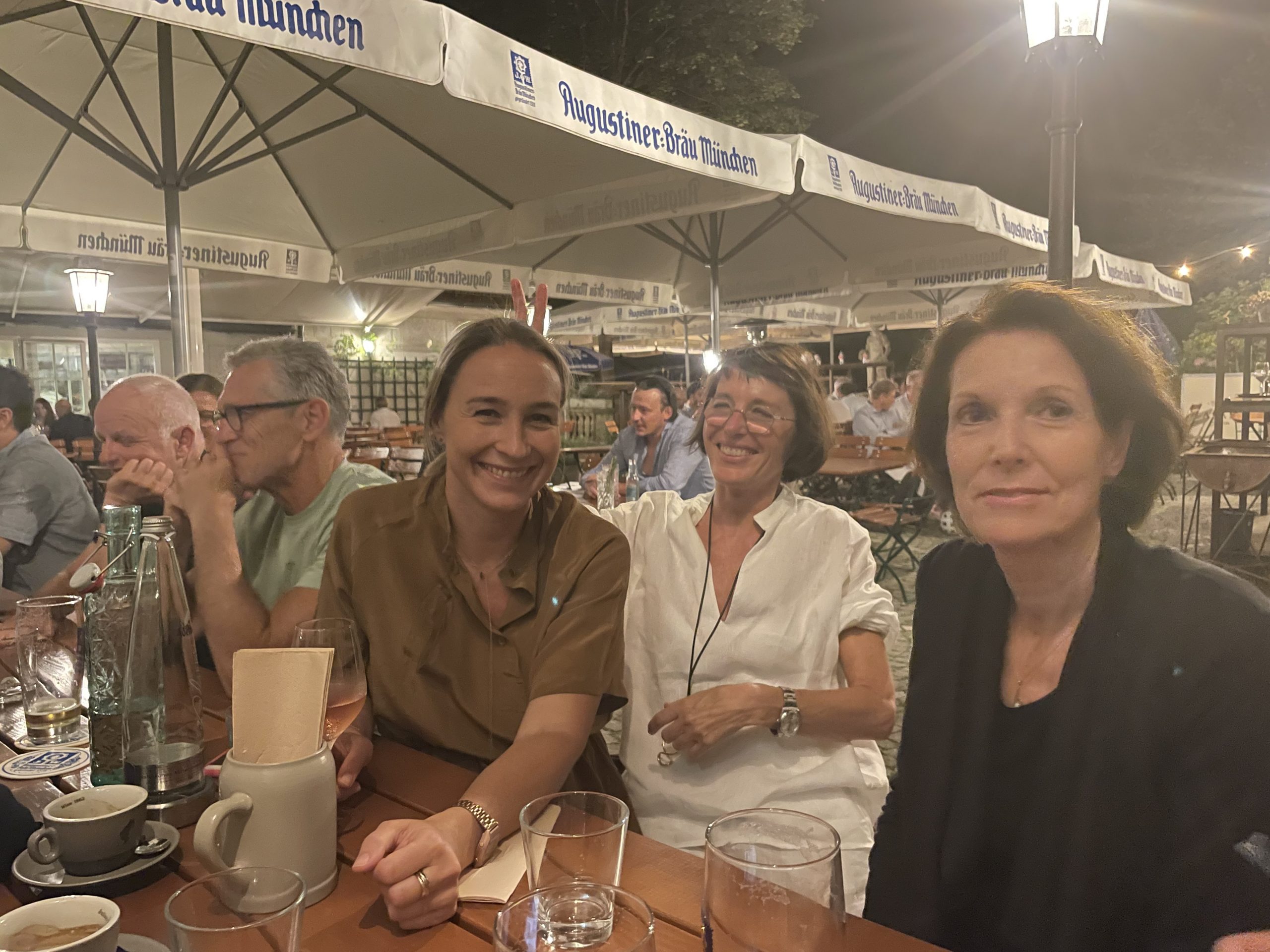 Im Rahmen eines beruflichen Besuchs meines langjährigen und daher eng vertrauten Aigner und Sympatex Mitarbeiters Steven Kim in München organisiere ich Ende Juli ein gemeinsames Treffen einiger Aigner Alumni mit Steven im Asam Schlössl. Dort werden sich die meisten von uns das erste Mal seit Jahren wieder einmal persönlich sehen. Ich selbst hatte Steven noch vor dem Ausbruch der Corona Pandemie in Korea besucht und ihn dort das letzte Mal getroffen. Mit insgesamt 17 Personen erleben wir am Donnerstag einen herrlichen Sommerabend im Biergarten des Asam Schlössl in der Nähe der Flosslände an der Isar. Das Asam-Schlössl ist ein Gebäude im Münchner Stadtteil Thalkirchen. Es war das Wohnhaus des Barockkünstlers Cosmas Damian Asam. Heute wird das Gebäude als historische Gaststätte genutzt. Es ist als Baudenkmal in die Bayerische Denkmalliste eingetragen und die Augustiner-Brauerei renovierte das barocke Anwesen, das außen wie innen ein echtes Schmuckstück ist: Reiche Fresken-Bemalung an der Fassade, dezent und gemütlich ausgestattete Gasträume und ein prächtiger Barocksaal, der für Festlichkeiten gemietet werden kann. Im Sommer ist der Wirtsgarten ein beliebtes Ausflugsziel. Das Haus liegt im zu Thalkirchen gehörenden Ortsteil Maria Einsiedel am Fuß des Isarhangs an dem Straßendreieck der von der Wolfratshauser Straße herabführenden Straße Kreppeberg, der vom Ortskern Thalkirchens herkommenden Maria-Einsiedelstraße und der von der Zentrallände herkommenden Benediktbeuerer Straße. Bereits 1687 erbaute der kurfürstliche Hofrat Adrian von Kray neben der seit dem 14. Jahrhundert bestehenden Schadeckmühle einen Landsitz in Thalkirchen, der damals deutlich vor München lag. Im Jahr 1724 kaufte Cosmas Damian Asam den Landsitz und baute ihn in der jetzigen Form zum Künstlersitz um. Die Kosten beglich er mit dem Honorar, das er für seine Freskoarbeiten im Schweizer Kloster Einsiedel erhalten hatte. Daher benannte er das Anwesen nach dem Schweizer Wallfahrtsort Asamisch Maria Einsiedel. Gegenüber dem Schlössl baute er eine Kapelle. Asams Tod beendete die Bautätigkeit und in der Folge wechselte das Schlössl mehrfach den Besitzer, bevor es eine Gastwirtschaft wurde. Von 1993 bis 2019 war Birgit Netzle Wirtin im Asam Schlössl. Nach einer umfassenden Sanierung des Schlössls führen Barbara und Shane McMahon seit September 2020 die traditionsreiche Wirtschaft als neue Wirte.