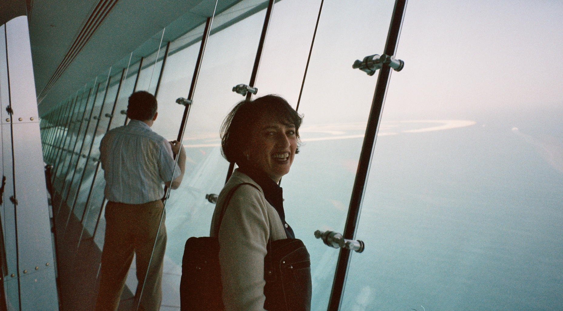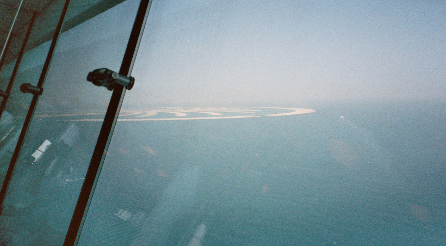 Monica Billes - unsere Middle East Vertriebschefin - geht nur zögerlich an die Fensterfront des Burj Al Arab um den Ausblick auf "The Palm" und "The World" zu geniessen. Ganz oben befindet sich übrigens ein Restautant mit phantastischem Ausblick