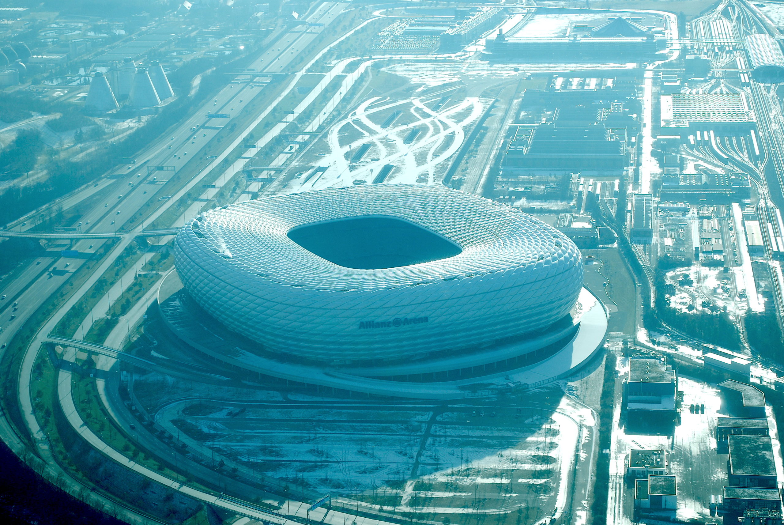 Das erste Highlight unseres Rundfluges. Die spektakuläre Allianz Arena, ein Meilenstein der Architektur von Herzog/deMeuron.