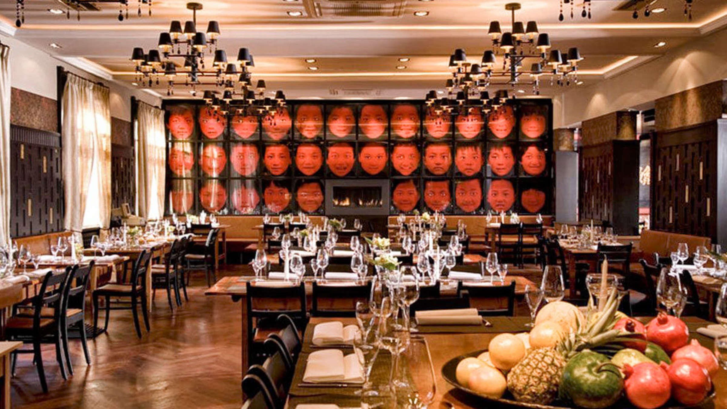 Asiatisches Mehrraumrestaurant mit Fusionsküche, Bar, eleganter Einrichtung, Kunstwerken & asiatischem Garten.