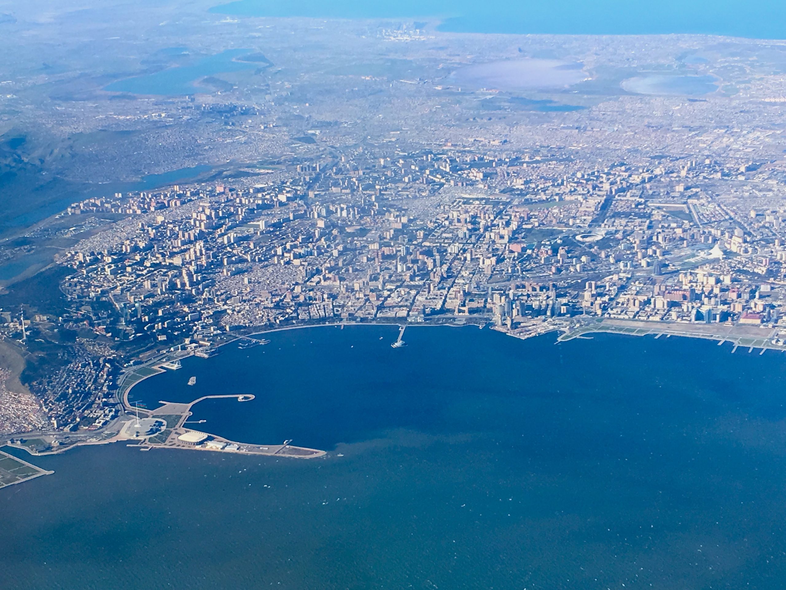 Baku, Hauptstadt von Aserbaidschan, liegt auf einer Landzunge am Kaspischen Meer