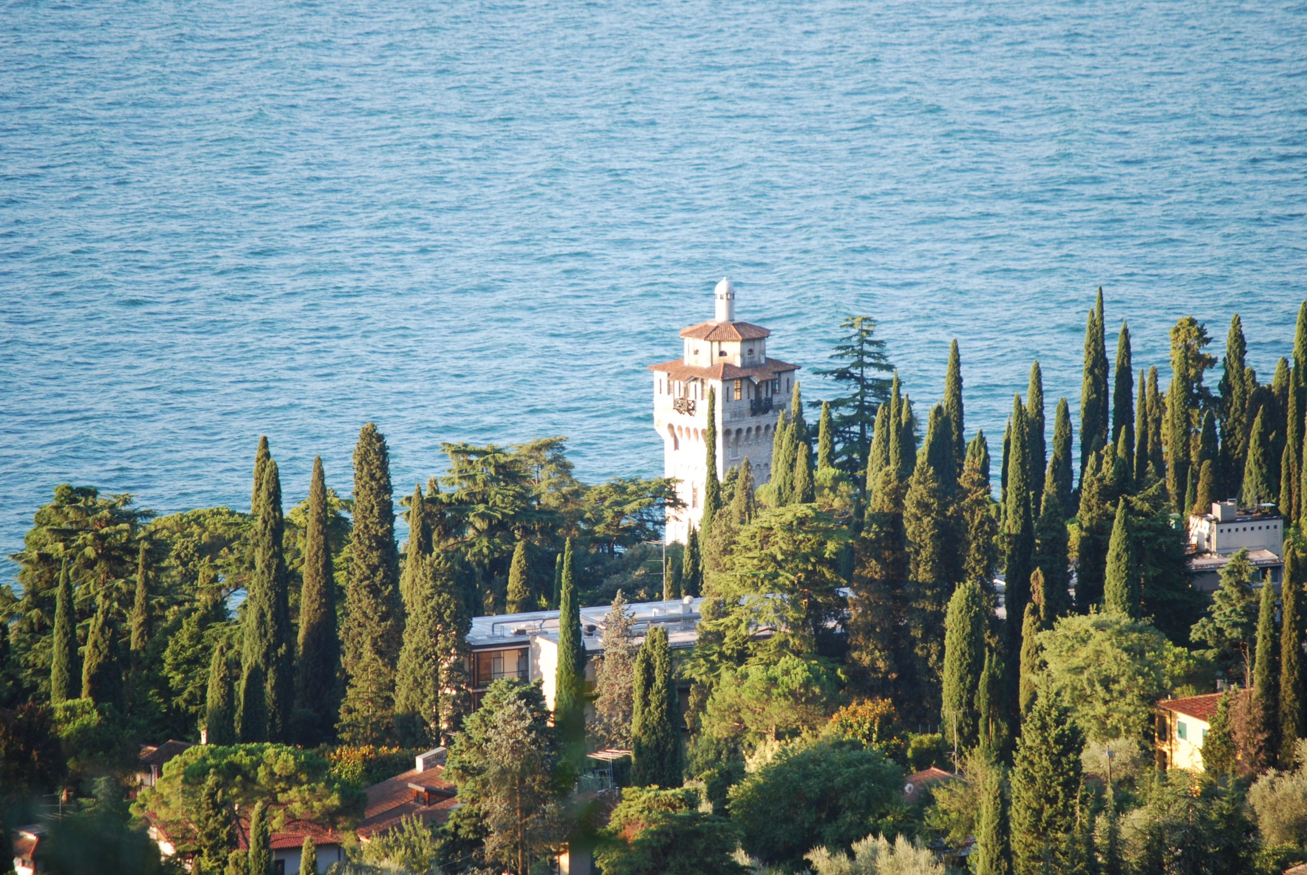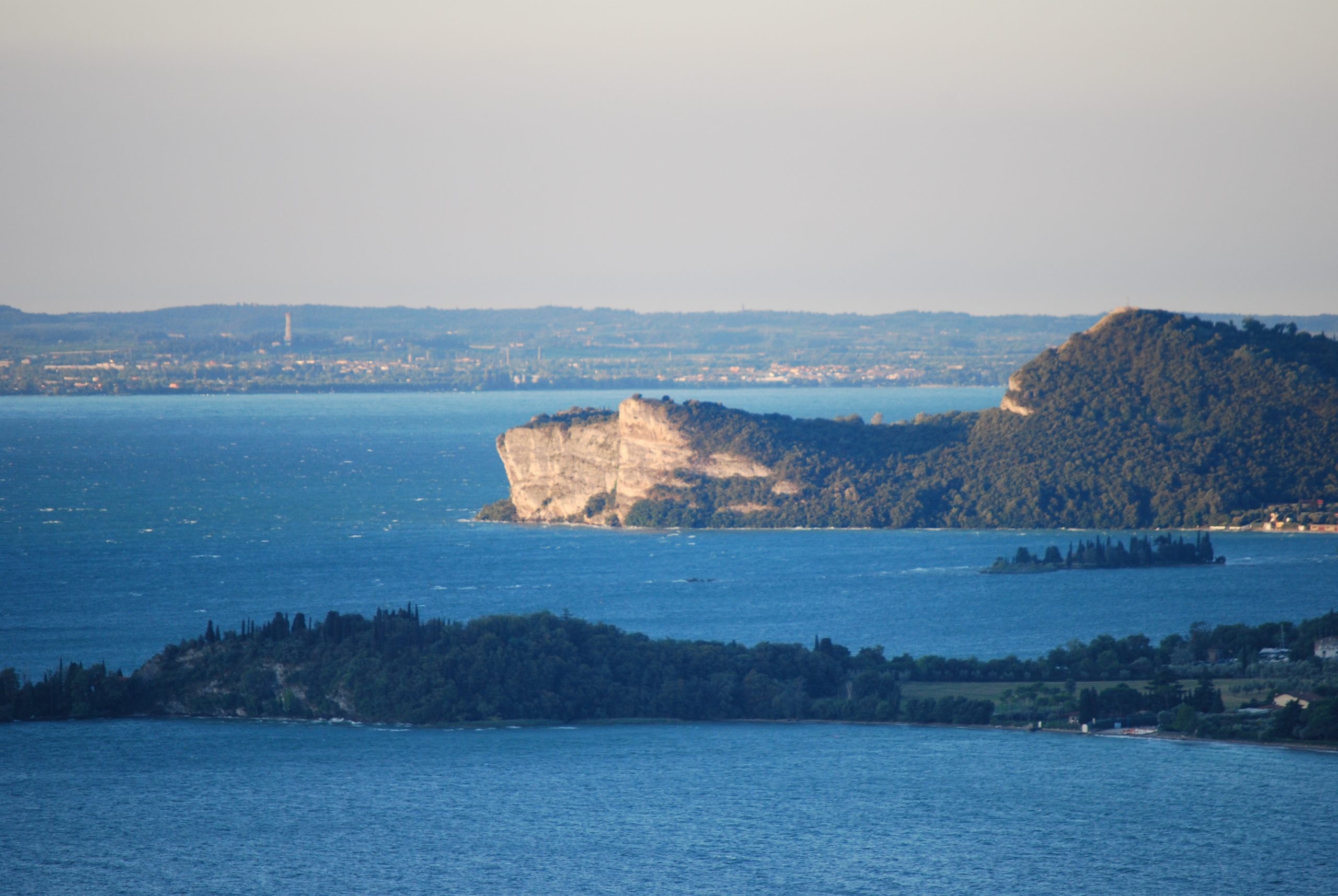 Blick vom Beachclub Darsena auf die Isola del Garda. Das durchs Bild fahrende Tragflächenboot vom Typ RHS 150 wurde in verschiedensten Versionen gebaut. Die Standardausführung war für den Einsatz auf dem Meer gedacht, während verschiedene Abwandlungen auf den oberitalienischen Seen Anwendung fanden und bis heute im Einsatz sind (RHS 150 SL/FL). Die Boote sind 29 Meter lang und 6,50 Meter breit und mit einer Geschwindigkeit von 55 km/h und einer Kapazität von bis zu 186 Personen unterwegs. Der Hersteller ist die Firma Leopoldo Rodriquez Cantieri Navali in Messina.