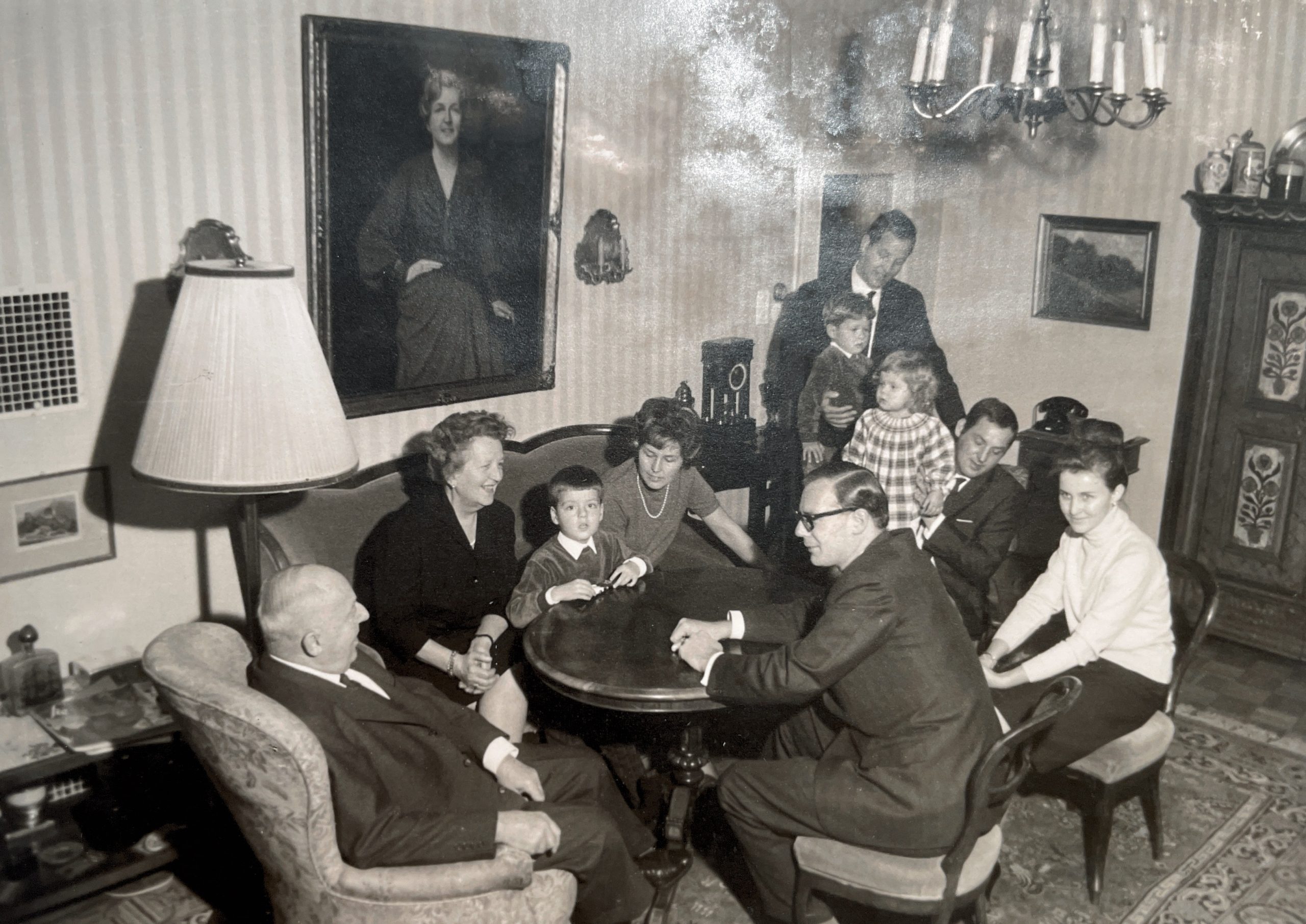 Die Familie - noch mit unserem Großvater Hans - und Onkel Horsti als Single versammelt in der guten Stube in der Gerolfingerstraße