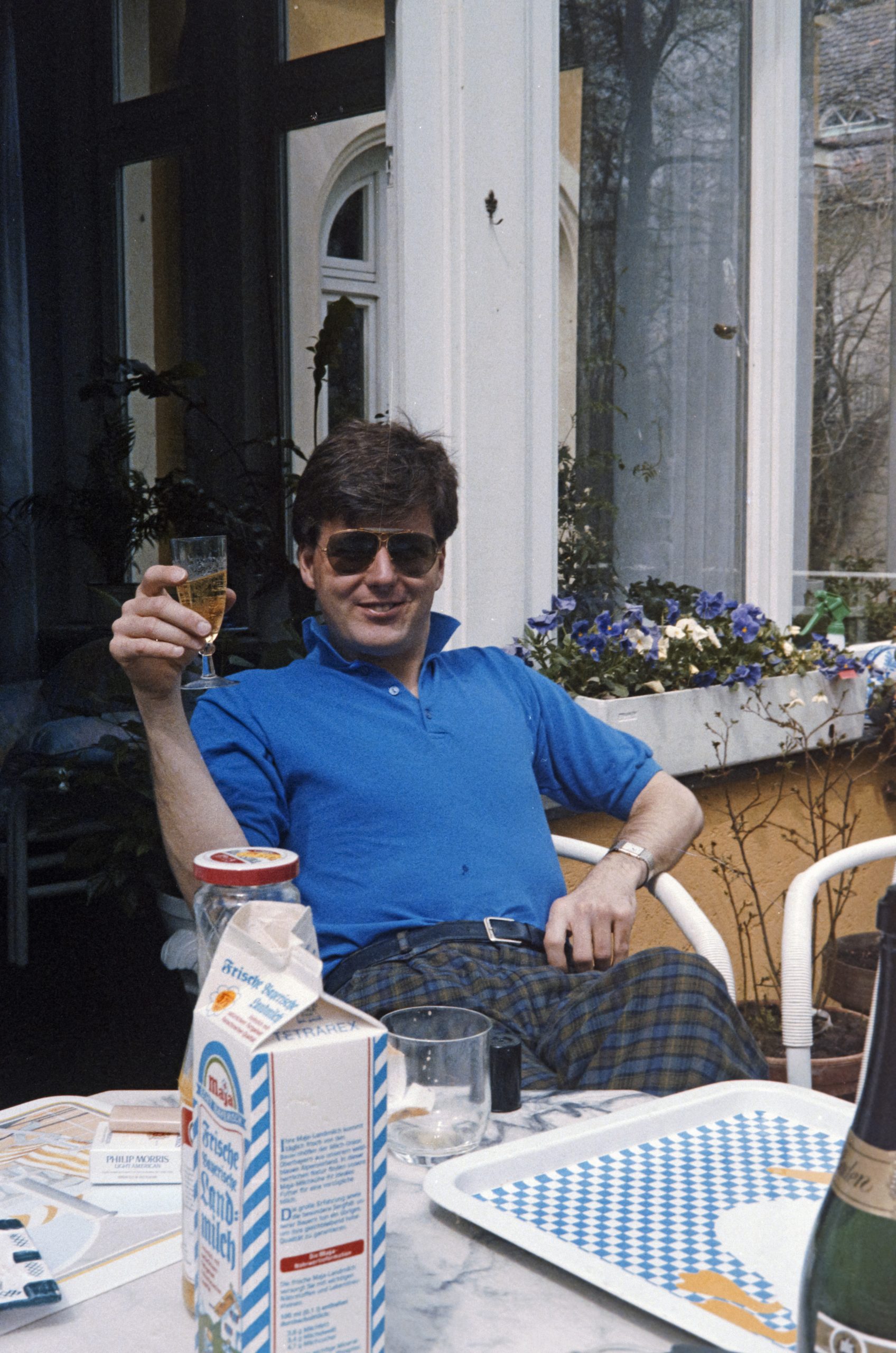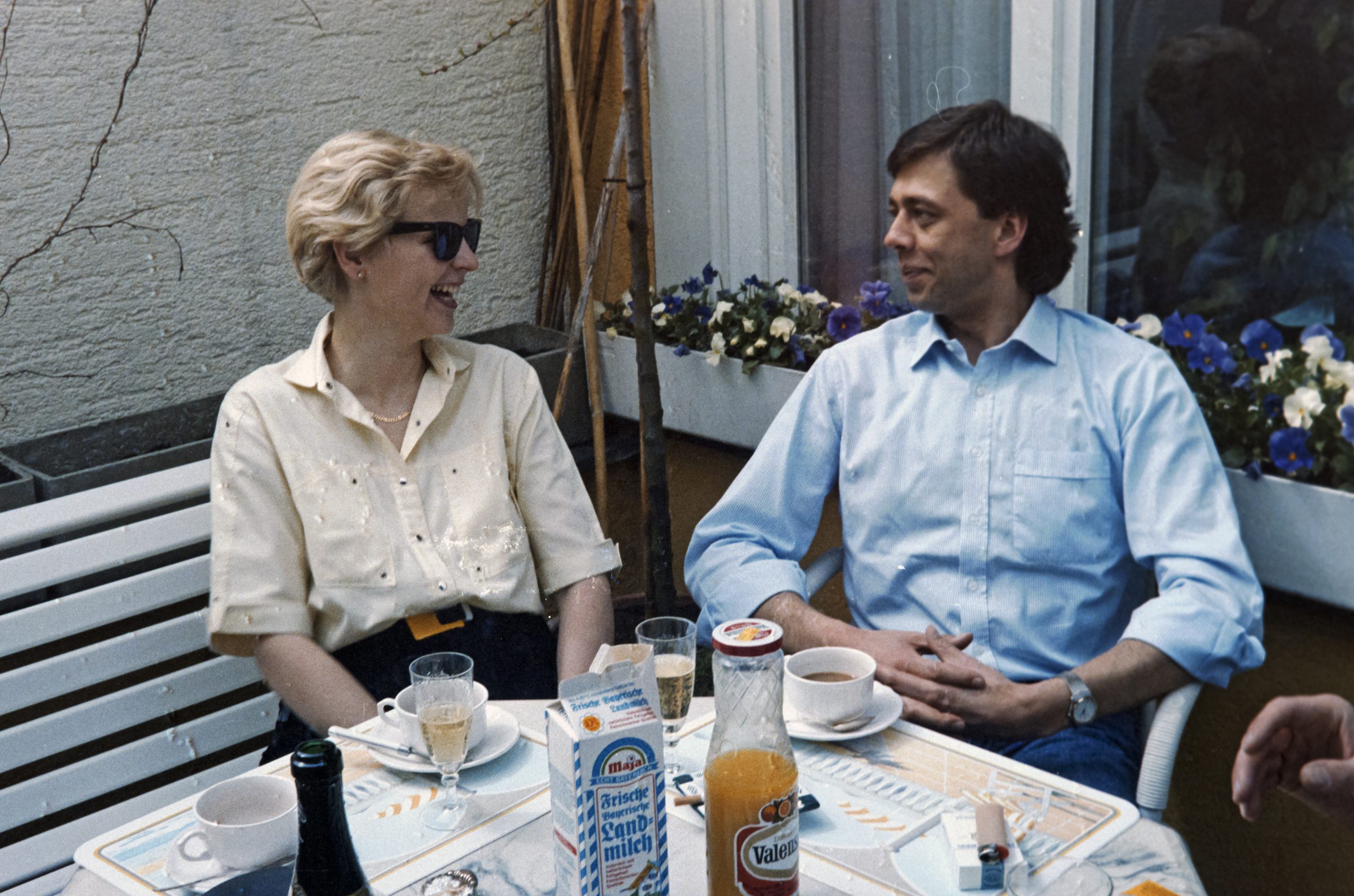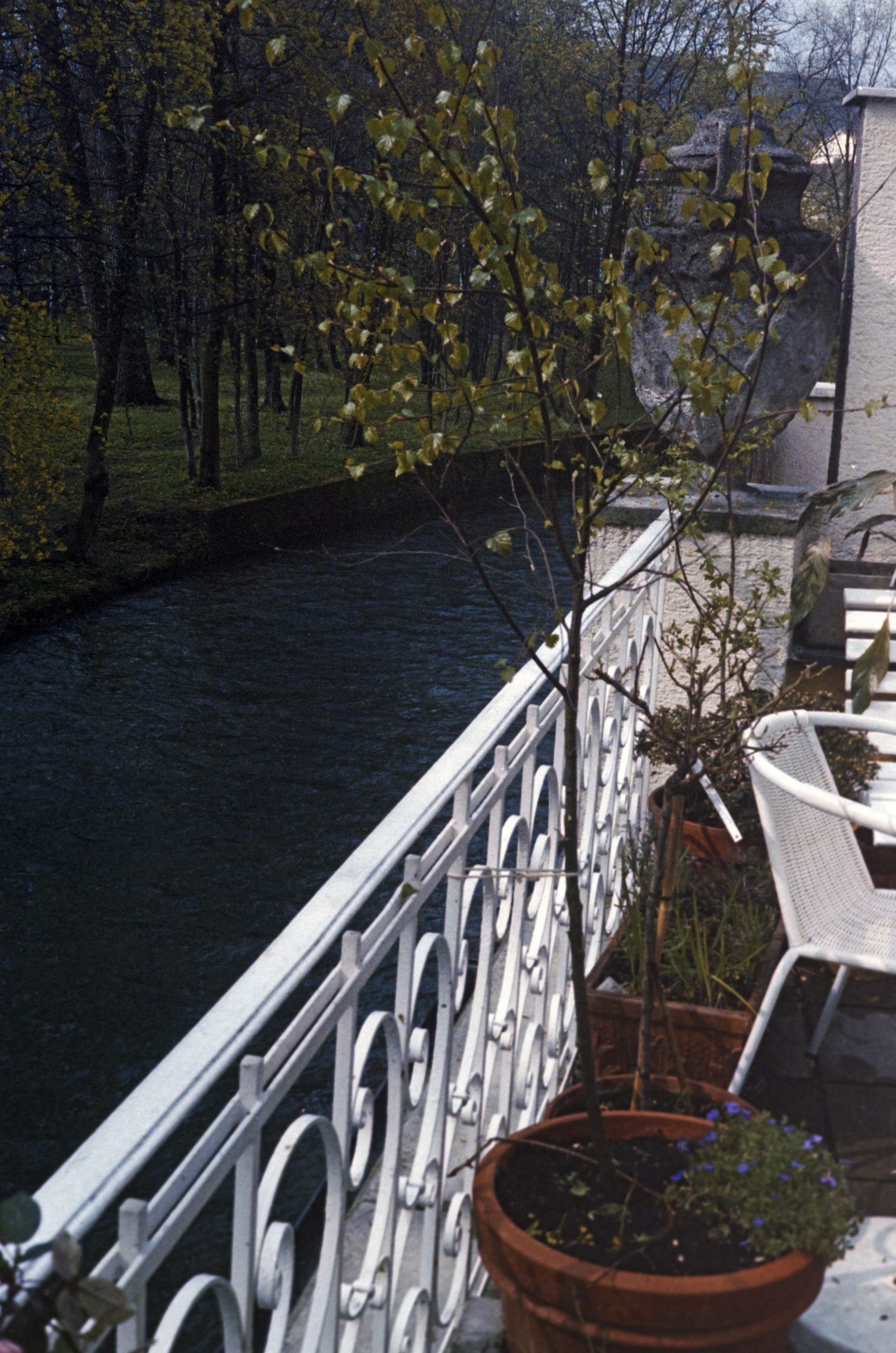 Unsere Trauzeugin Bettina und ihr Gatte Thomas kamen zu Besuch aus Münster nach München und wir organisierten einen kleinen Brunch in unsere Wohnung in der Altschwabinger Mandlstrasse 10. Auch Thomas Schwester Mareille Poullain kam vom St. Anna Platz aus dem Lehel zu uns an den Englischen Garten. Zudem stoßen Bruno und Susanne Weidl - beide ehemalige Studenten aus Münster und dadurch Freunde von Thomas und Bettina - sowie Sigi Nuemann als gebürtiger Osnabrücker und gemeinsam mit Bettina Trauzeuge bei Nicis und meiner Hochzeit im Jahr zuvor zu unserem Happening mit dazu. Wir verbrachten einen sehr schönen April Tag auf unserer Terrasse oberhalb des Schwabinger Bachs, von wo aus der Ausblick in den Englischen Garten einzigartig war. Der Schwabinger Bach ist ein Bach im Englischen Garten in München, der als westlichste der Bäche als ein Teilstück des Eisbachs beginnt. Nach dem Wasserfall nördlich der Prinzregentenstrasse wird er als Schwabinger Bach bezeichnet, fließt am Japanischen Teehaus vorbei und durchfließt die als FKK-Gelände bekannt gewordene Schönfeldwiese. Nach der Einmündung des Entenbachs umfließt er am westlichen Rand des Englischen Gartens den Kleinhesseloher See, bevor er den Mittleren Ring unterquert. Kurzzeitig geteilt dient er dann der Energieversorgung des Lodenfrey Parks. Auf Höhe des Nordfriedhofs mündet linksseitig der Nymphenburg-Biedersteiner Kanal ein. Am Aumeister trennen sich Schwabinger Bach und Mühlbach, der durch das Gelände des ehemaligen Freibads Floriansmühle verläuft.