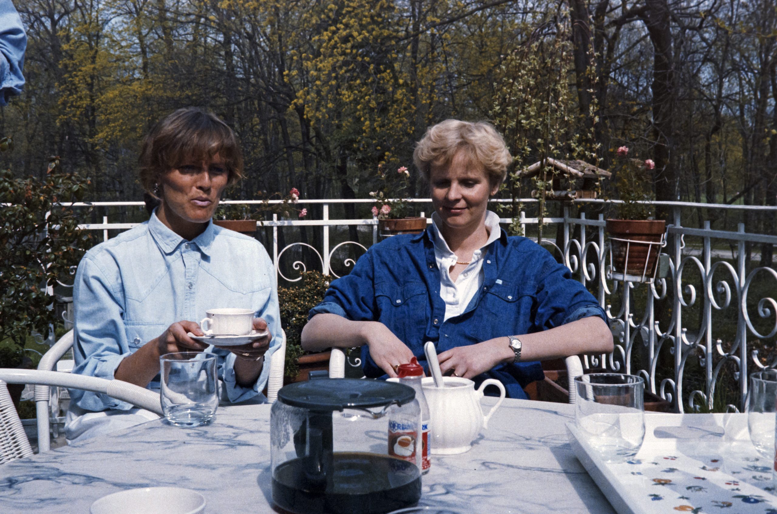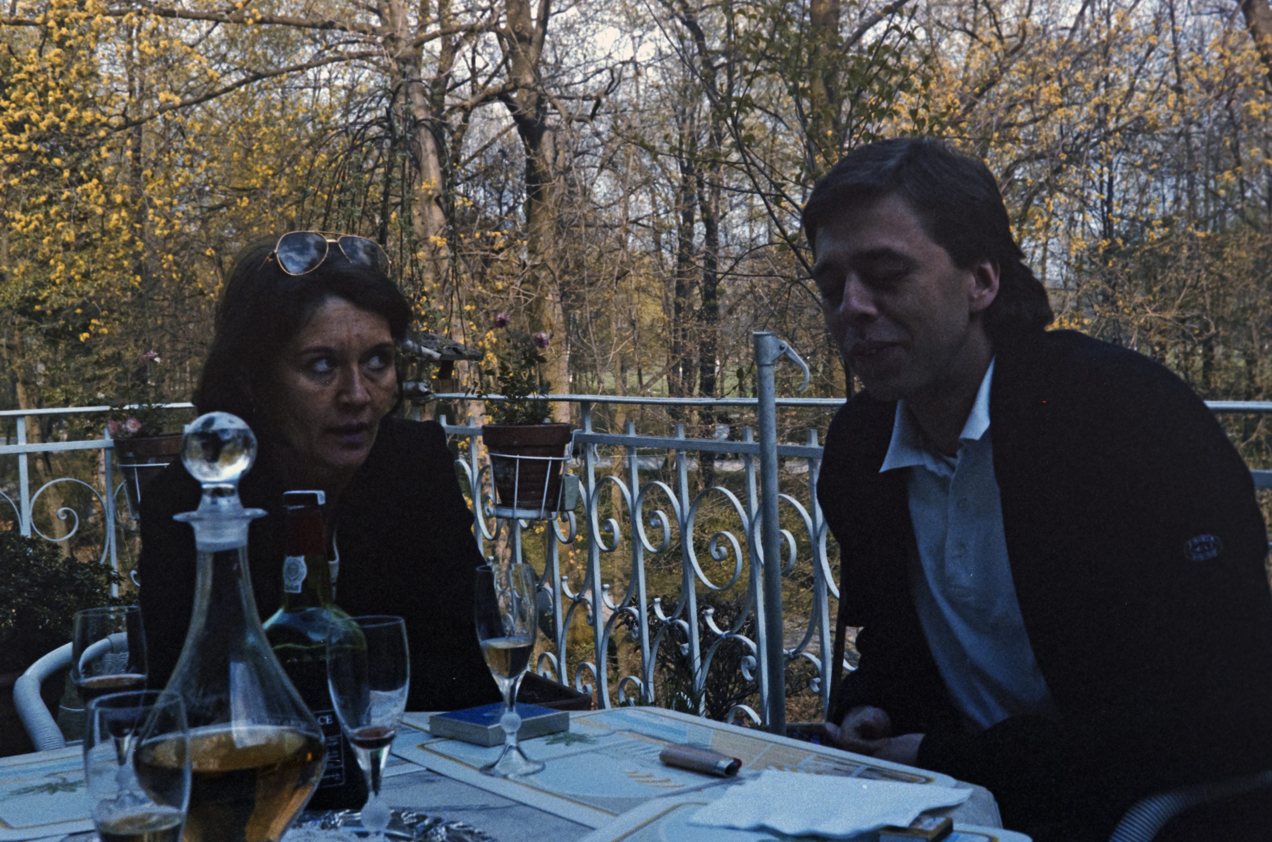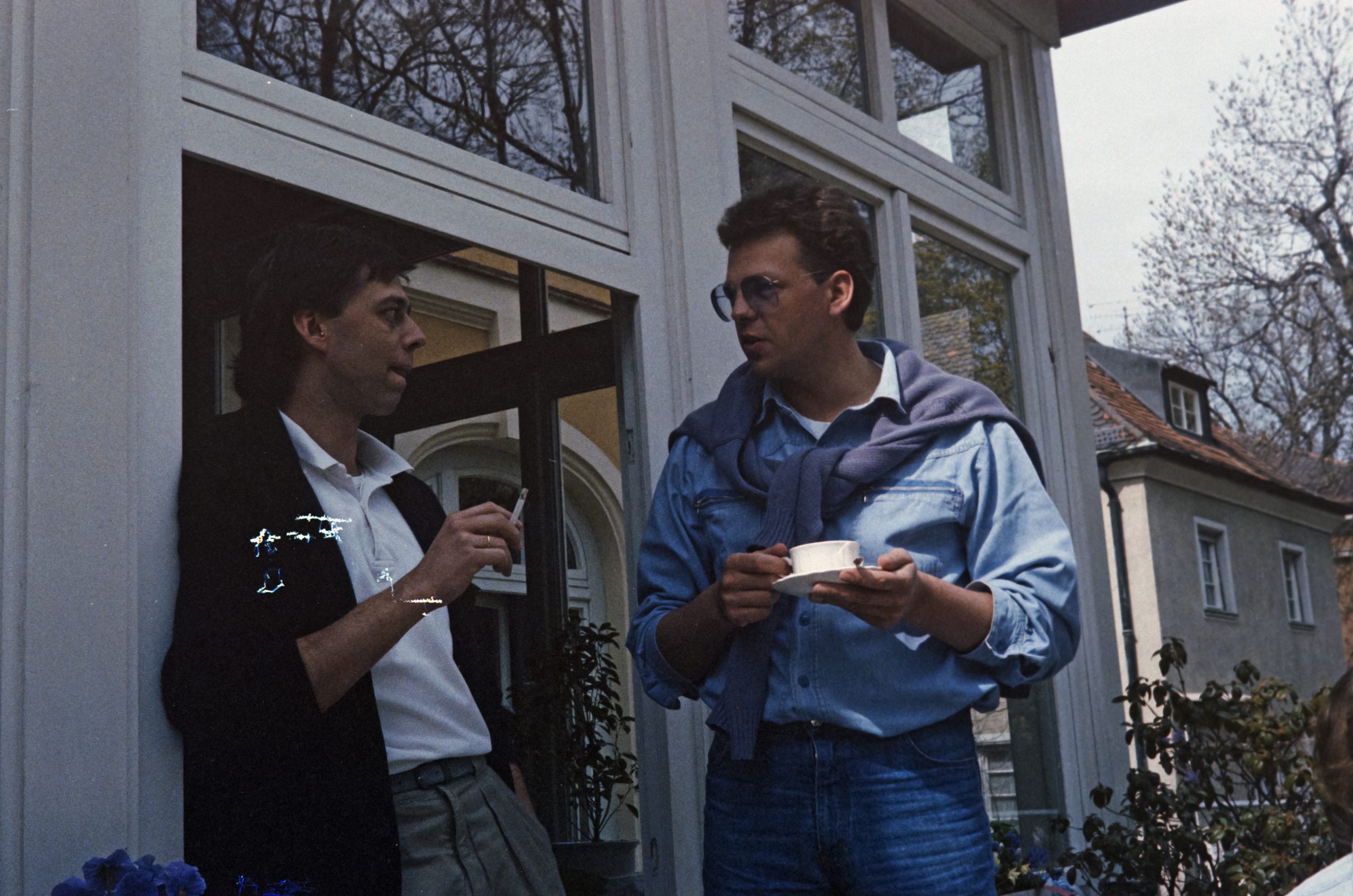 Unsere Trauzeugin Bettina und ihr Gatte Thomas kamen zu Besuch aus Münster nach München und wir organisierten einen kleinen Brunch in unsere Wohnung in der Altschwabinger Mandlstrasse 10. Auch Thomas Schwester Mareille Poullain kam vom St. Anna Platz aus dem Lehel zu uns an den Englischen Garten. Zudem stoßen Bruno und Susanne Weidl - beide ehemalige Studenten aus Münster und dadurch Freunde von Thomas und Bettina - sowie Sigi Nuemann als gebürtiger Osnabrücker und gemeinsam mit Bettina Trauzeuge bei Nicis und meiner Hochzeit im Jahr zuvor zu unserem Happening mit dazu. Wir verbrachten einen sehr schönen April Tag auf unserer Terrasse oberhalb des Schwabinger Bachs, von wo aus der Ausblick in den Englischen Garten einzigartig war. Der Schwabinger Bach ist ein Bach im Englischen Garten in München, der als westlichste der Bäche als ein Teilstück des Eisbachs beginnt. Nach dem Wasserfall nördlich der Prinzregentenstrasse wird er als Schwabinger Bach bezeichnet, fließt am Japanischen Teehaus vorbei und durchfließt die als FKK-Gelände bekannt gewordene Schönfeldwiese. Nach der Einmündung des Entenbachs umfließt er am westlichen Rand des Englischen Gartens den Kleinhesseloher See, bevor er den Mittleren Ring unterquert. Kurzzeitig geteilt dient er dann der Energieversorgung des Lodenfrey Parks. Auf Höhe des Nordfriedhofs mündet linksseitig der Nymphenburg-Biedersteiner Kanal ein. Am Aumeister trennen sich Schwabinger Bach und Mühlbach, der durch das Gelände des ehemaligen Freibads Floriansmühle verläuft.