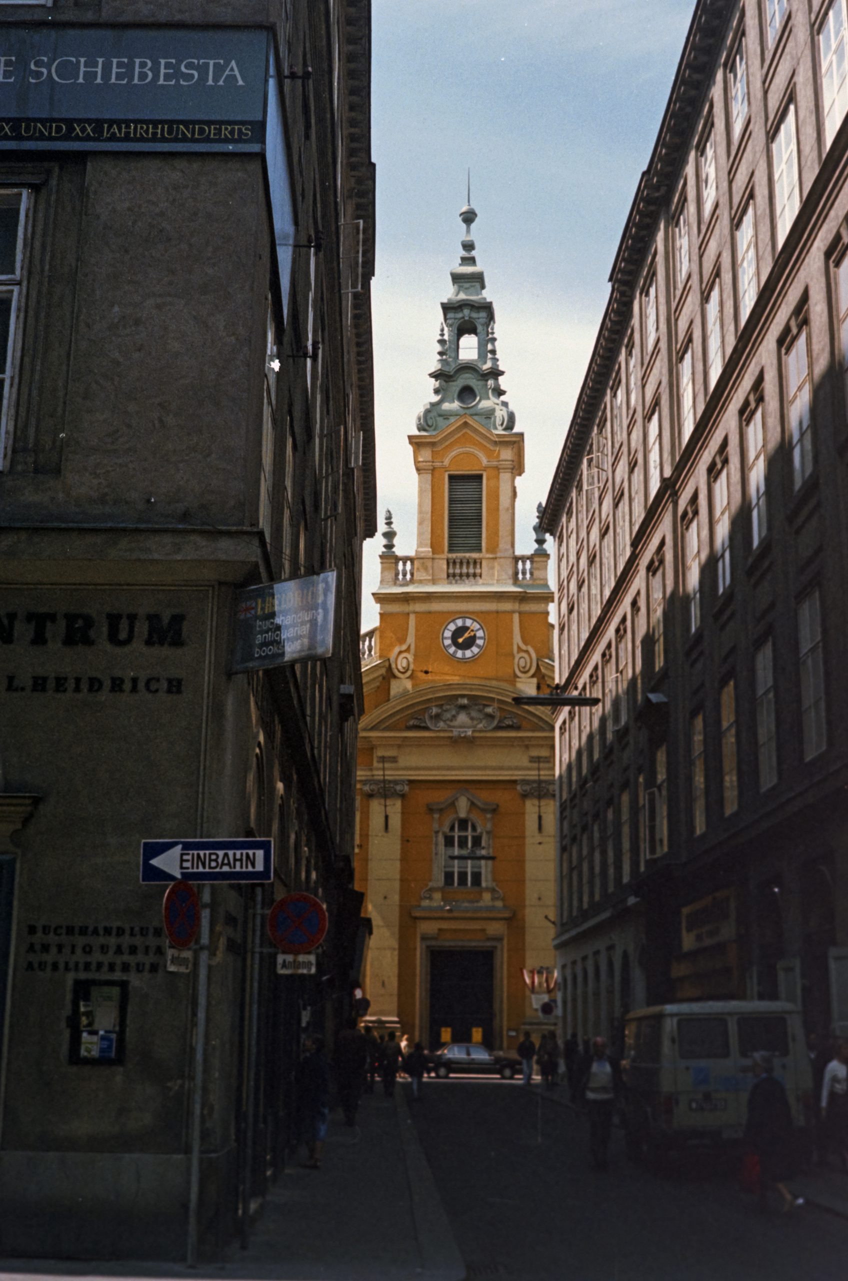 Von hier hat man einen schönen Blick auf die Reformierte Stadtkirche. Das ist ein Kirchengebäude der Evangelischen Kirche Helvetischen Bekenntnisses in Österreich im 1. Wiener Gemeindebezirk Innere Stadt. Die an der Ecke eines von schmalen Altstadtgassen gebildeten Häuserblocks gelegene Kirche mit zugehörigem Pfarrhaus wurde als Toleranzbethaus der Wiener reformierten Pfarrgemeinde erbaut, die sich 1782 infolge des Toleranzpatents konstituierte. Der Architekt des an der Stelle eines aufgelassenen Klosters von 1783 bis 1784 errichteten klassizistischen Gebäudekomplexes war Gottlieb Nigelli. Bei einem 1887 nach Plänen von Ignaz Sowinski durchgeführten Umbau erhielt die Reformierte Stadtkirche eine neobarocke Einturmfassade. Das Kircheninnere ist entsprechend der reformierten Auslegung des Zweiten Gebots bilderlos.