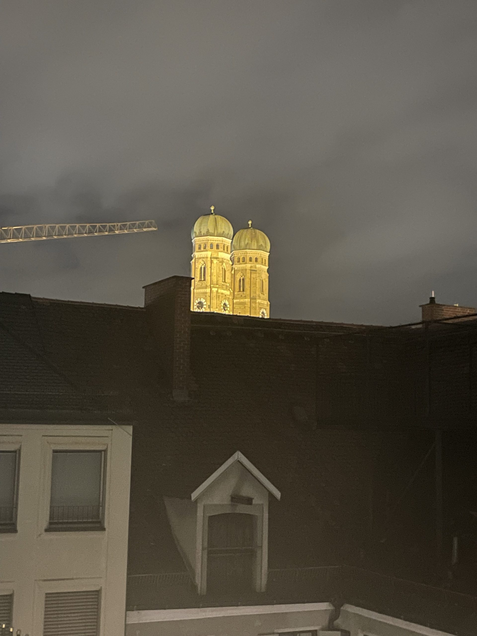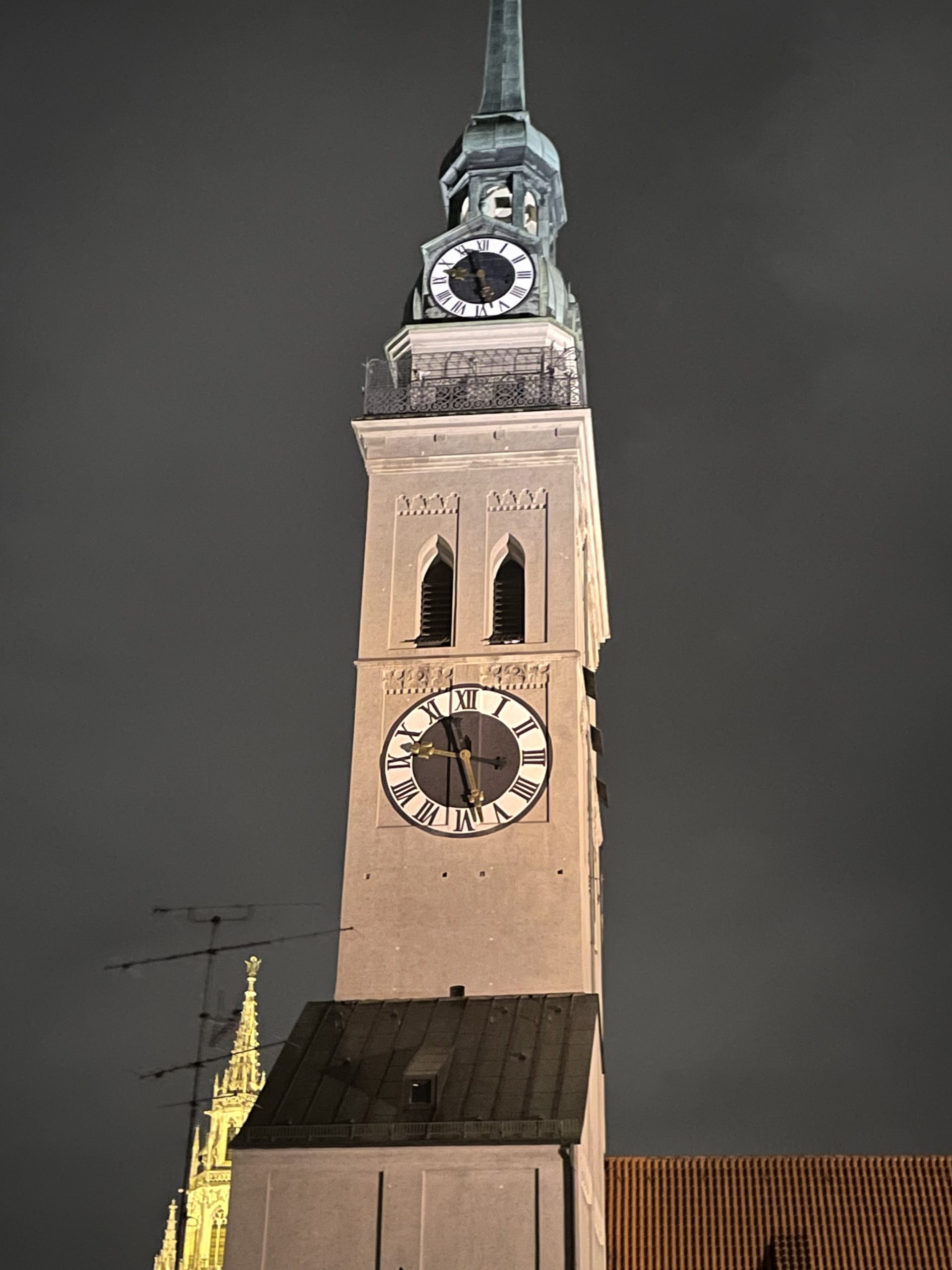 Der Turm des Alten Peters und der Münchner Frauenkirche liegen am Abend zum Greifen nach