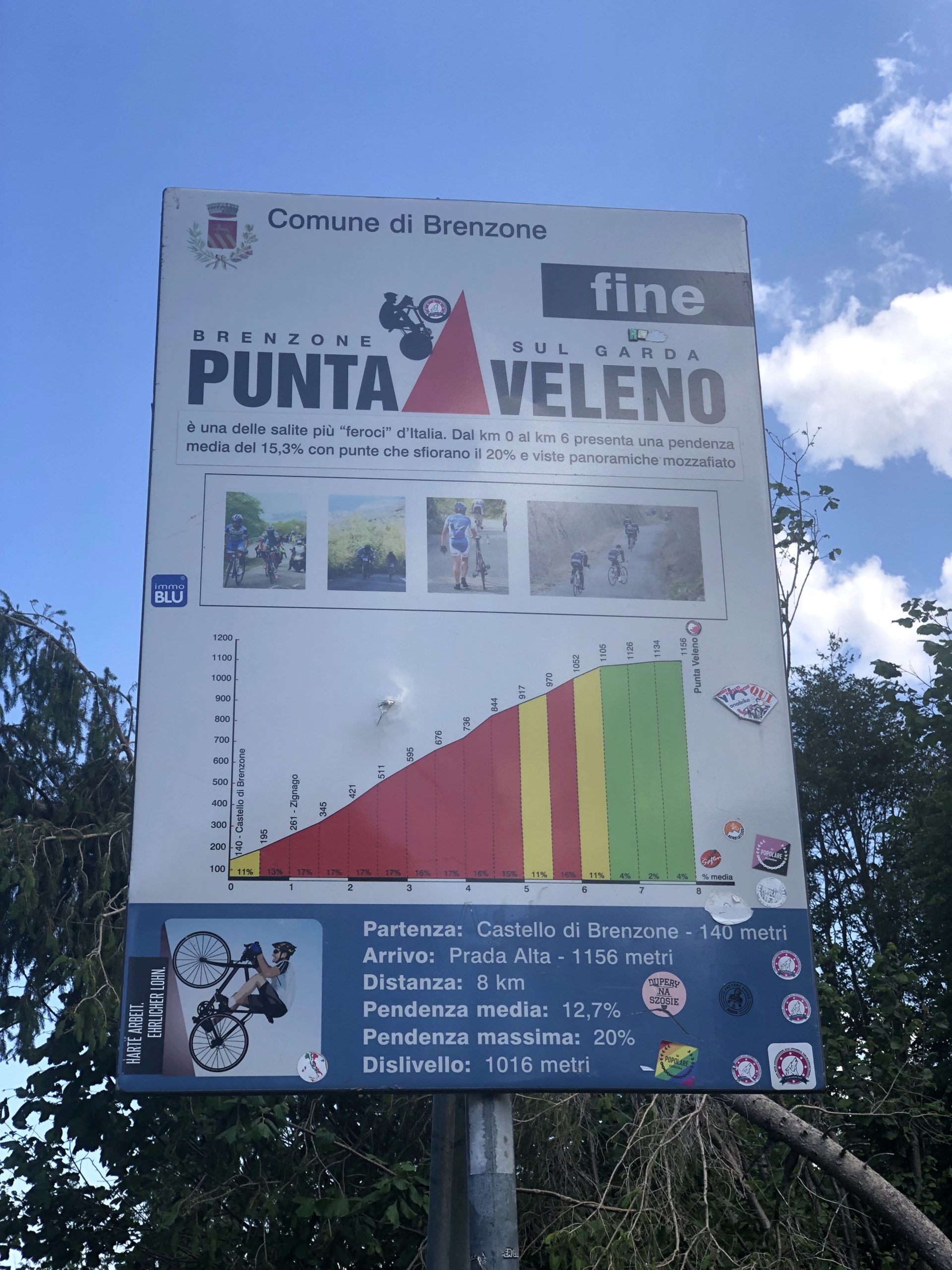 Eine schwierige Strecke, die vom See hoch zum Monte Baldo führt. Sie ist auch die Basis für ein anspruchsvolles Rennen von Brenzone sul Garda über den berühmten Aufstieg von Punta Veleno hoch bis Prada. Auf dem Rückweg vom Gipfel runter nach Torre fährt man durch San Zeno di Montagna. Seid gewappnet für eine 15 Kilometer lange Strecke mit 1399 Meter Höhenunterschied. Zwanzig nummerierte Kehrtwenden auf Asphaltstraße. Von Kilometer Nr. 2 bis km Nr. 8 hat der Aufstieg eine durchschnittliche Steigung von 14,6% wobei einige Steigungen bei 20% liegen. Da fragt man sich doch, warum man diese Strecke überhaupt in Angriff nehmen sollte. Punta Veleno ist eine Herausforderung an sich selbst aber am Ende freuen wir uns, daß wir diesen Trip durchgezogen haben. Wenn man dann oben ist, und in Richtung Süden möchte, dann fährt man vom Gipfel der Punta Veleno weiter Richtung Prada und von dort zum See herunter, vorbei an San Zeno di Montagna zurück nach Torre. Oder man fährt andersum und dann von Castelletto di Brenzone zurück zur Fähre in Torre.