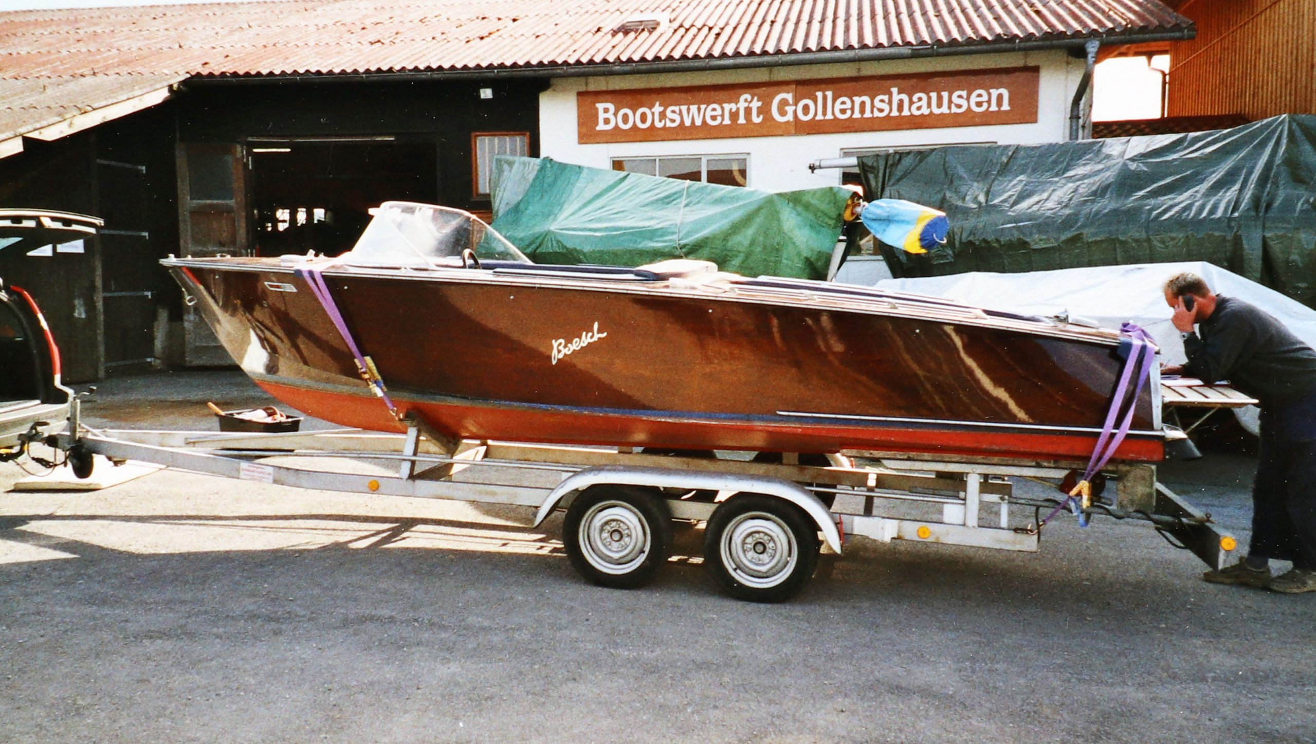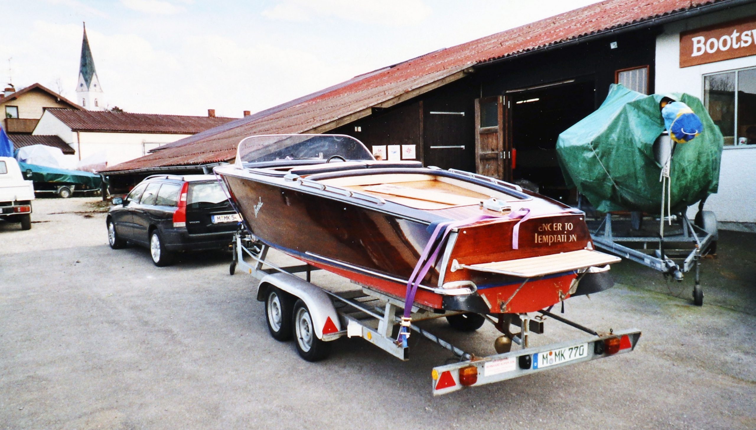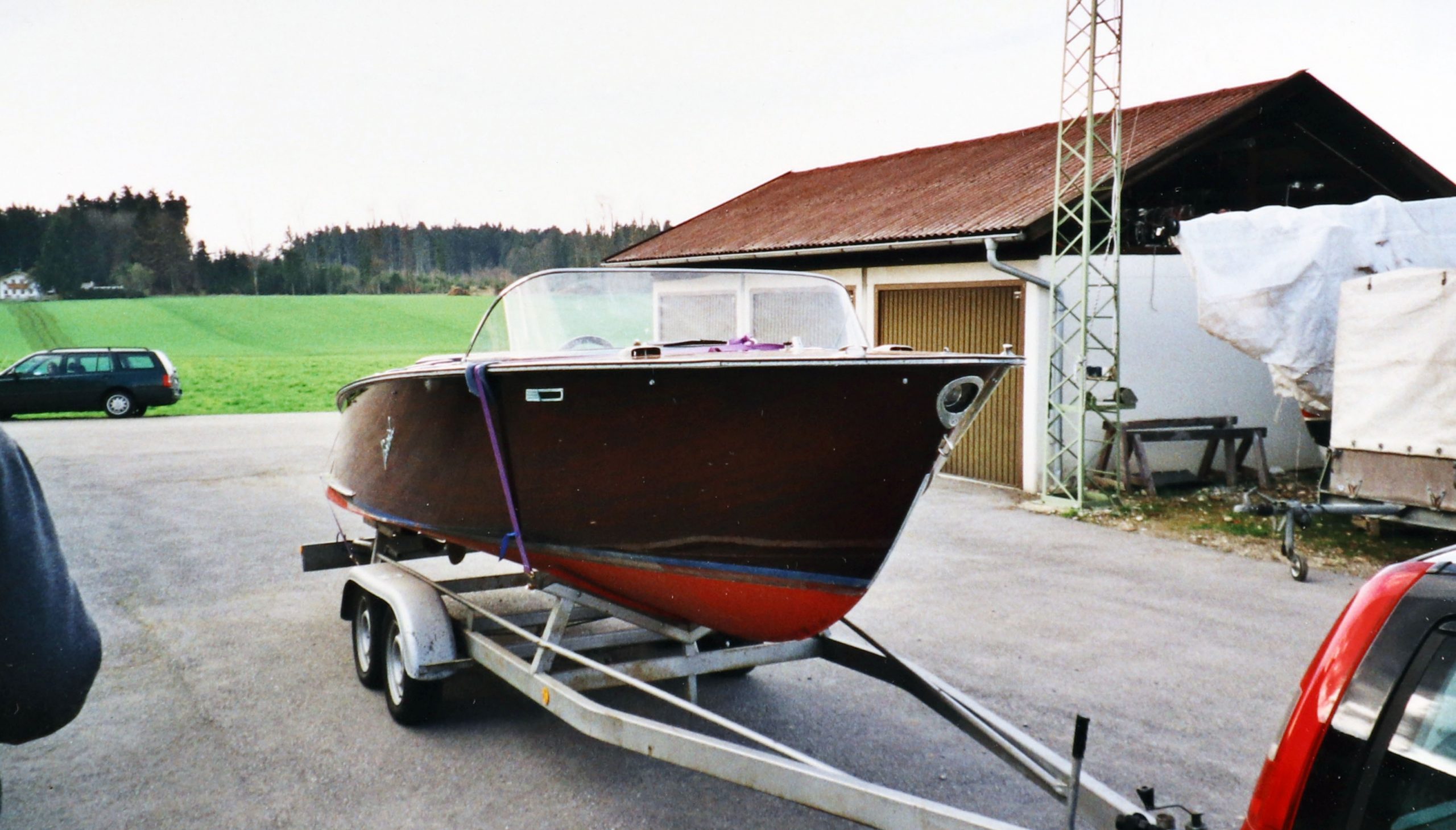 Anlieferung des Boots auf dem Hänger zur Überarbeitung in Gollenshausen am Chiemsee. Zur damaligen Zeit war ich Fahrer eines Volvo T5 Kombi und hatte das Boot am Haken dieses Turbo getriebenen Fronttrieblers. Fürs Winterlager hatte ich eine ungeheizte Scheune in Weng bei Hohenthann gewählt, deren extreme Minusgrade den Motor im kommenden Winter zerstörte
