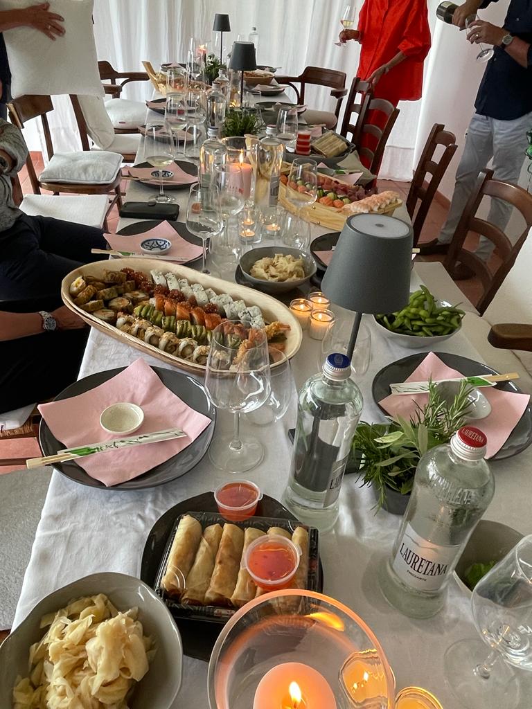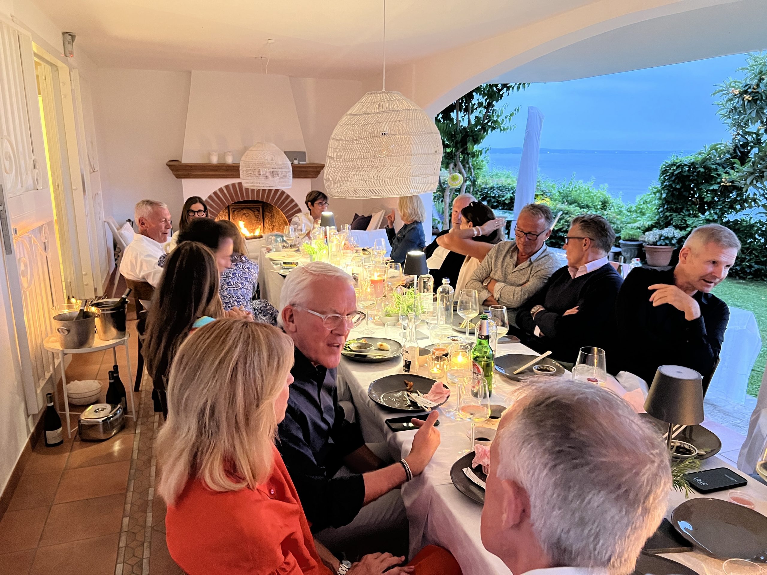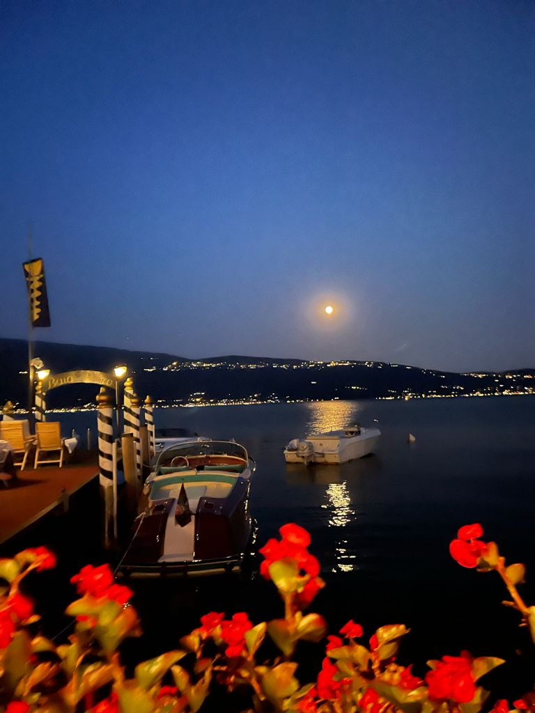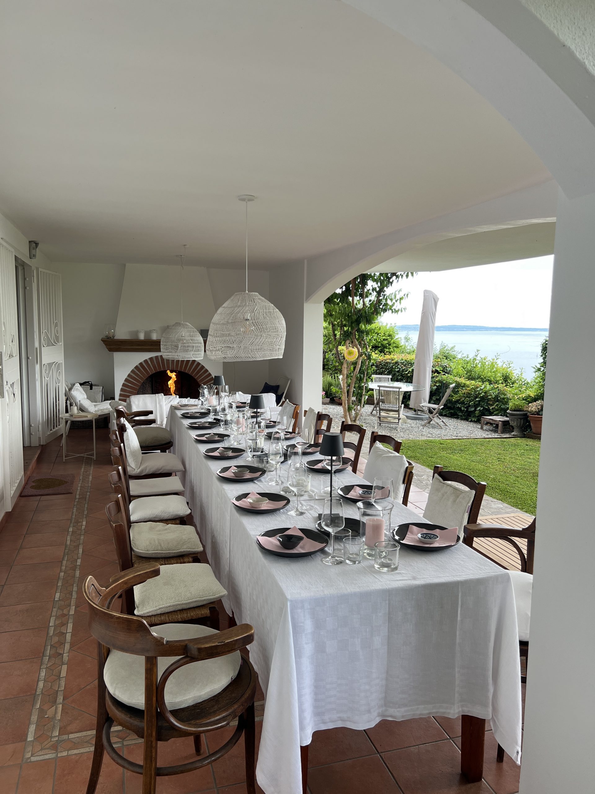 An meinem 64. Geburtstag am Samstag, den 3. Juni 2023 stand um 22.12 Uhr ein 100%iger Vollmond im Kalender und so sollte sich der Abend eigentlich ideal für ein Come Together mit Family & Friends im Garten der Via Panoramica in Gardone-Riviera anbieten. Annette und ich haben uns daher sehr auf einen Schwung überwiegend bewährter Gäste unserer lokalen Gardesana Connection gefreut. Durch ein für diesen Abend für 20 Uhr vorhergesagtes Gewitter mit Starkregen und Temperatursturz sind wir mit trockenen und warmen Sitzplätzen für 20 Gäste gefordert. Bei Oscar - dem Besitzer des nächstgelegenen Lokals Casa Mia in San Michele - besorge ich mir drei zu verbindende Tische für eine sechs Meter lange Tafel und entsprechend viele Stühle und transportiere sie mit der Hilfe von Mathias, Annette und René problemlos in unserem Anhänger zur Via Panoramica und am nächsten Tag wieder zurück. Das Restaurant Brunati in Salò bereitet ein köstliches asiatisches Essen vor, welches ich gemeinsam mit Ettes Schwester Sanne abhole und schon am Vortag habe ich bei unserem Getränke-Lieferanten Gardesana Bevande ausreichend Vorräte für die gesamte Sommersaison eingekauft. Ette übernimmt die Deko und das Tischdecken und so können wir unsere Birthday Party bereits um 19 Uhr starten und in deren Rahmen ein sehr gut sortiertes Brunati Asia Sushi Dinner geniessen. Der Starkregen blieb zum Glück aus - er kam dafür mit voller Wucht am folgenden Abend - bewölkt war es trotzdem und die Bewunderung eines komplett sichtbaren Vollmonds hat sich dadurch erübrigt. Die Temperatur blieb in einem angenehmen Rahmen, wodurch wir auch den gesamten Abend bis spät nachts auf der unteren Terrasse an der langen Tafel vor dem offenen Kamin sitzen bleiben konnten. Man berichtete von vielen guten Gesprächen und durch einige neue Paarungen auch über ganz andere Themen als bei den sonst üblichen Verdächtigen. Ein wunderbarer Geburtstags-Abend, an den ich mich sehr gerne zurück erinnere. Vielen Dank, daß ihr da wart.