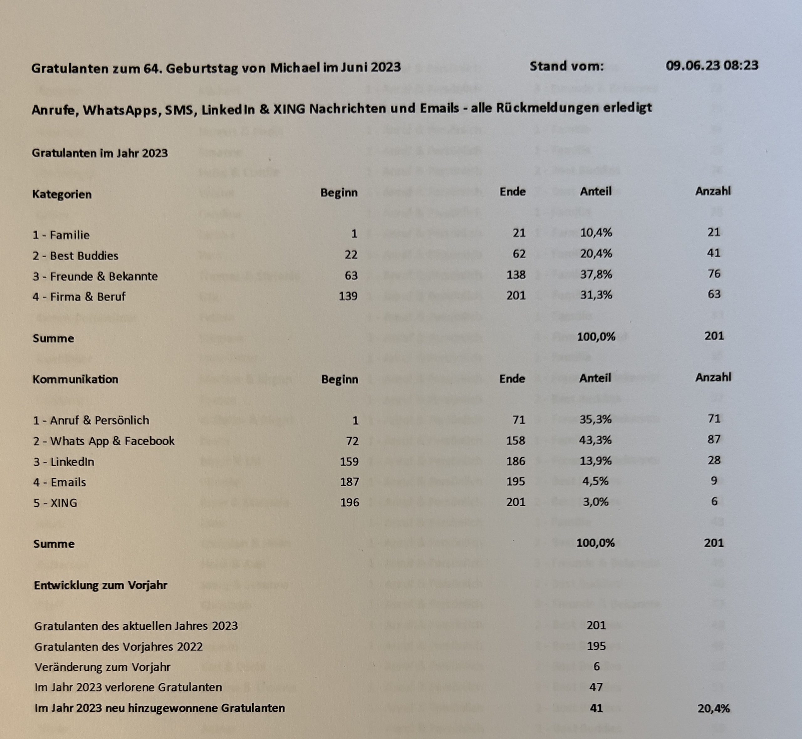 Um die Übersicht beim Bedanken für die Geburtstagsglückwünsche zu behalten, habe ich ich wie in den Jahren zuvor eine Übersicht angefertigt, um nachverfolgen zu können, von wem die Wünsche auf welche Weise bei mir ankamen ... und ob ich mich zeitnah dafür bedankt habe.