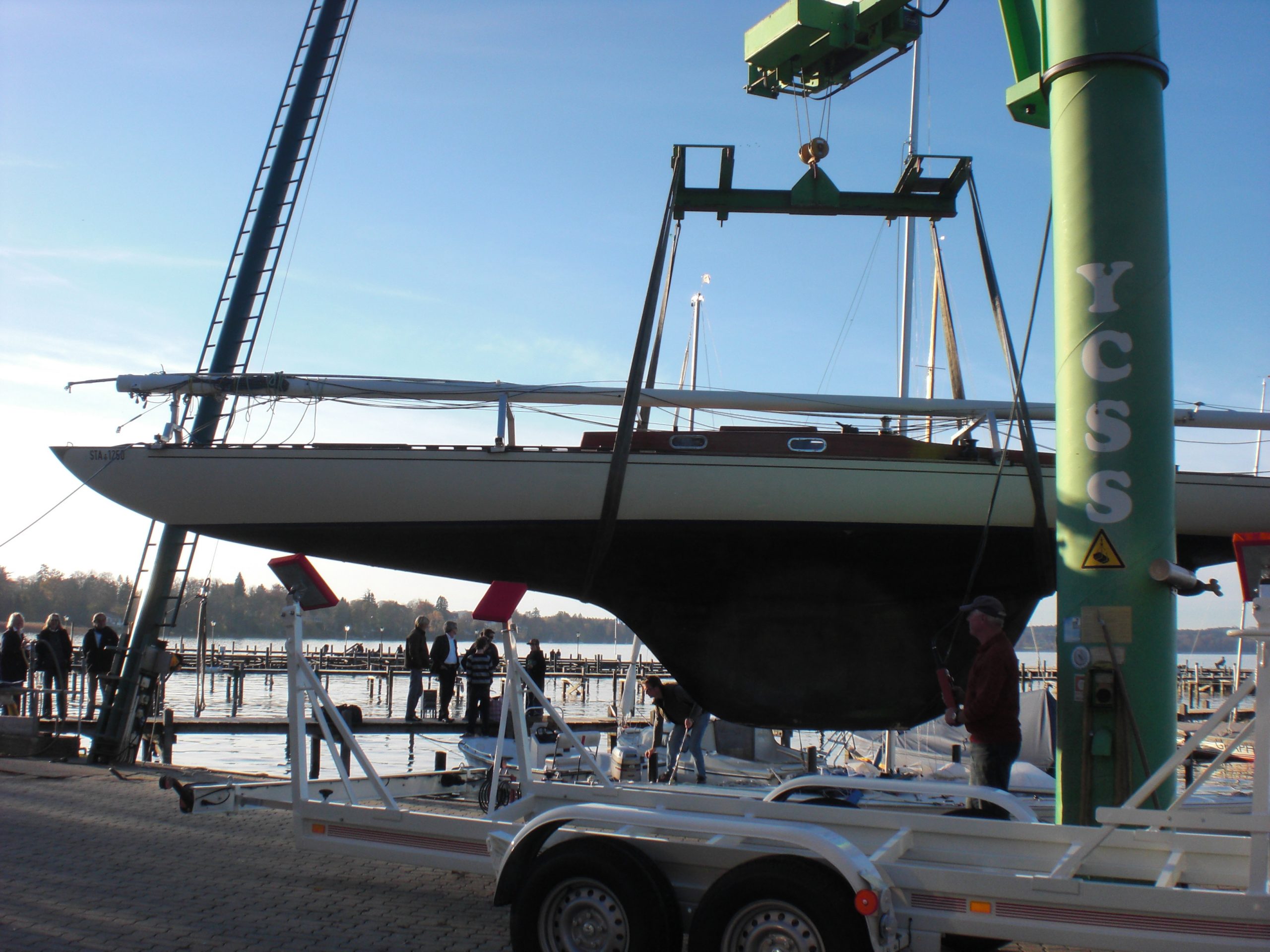 Gründe für einen Bootstransport über Land gibt es viele, sei es der Kauf eines Bootes, eine notwendige Reparatur oder der Wunsch in einem anderen Gewässer zu kreuzen. Bei uns ist es diesmal der Wunsch von Kurt Stampfli - meinem Nachfolger als Eigner unseres 30er Schärenkreuzers Caiman - im Winter in seinem Heimatort im Schweizer Solothurn am Boot zu arbeiten. Die Kosten für den Transport hängen von vielen Faktoren ab. Neben der Größe des Bootes ist die Länge des Transportweges ausschlaggebend. Es kommt auch darauf an, welche Zusatzleistungen notwendig sind. Auch die gewählte Transportart hat Einfluss auf den Preis. Unter Umständen berechnet der Spediteur zwischen 0,30 und 0,60 Euro für Leerfahrten. Dies ist üblich, wenn feste Termine gewünscht sind und Fahrzeuge ohne zusätzliche Fracht zum Standort oder vom Lieferort fahren muss. Für Boote mit einer Breite zwischen 2,50 Metern und drei Metern, die zwischen drei Tonnen und fünf Tonnen wiegen, sind Zuschläge von 0,50 bis 1,20 Euro zu erwarten. Für schwerere und breitere Boote gelten die Regeln des Schwertransportes. Der Spediteur muss zuvor die Strecke abfahren um Engstellen aufzuspüren. Auch sind Behörden zu verständigen, wenn Sperrungen notwendig sind. Zusätzlich sind Begleitfahrzeuge erforderlich. Die Kosten können daher auch bei einer kurzen Strecke auf weit über 5.000 Euro ansteigen. Es gibt keine Vorschriften, welche Qualifikationen ein Transporteur braucht, um eine Yacht zu transportieren. Daher darf jeder, der ein entsprechend großes Fahrzeug hat, den Transport durchführen. Aber Boote sind empfindlicher als Gitterboxen. Es bedarf einiger Erfahrung diese zu Laden, beim Transport zu sichern und zu Entladen. Daher sollten nur Unternehmen, die Erfahrung haben, einen offenen oder geschlossenen Transport durchführen. Dies gilt auch für den Flachbetttransport. Checkliste für den Transport eines Bootes. Bei der Planung des Transports sind Größe und Gewicht des Bootes erfassen, eventuelle Besonderheiten notieren, den genauen Stand- und Zielort ermitteln, Einzelheiten der Verladung festhalten, die gewünschte Transportart festlegen und den Termin bestimmen. Danach gilt es ein Transportunternehmen zu finden und en Transport mit genauen Angaben ausschreiben und dannAngebote, Qualifikationen und Versicherungsschutz prüfen. Zudem der Transport in Auftrag zu geben und notwendige Vorkehrungen am Stand- und am Zielort treffen. Nach dem Bootstransport sind das Boot in Empfang nehmen, auf Schäden zu achten und wenn notwendig, sofort reklamieren. Man kann es sich allerdinga auch einfacher machen, und wie Kurt einen passenden Leichtgewicht Trailer bauen zu lassen, wodurch man bei unter 3.5 Tonnen Gewicht zu bleiben. Nach unserer Wasserski Runde ging es dann nach St. Eurach zu einer kurzen Golfrunde und einem Abendessen im Clubrestaurant