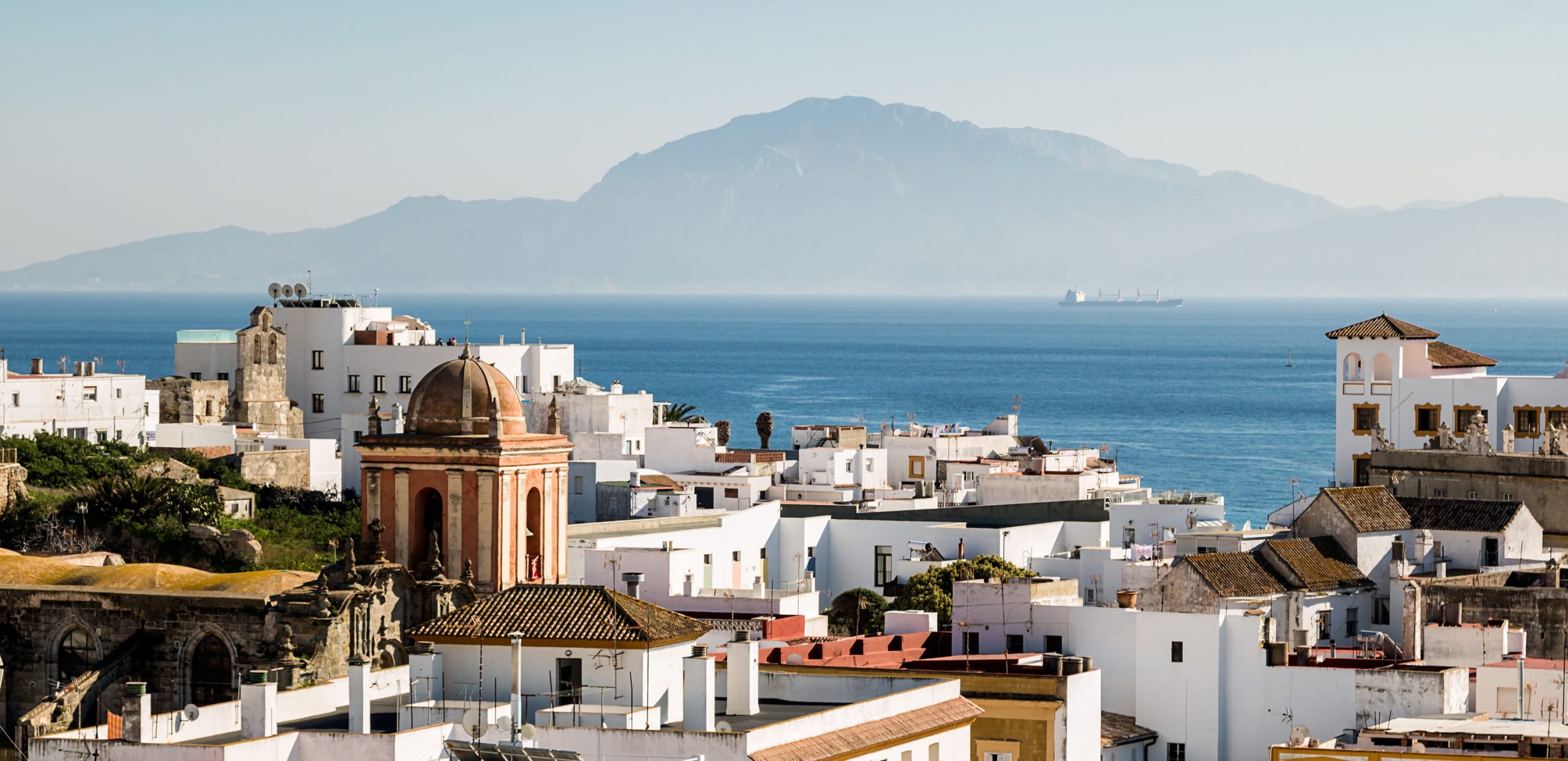 Am westlichen Rand befindet sich die Punta de Tarifa, der südlichste Punkt des europäischen Festlandes auf der unmittelbar vorgelagerten Isla de Las Palomas. Die Entfernung nach Marokko, und damit dem afrikanischen Kontinent, beträgt hier nur 14 km. Nirgendwo sonst liegen Europa und Afrika näher zueinander. Fähren, darunter auch Hochgeschwindigkeits-Katamarane, verkehren mehrmals täglich zwischen Tarifa und Tanger.