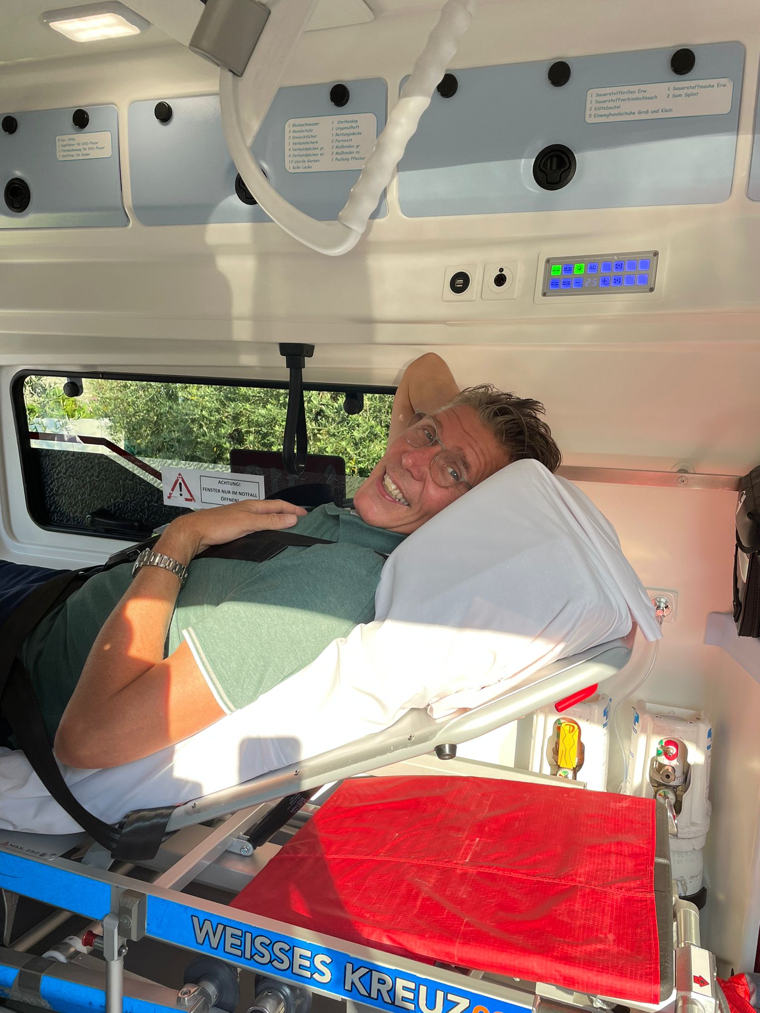 Mathias - der arme Kerl - hatte sich beim Wasserskifahren den hinteren Oberschenkelmuskel abgerissen und musste sich im Liegendtransport vom Italienischen Weissen Kreuz von San Felice in 11 Stunden nach Düsseldorf fahren lassen. Die OP verlief zum Glück gut und wir wünschen Ihm eine gute Besserung und daß er bald wieder fit ist
