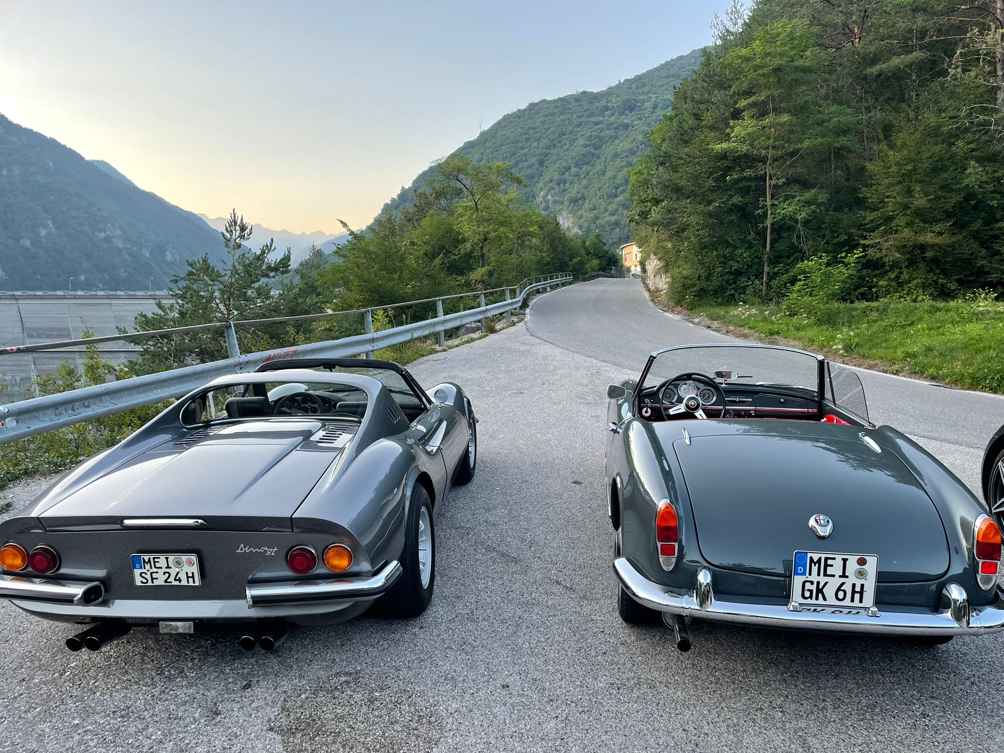Bei einem gemeinsamen Besuch mit Michael Weiß im neuen Haus von Fritz und Gaby Kozka - Fritz war in erster Ehe mit einer Verwandten von Michael verheiratet - haben wir nicht nur das herrliche Anwesen, sondern auch die dort geparkten schönen Autos bewundert. Mit den beiden Grauen - dem Ferrari Dino und dem Alfa - haben Gaby und Fritz einen Ausflug zum Lago Valvestino gemacht