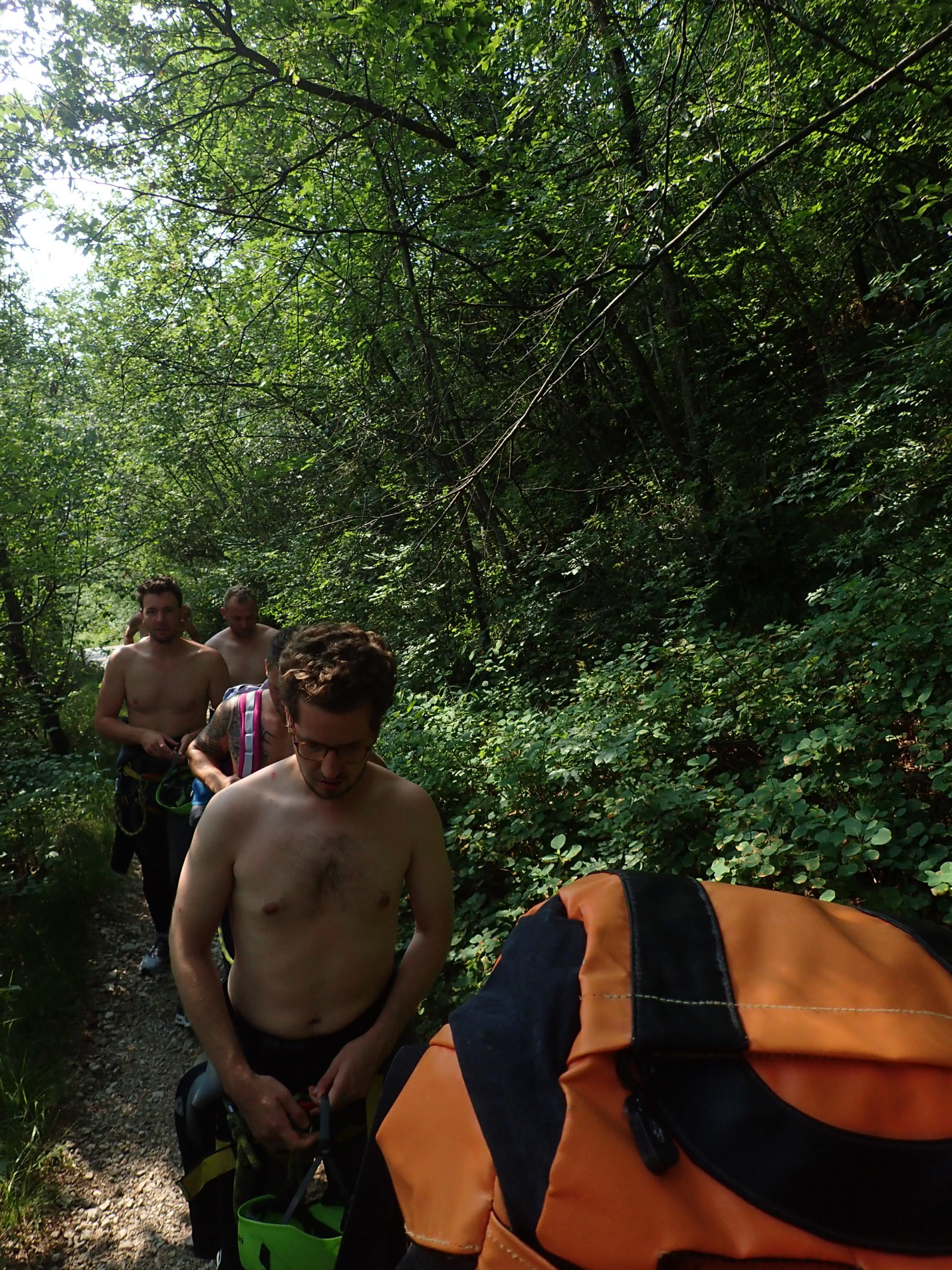 Nachdem ich zu Anfang der Woche bereits eine Canyoing Tour mit Max genacht habe, legen wir am Sonntag gemeinsam mit Paul noch einmal nach und buchen eine noch längere und schwierigere Tour am Wildbach Vione nördlich von Piovere unterhalb von Tignale. Unter Canyoning versteht man das Begehen einer Schlucht von oben nach unten in den unterschiedlichsten Varianten. Durch Abseilen, Abklettern, Springen, Rutschen, Schwimmen und manchmal sogar Tauchen gelangt man in geeigneter Ausrüstung durch die Schluchten. Als Erlebnissportart etablierte sich Canyoning Ende der 1990er Jahre. Canyoning erfordert ein hohes Maß an alpin- und wassertechnischer Qualifikation. Ist man erst einmal in eine Tour eingestiegen, ist ein Rückzug vor Ende der Tour oft nicht mehr möglich. Diese Sportart sollte von Anfängern nur unter kundiger Anleitung durchgeführt werden. Bei den meisten Touren steht das gemeinsame Naturerlebnis im Vordergrund.