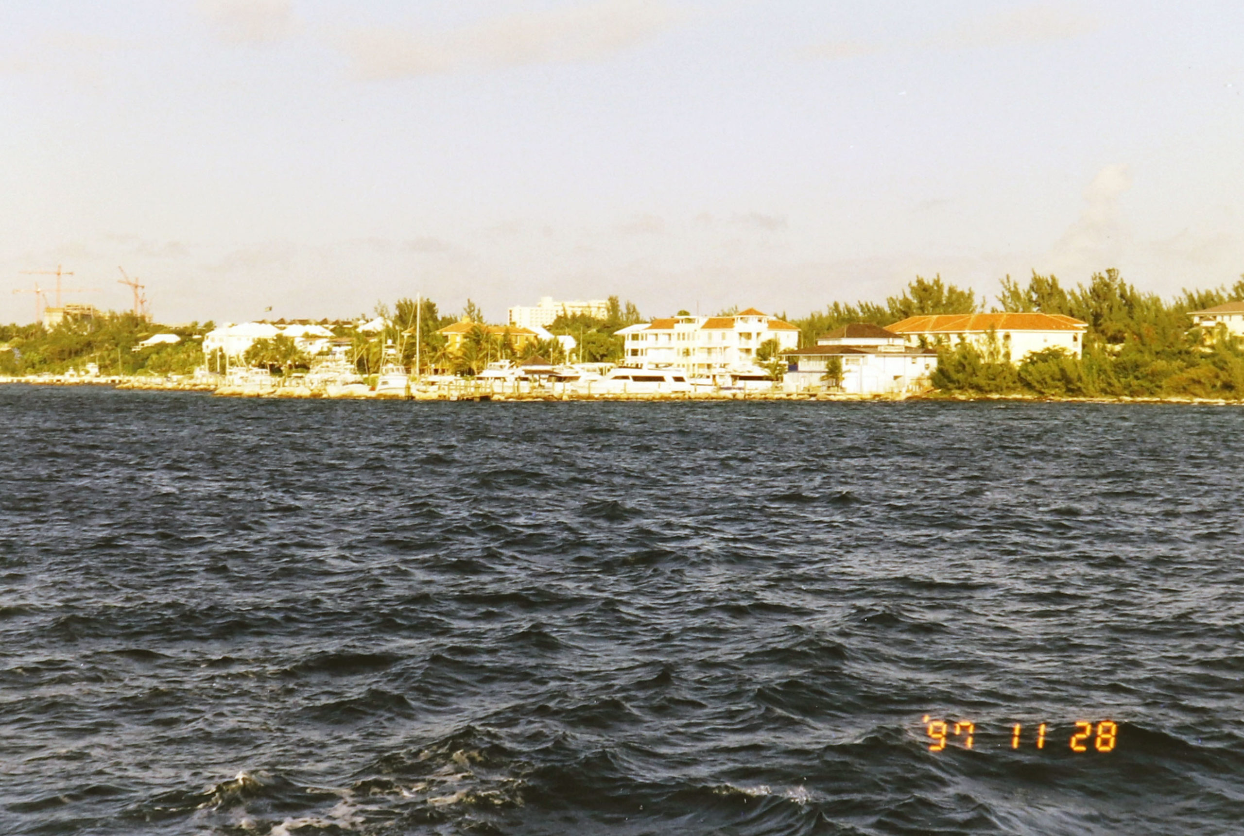 Bye Bye ... Paradise Island mit dem PHC im Kielwasser. Es geht los, denn die Karibik lockt. Die Gewässer der Bahama Banks sind sehr flach, auf der Great Bahama Bank im Allgemeinen nicht tiefer als 25 Meter. Erst an den Abhängen ihrer Ränder, so zum Beispiel an der Tongue of the Ocean - dem Meeresgraben in der Great Bahama Bank - werden die Gewässer bis über 2.000 Meter tief, wobei es an diesen Stellen dann extrem steil in die Tiefe gehen kann