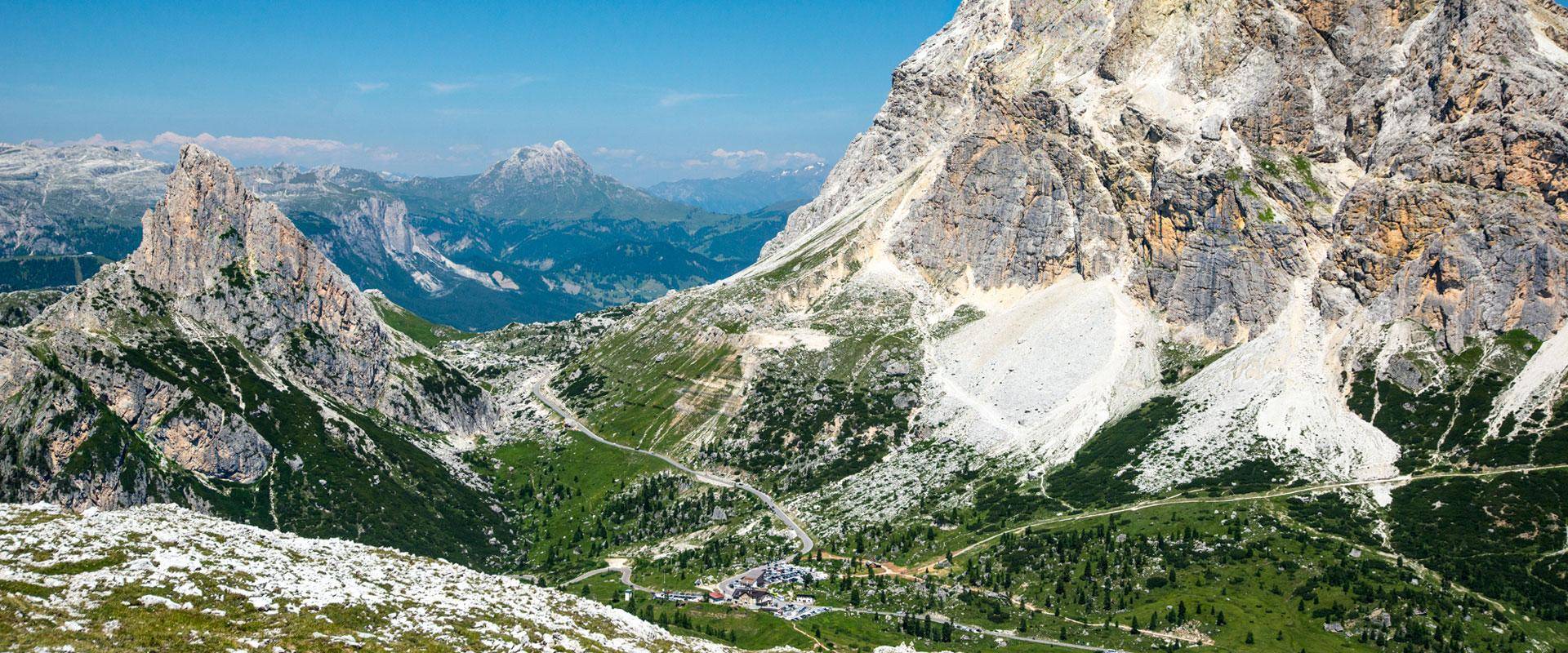 Er liegt somit innerhalb des ladinischen Gebiets. Der Pass ist ein breiter, mit Felsbrocken übersäter Sattel südwestlich des Dolomiten-Hauptmassivs der Tofane; diesem vorgelagert ist der Felsstock des Lagazuoi, der die Sicht auf sie verdeckt. Im Westen ist die vergletscherte Marmolata zu sehen, und im Süden erheben sich der Monte Averau in der Nuvolaugruppe sowie die fünf Zacken der Cinque Torri.