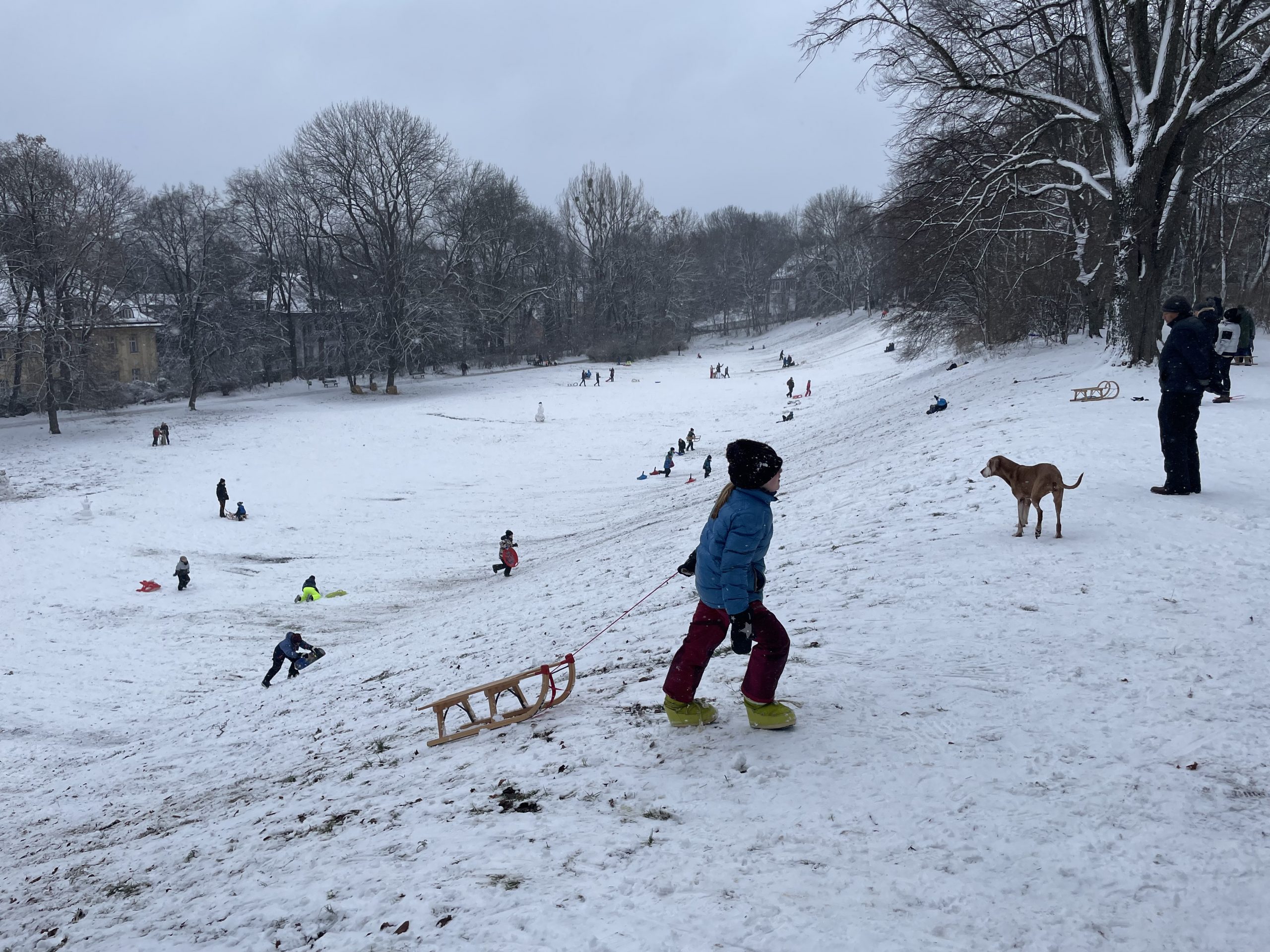 Auch Wetter technisch war es übrigens ein recht feuchtes und Niederschlag reiches Wochenende und in Bogenhausen fiel so viel Schnee, daß zahlreiche Kinder begeistert zur Königswiese strömten, um hier Schlitten zu fahren. Auch Tati beobachtet die Aktivitäten wohlwollend interessiert ...