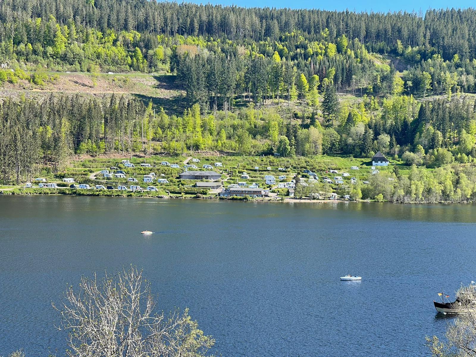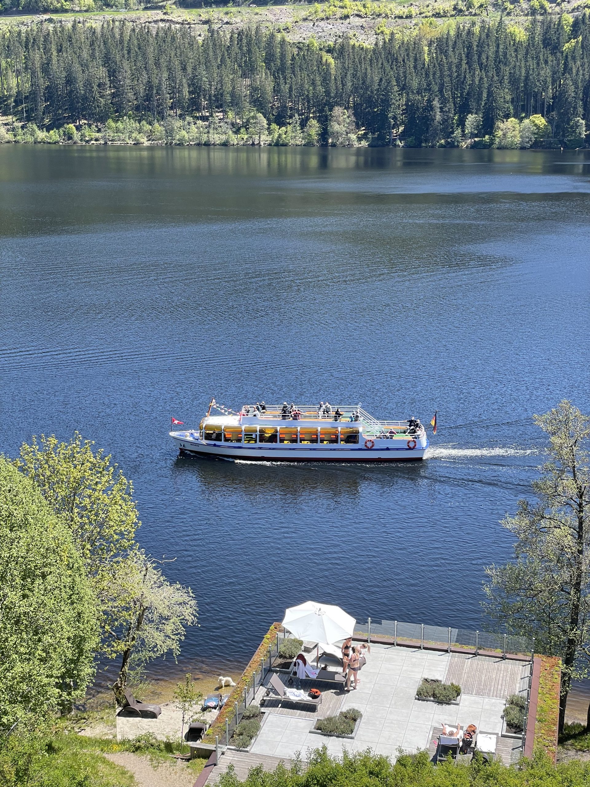 Blick aus dem Alemannenhof auf den Titisee und das ständig hierauf kreisende Fahrgastschiff