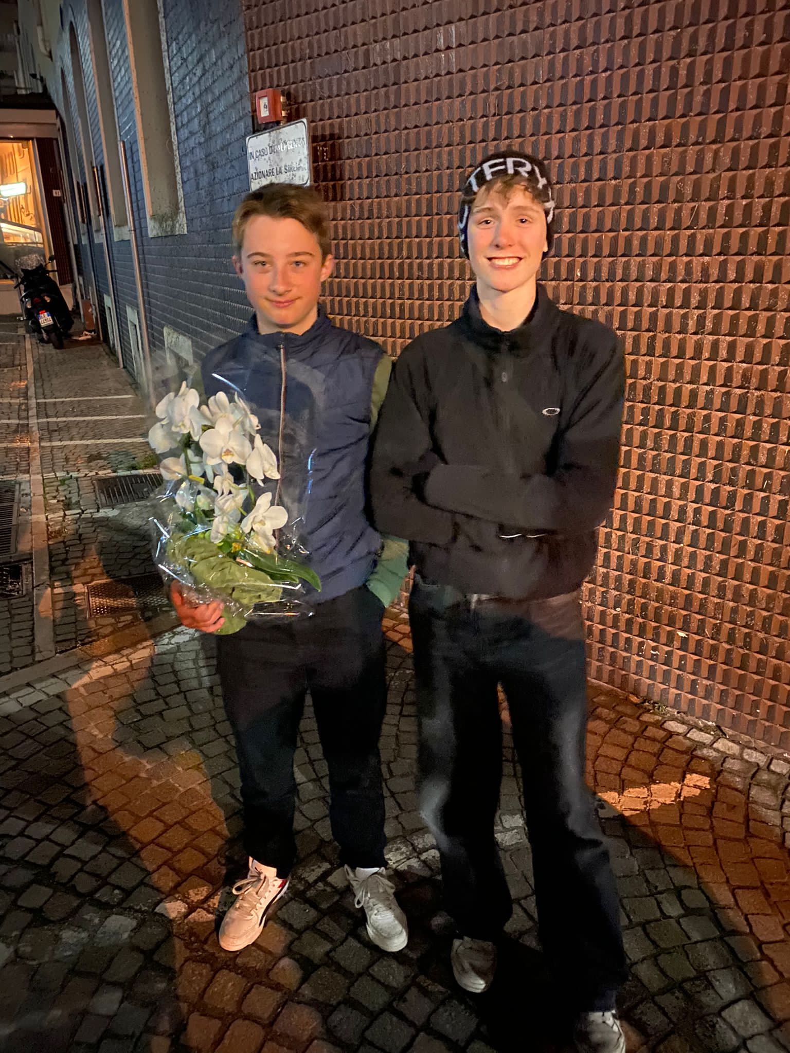 Leon und eine Hälfte der Gehrckens Twins mit einem Geschenk für Heike