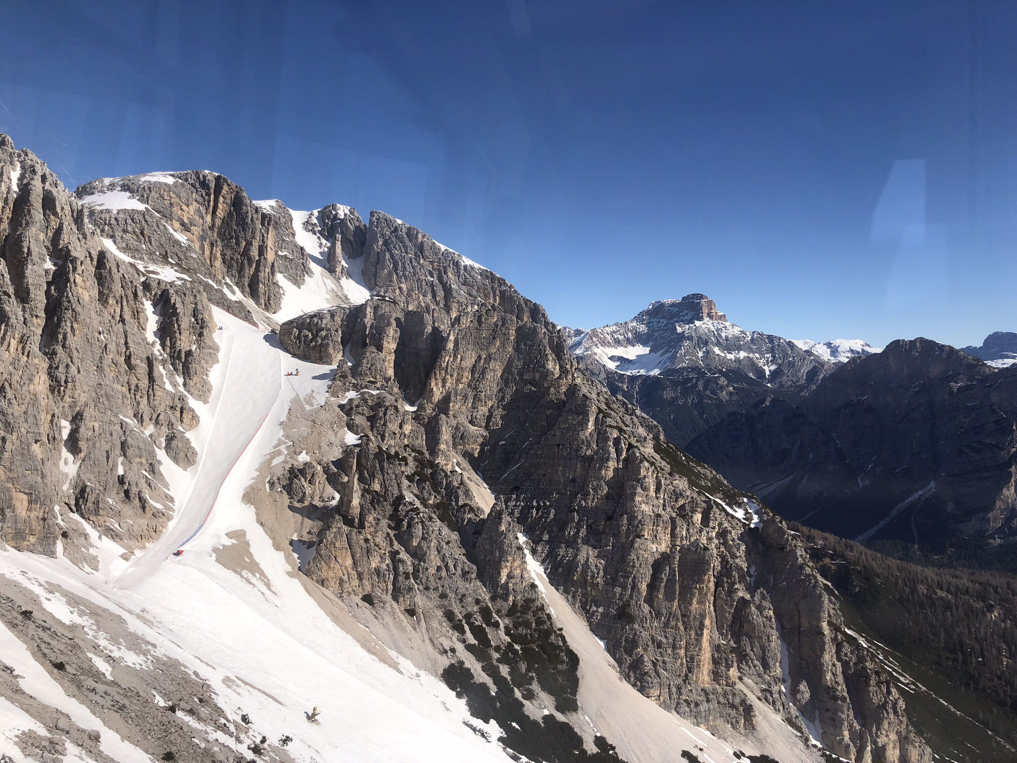 Die steilen Schneisen von der Tofana ins Tal sind jedoch noch optimal präpariert