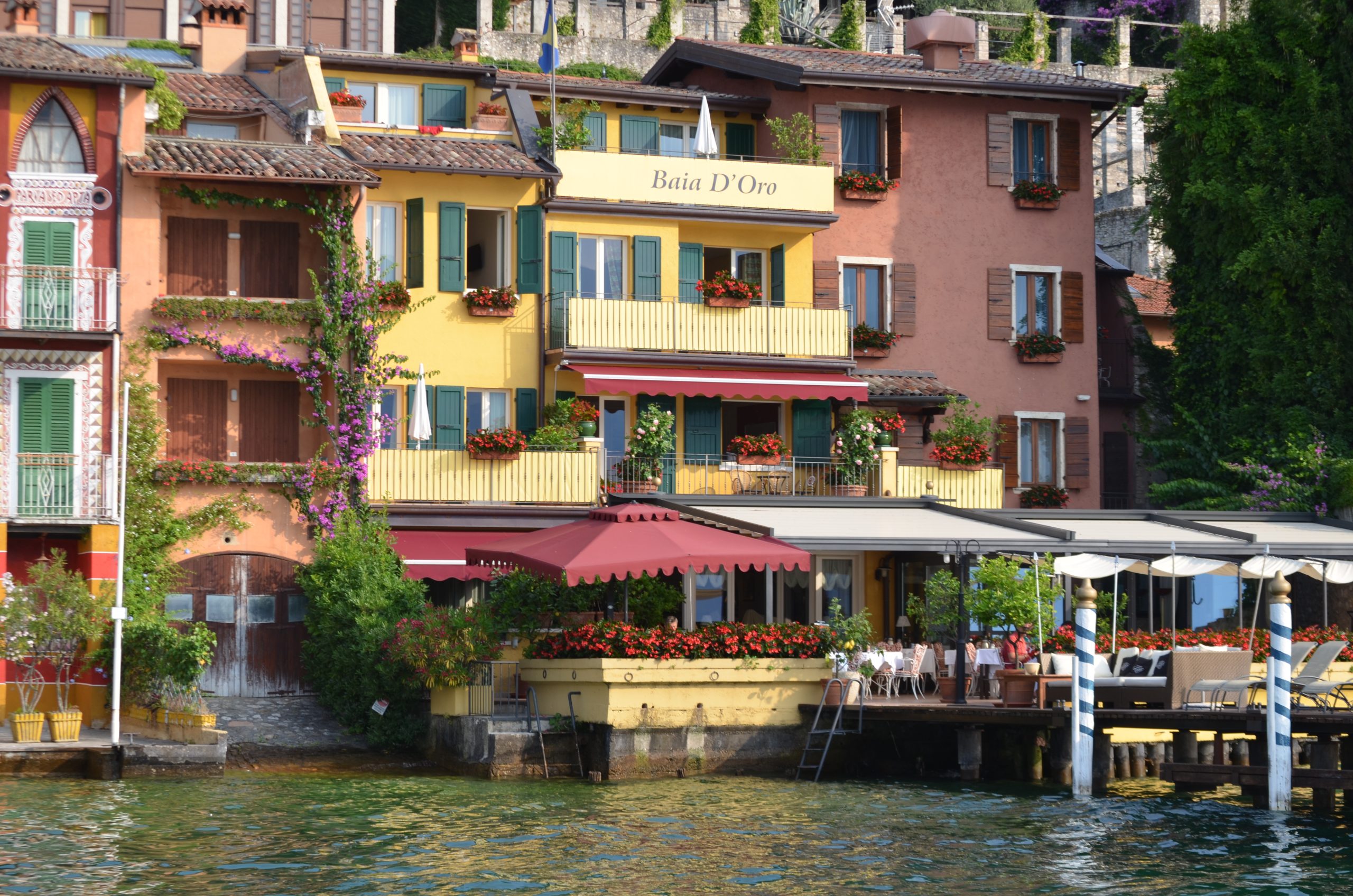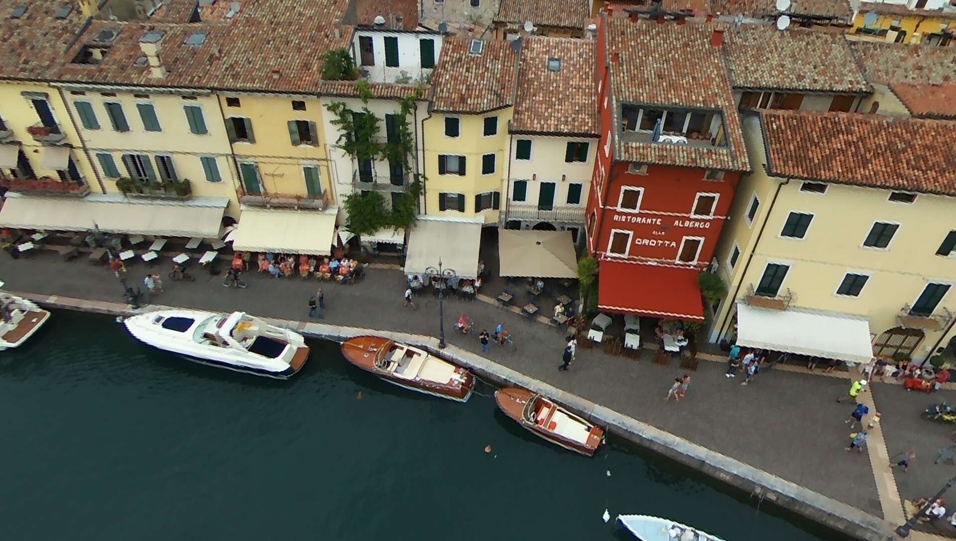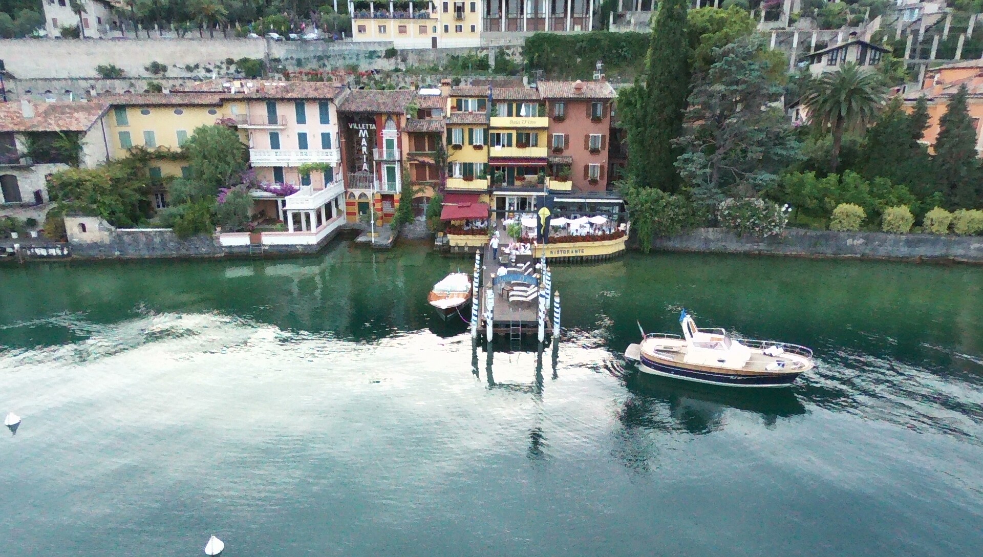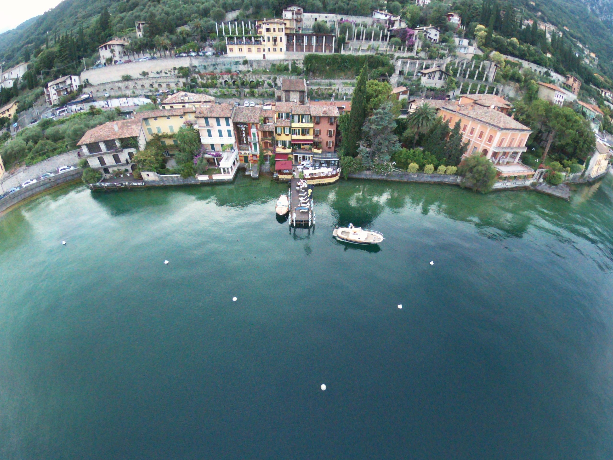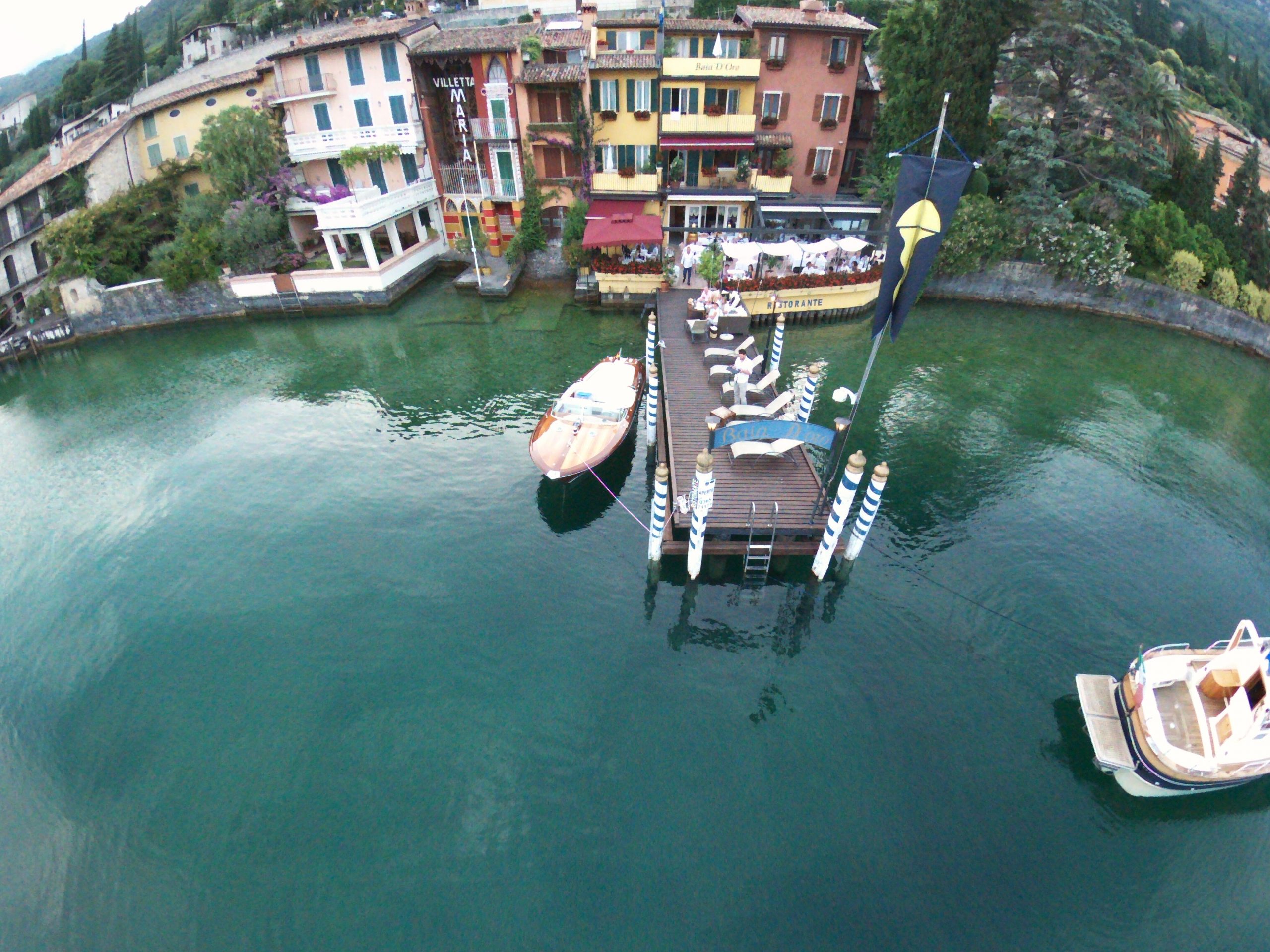 Hier sehen wir das Ristorante Baia d´Oro in Gargnano aus der Luft ... außer uns ist nur das Boot von Gabriele Terzi zu sehen