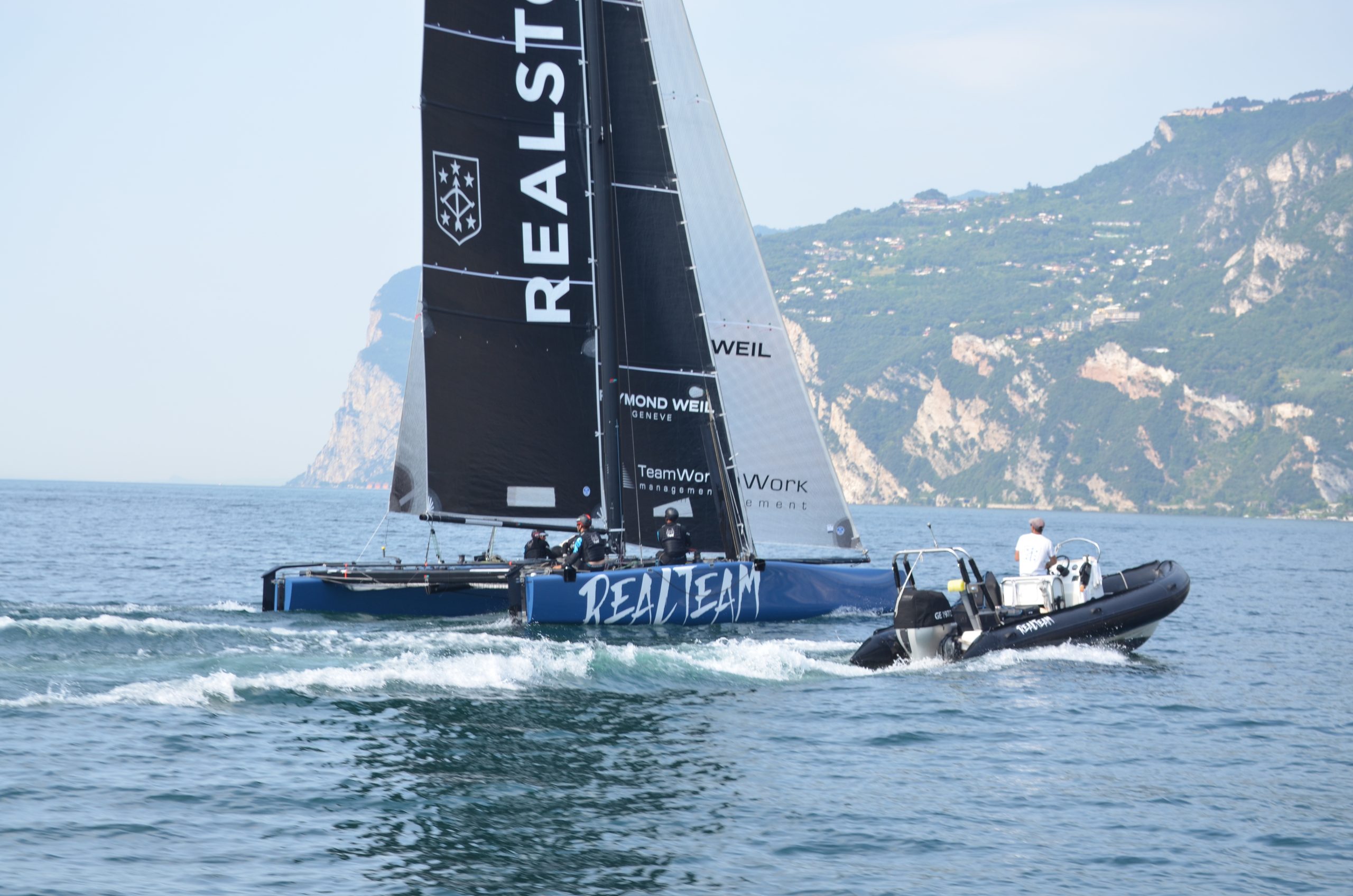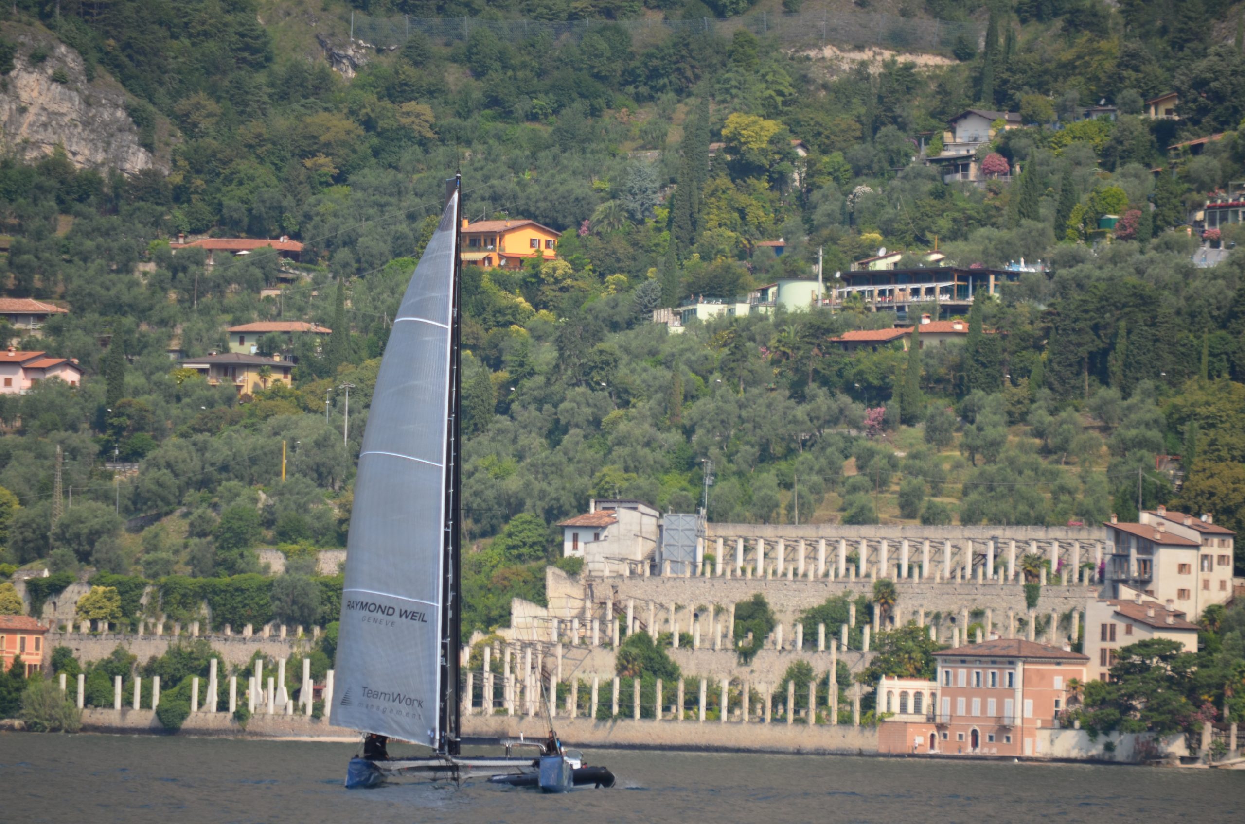 Vor Gargnano beobachten wir bei einem Bootsausflug in den Norden schnelle Katamarane beim Training für die anstehenden Regatten