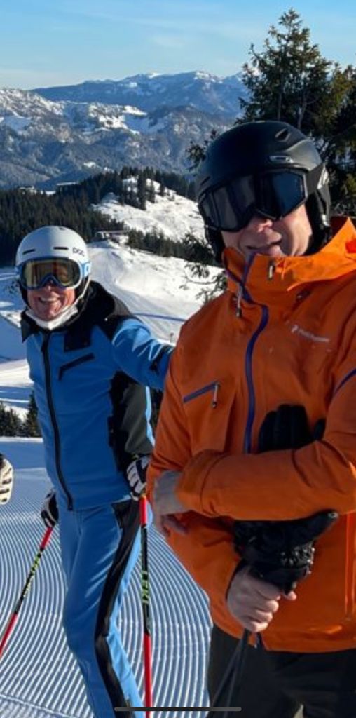 Thomas in seiner chicen orangenen Peak Performance Jacke und seiner noch viel chiceren neuen olivfarbenen Bogner Hose mit orangenem Streifen