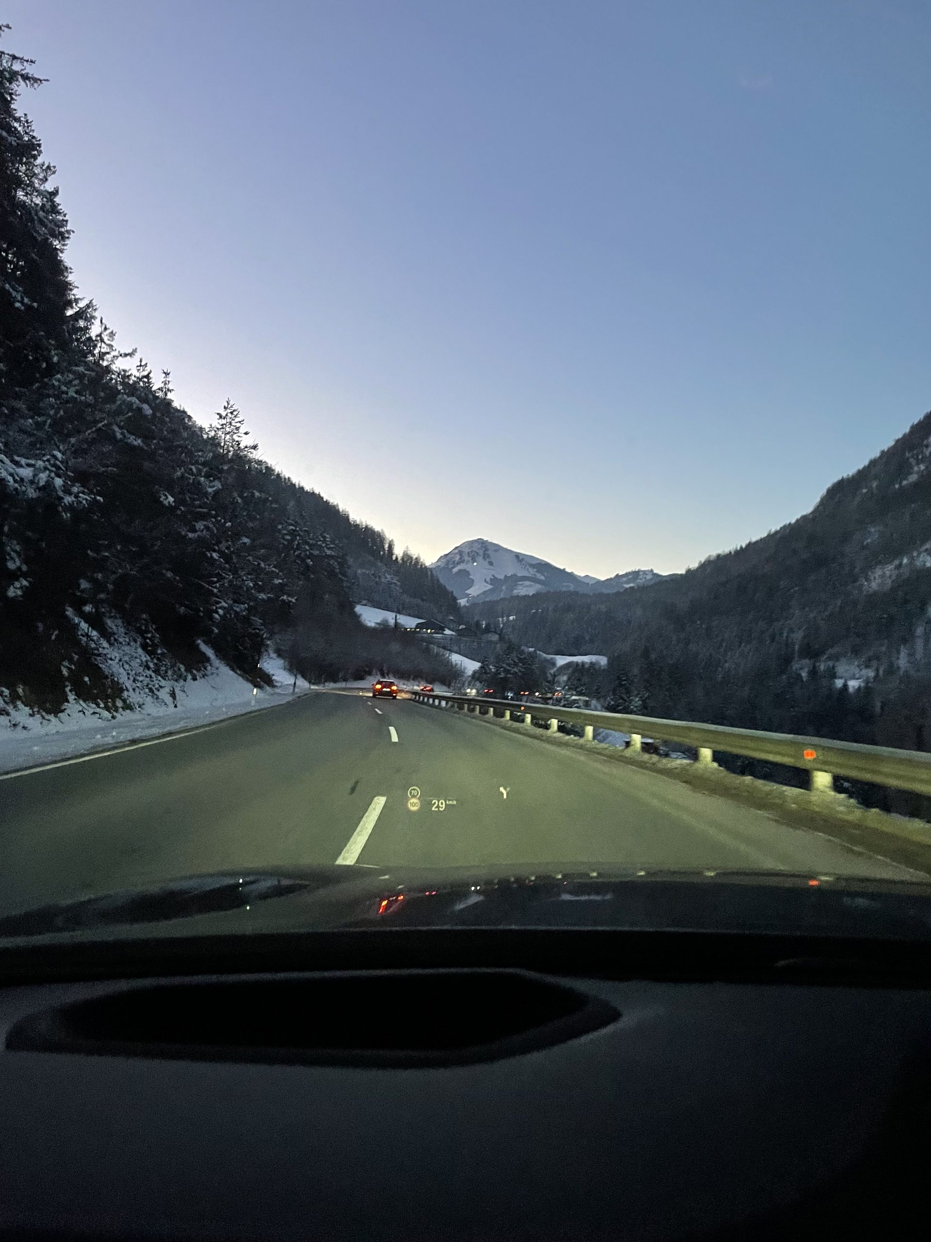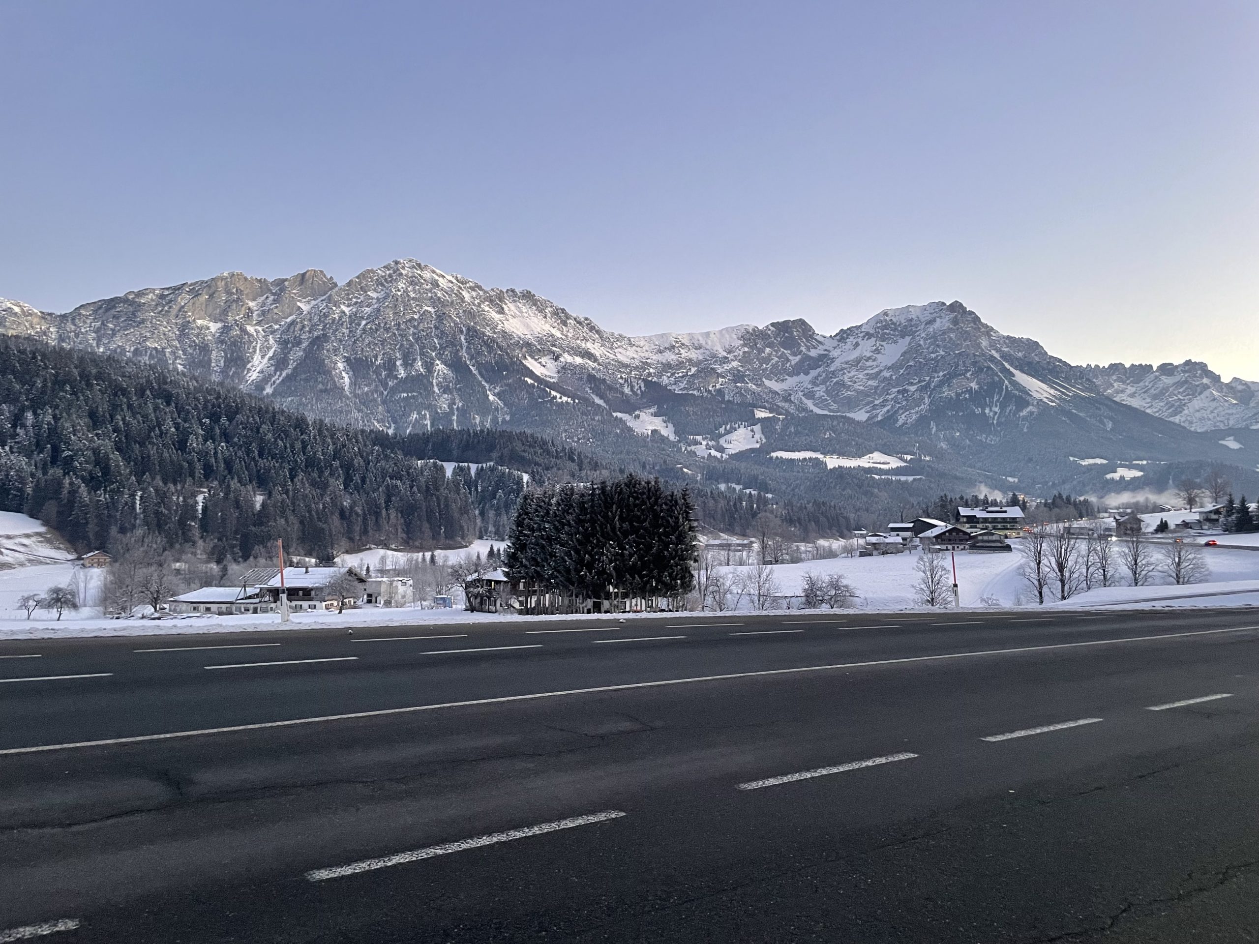 Um diese Zeit ist der Verkehr auf der Eiberg Bundesstraße zwischen Kufstein und Scheffau noch überschaubar ... im Hintergrund leuchtet bereits die von der Sonne angestrahlte Hohe Salve oberhalb von Söll