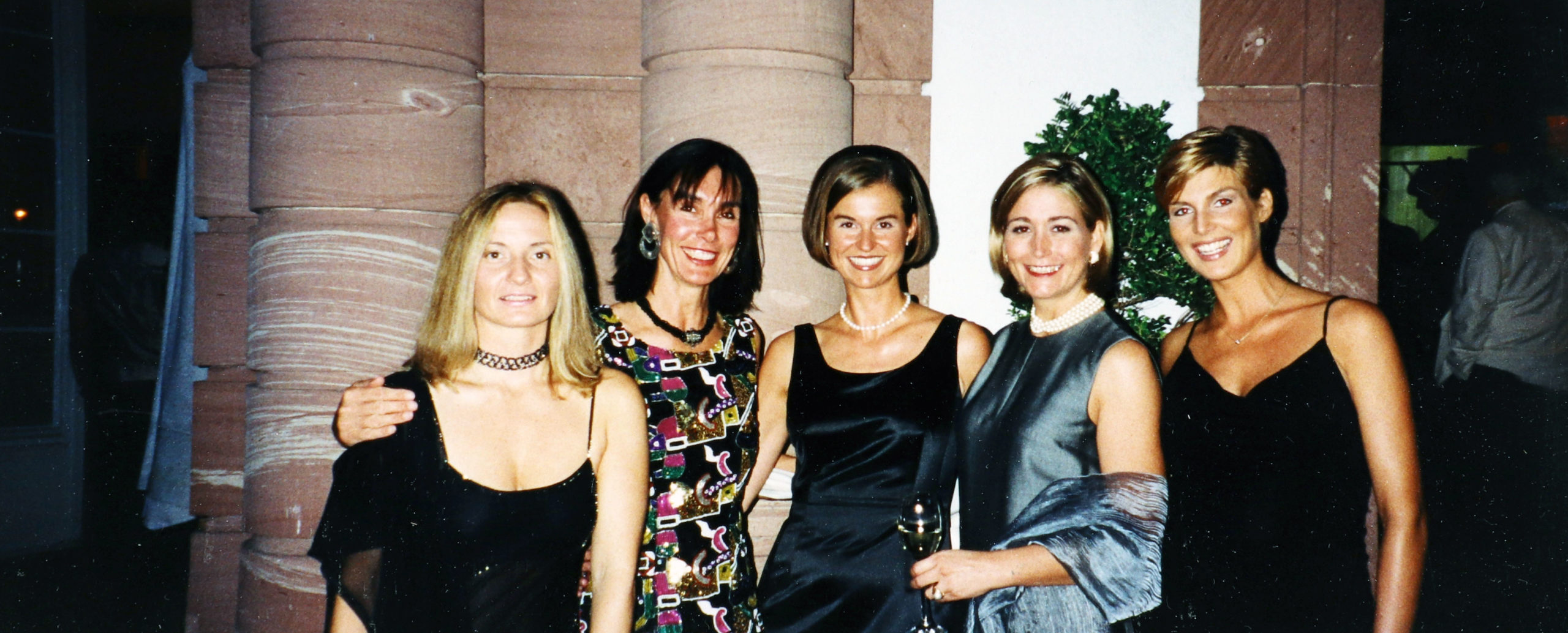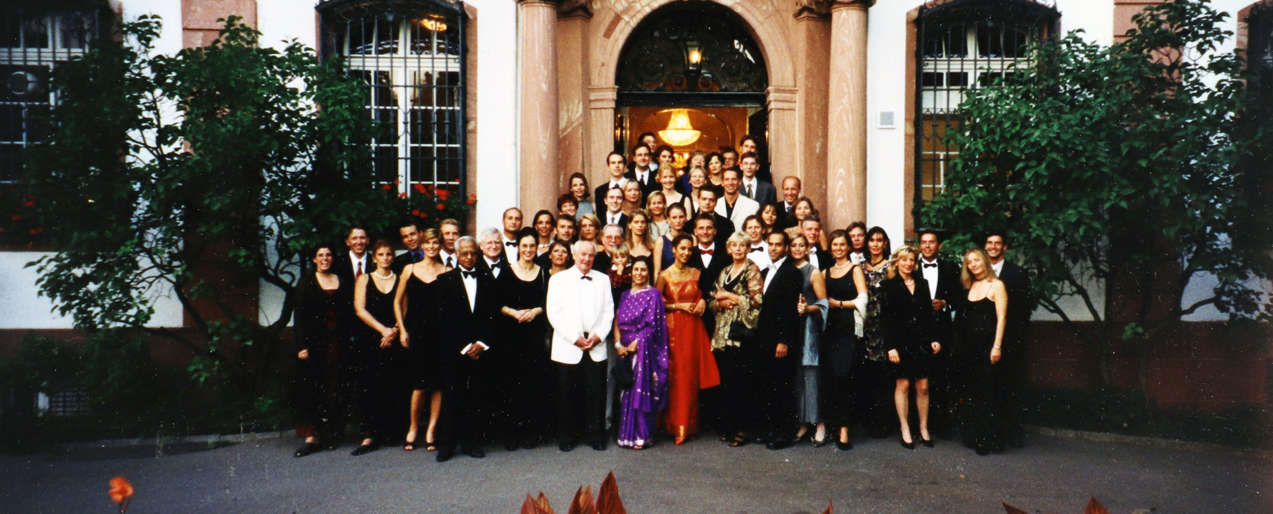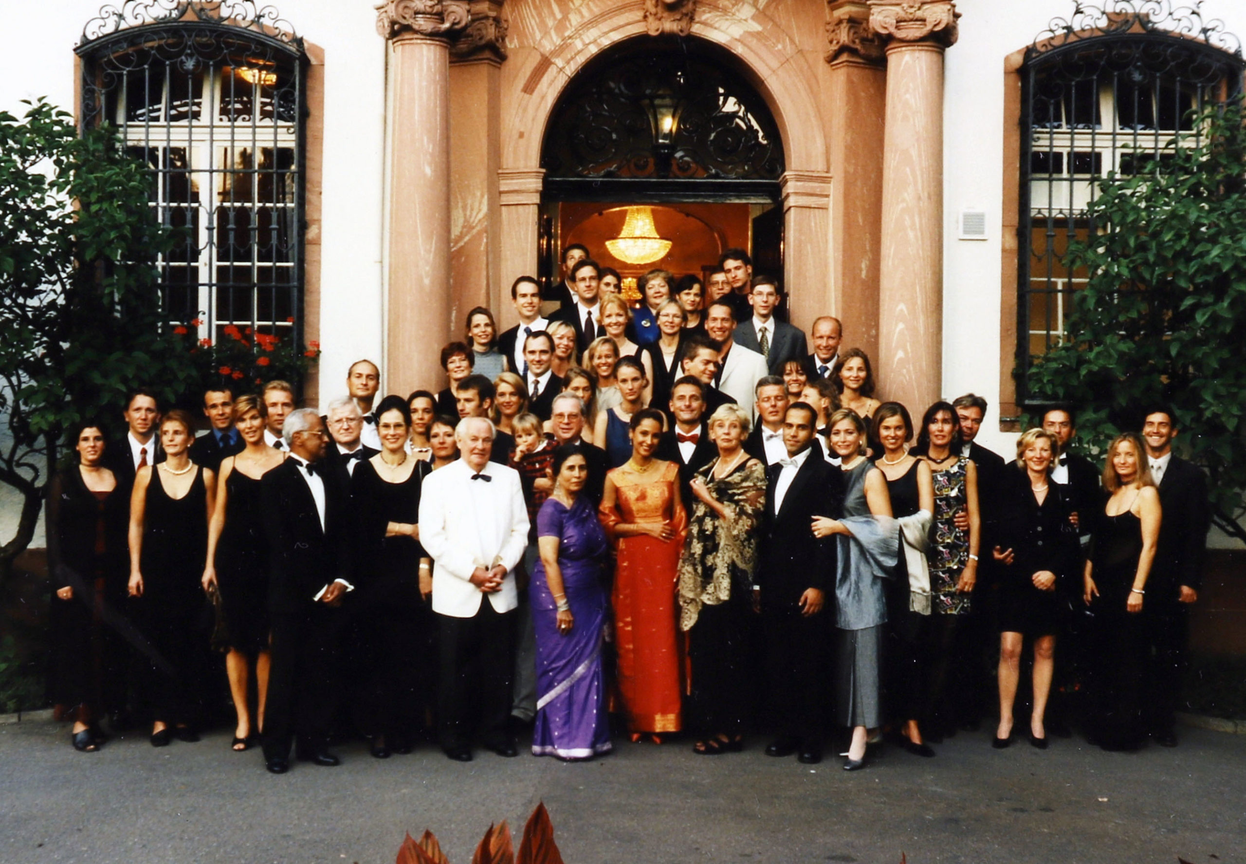 Gruppenbild, die Zweite. Die komplette Hochzeitsgesellschaft nimmt Aufstellung auf der eleganten Freitreppe der Villa Merton des Frankfurter Union Clubs.