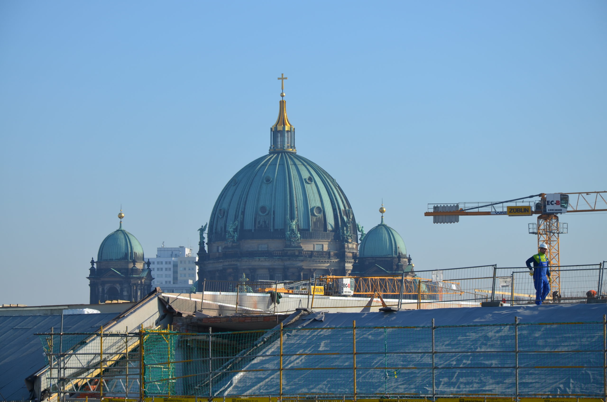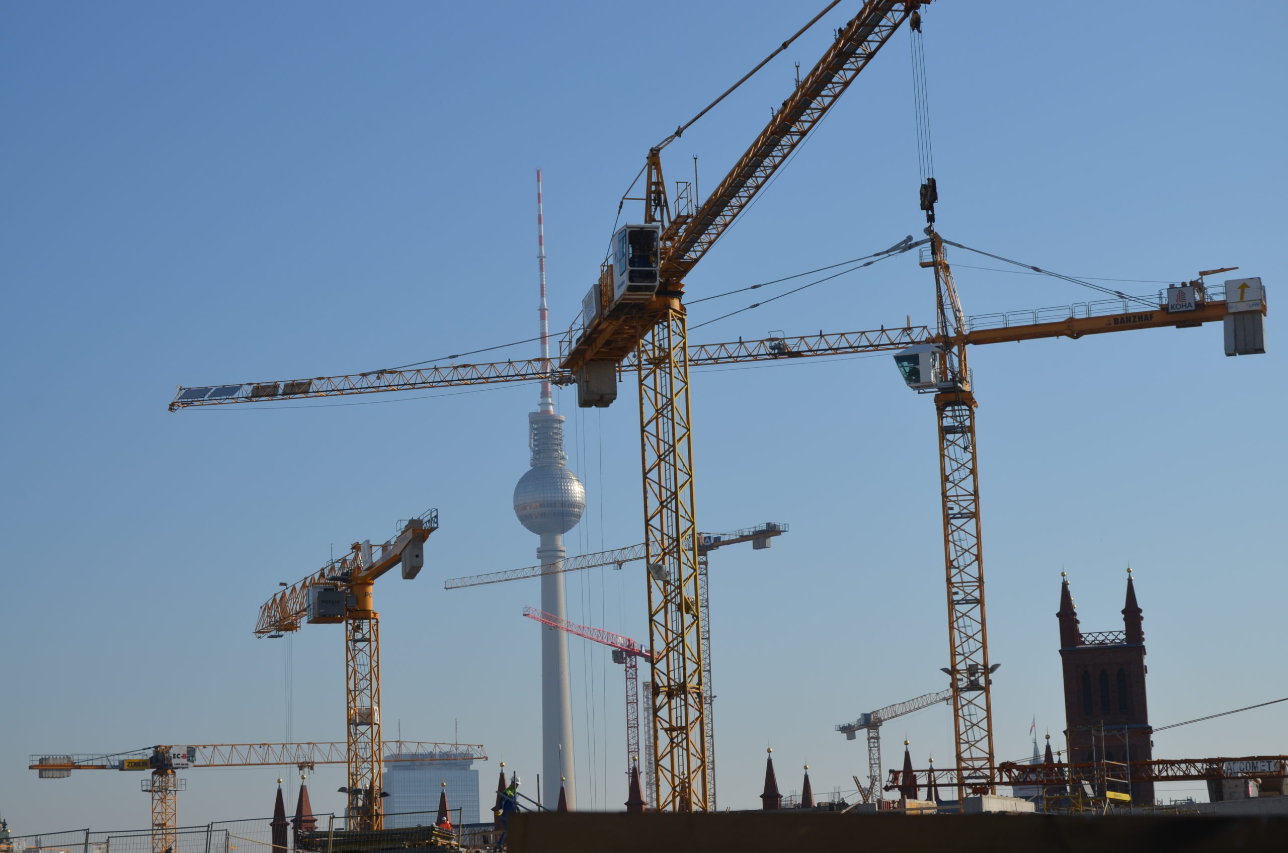 Der Fernsehturm, das Wahrzeichen Berlins, kaum wahrzunehmen zwischen all den Kränen.
