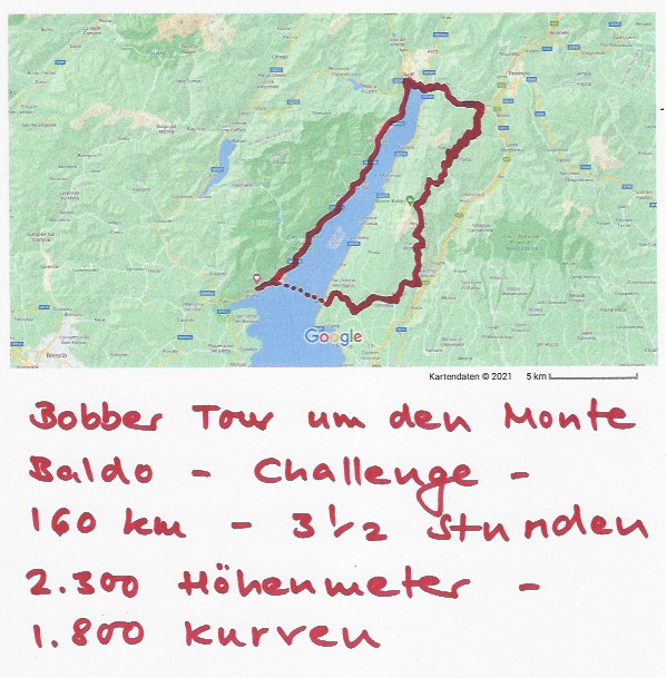 Seit längerem hatte ich mir vorgenommen eine Motorradtour um das Monte Baldo Massiv am Ostufer des Gardasees zu unternehmen. Im Sommer 2019 hattte ich von einem erfahrenen Tourenfahrer gehört, dass es mit der Monte Baldo Höhenstrasse eine spektakuläre Motorrad Strecke zwischen dem Gardasee und dem Etschtal gäbe, und so war ich sehr interessiert diese einmal zu befahren. Die Strasse führt ab Caprino Veronese im Süden bis Mori im Norden komplett entlang des beeindruckenden und 40 Kilometer langen Massivs des Monte Baldo und dabei vorwiegend durch hochalpines Gelände. Anfang August wählte ich einen Tag bei gutem, jedoch nicht zu heissen Wetter sowie ausreichend freier Zeit den Trip anzugehen. Dann setzte ich meinen Plan in die Tat um und nutzte mit der Triumph die Fähre von Toscolano nach Torri, um von dort aus auf die Straße zu gehen. Zwar ging ich durch die bergige Strecke bereits von circa 60 Kilometer Distanz aus ... es wurden jedoch durch die zahlreichen Serpentinen mehr als 100 Kilometer und ich hatte im letzten Drittel Glück, daß es ab dem Peak dann 30 Kilometer lang nur Berg ab ging, sonst hätte mein Sprit nie gereicht. Tankstellen waren natürlich keine da oben am Berg und durch die einsame Fahrt war auch hilfreicher "Sprit" Verkehr durch andere Menschen Mangelware. So steuerte ich die erste mögliche Tankstelle - AGIP in Nago - an, füllte wieder auf und war gegen 18:45 Uhr und damit nach knapp 3 1/2 Stunden reiner Fahrtzeit wieder in Gardone-Riviera zurück. Die letzten 40 Kilometer führten dabei über die Traumstrasse "Gardesana" und durch deren viele Tunnels ... kein Highlight für einen Biker, jedoch war ich für meine ursprünglich geplante Alternativroute über den Lago di Ledro und den Lago Valvestino schon zu spät dran ... Ette und Anna-Lena warteten in der Via Panoramica mit dem Abendessen
