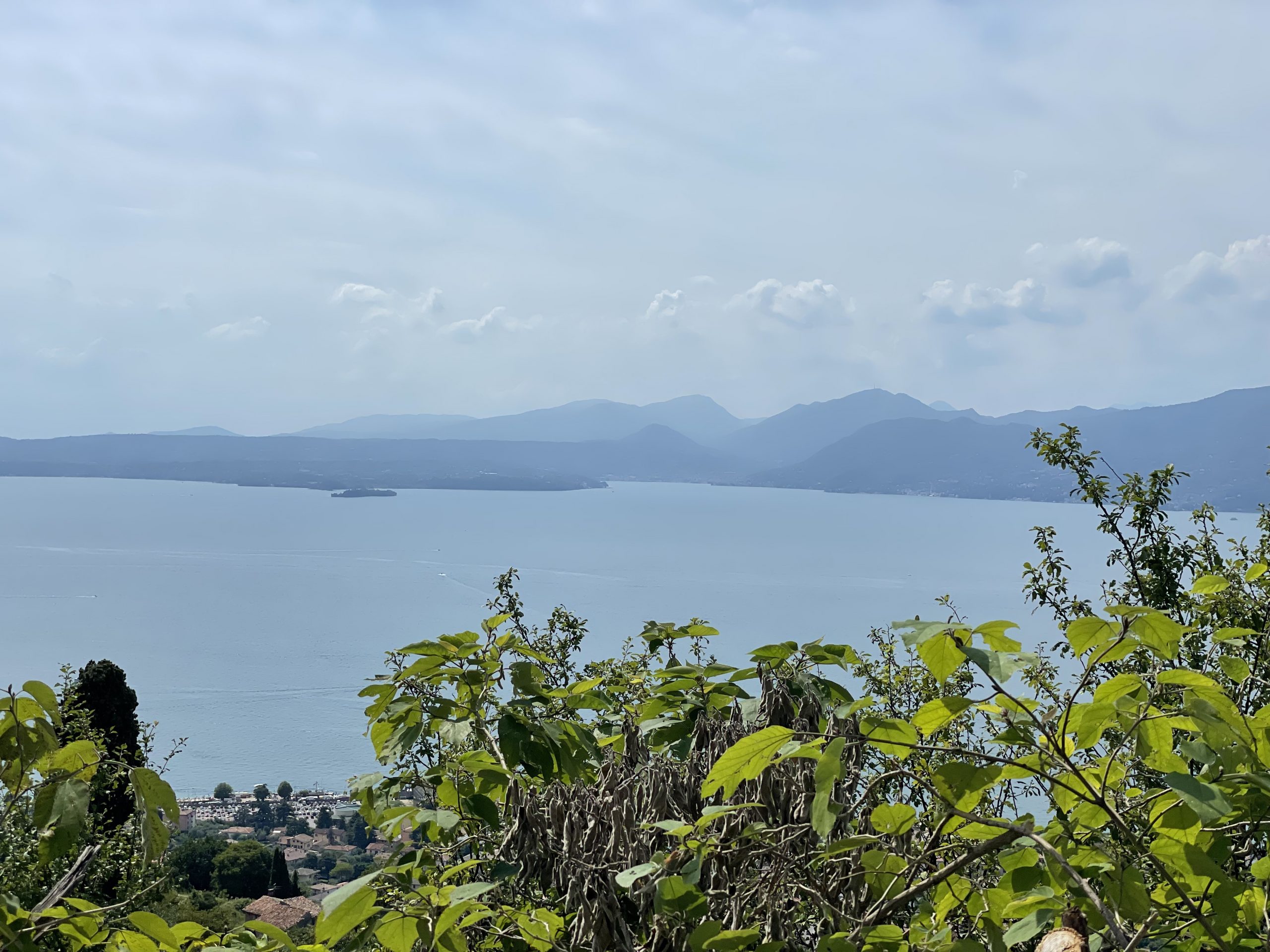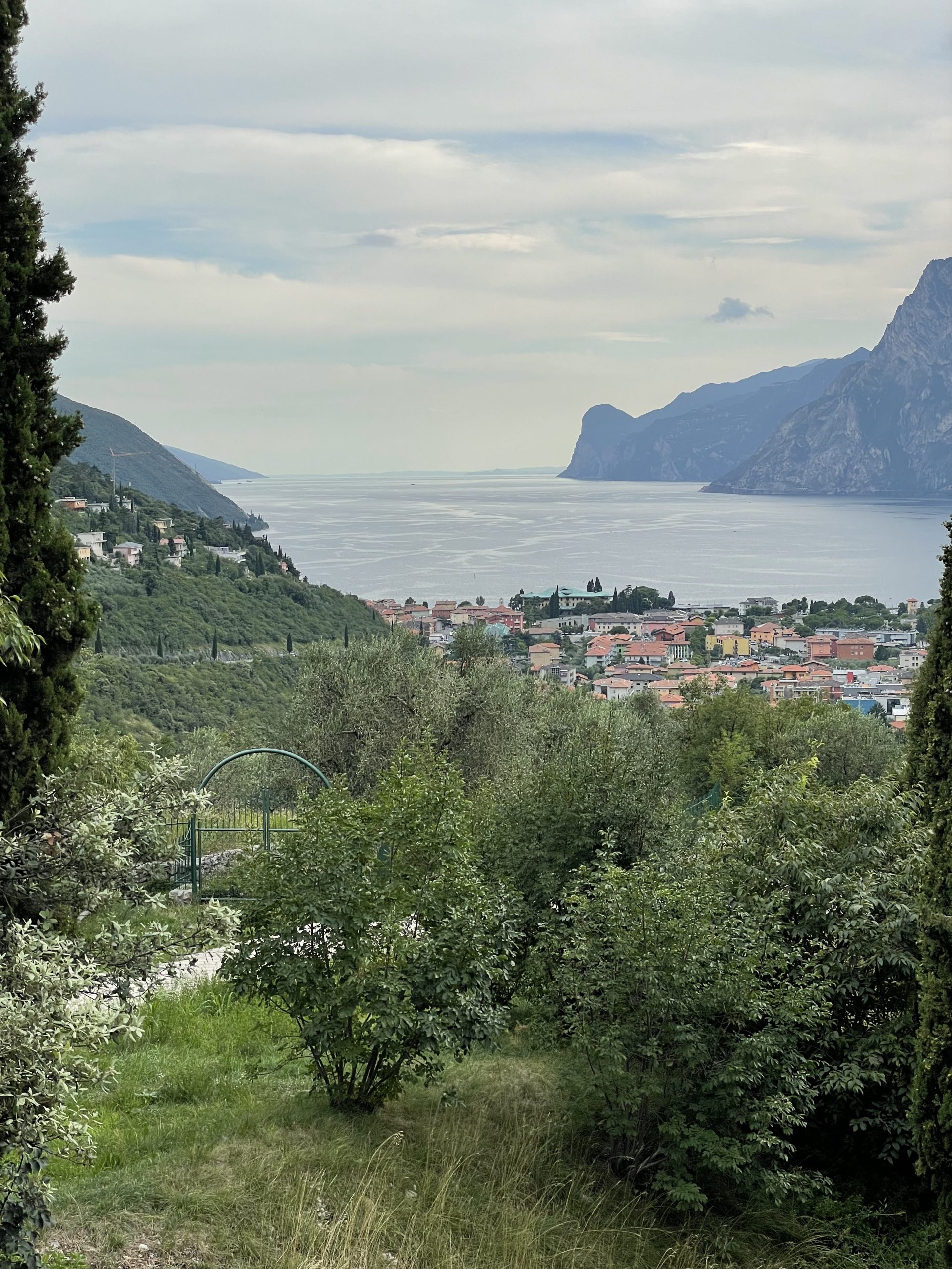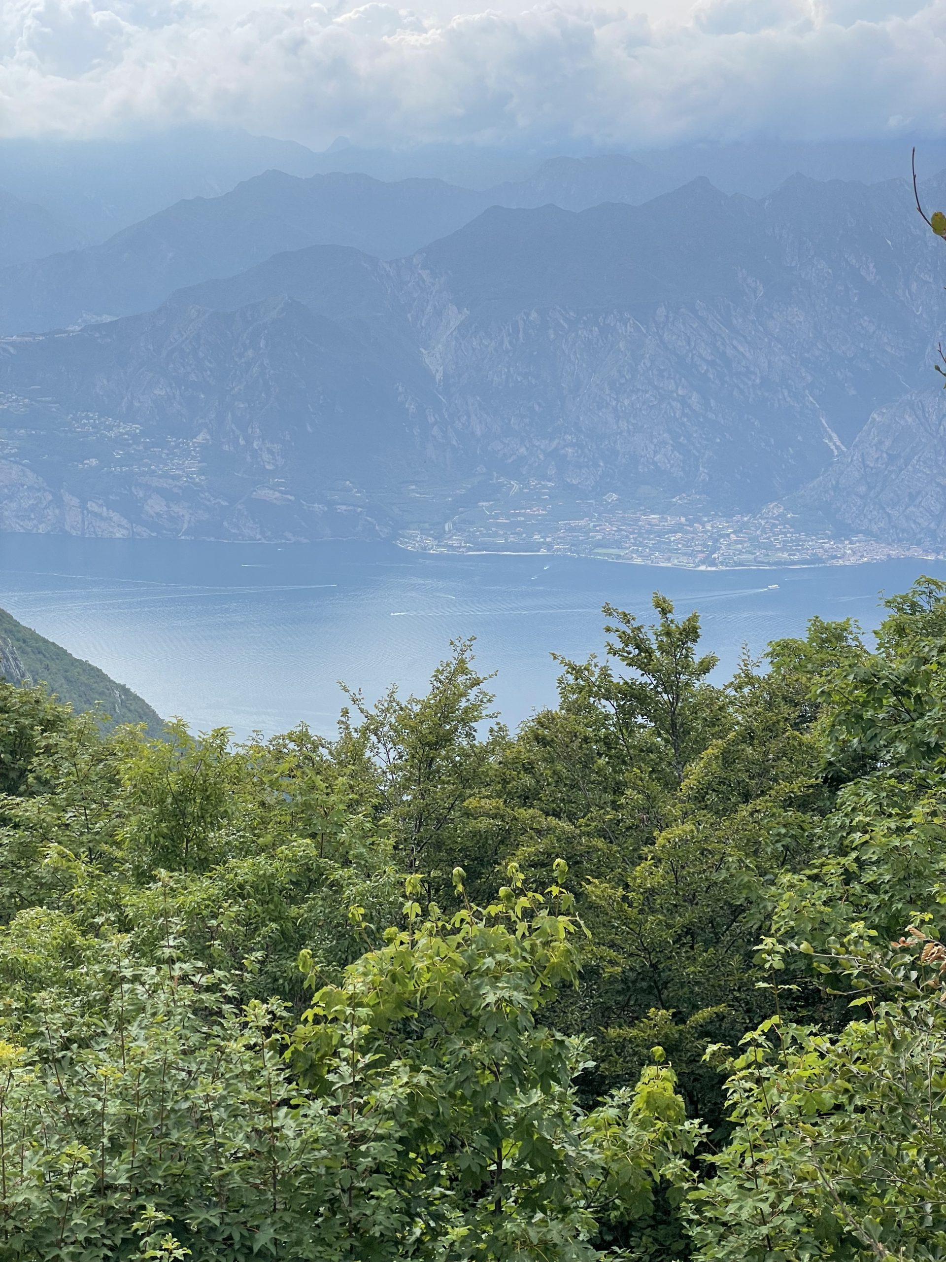Zum Teil öffnen sich grandiose Blicke vom Massiv auf die westliche Uferseite ... wie hier auf den am anderen Ufer des Sees liegenden Ort Limone