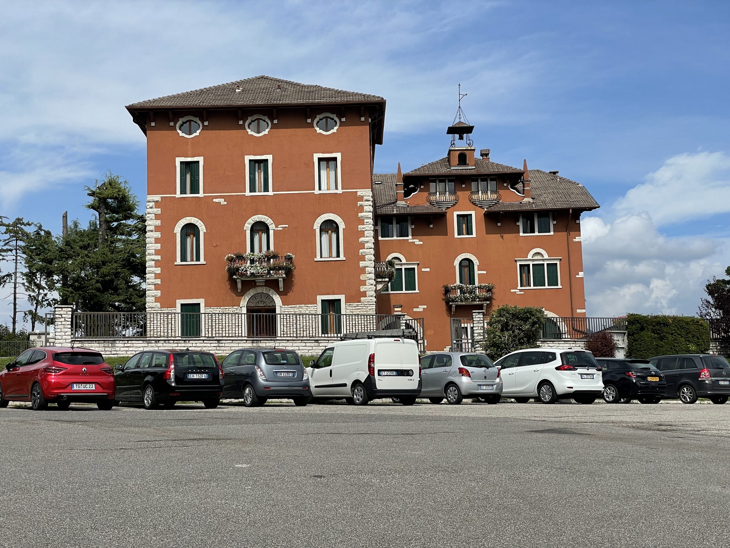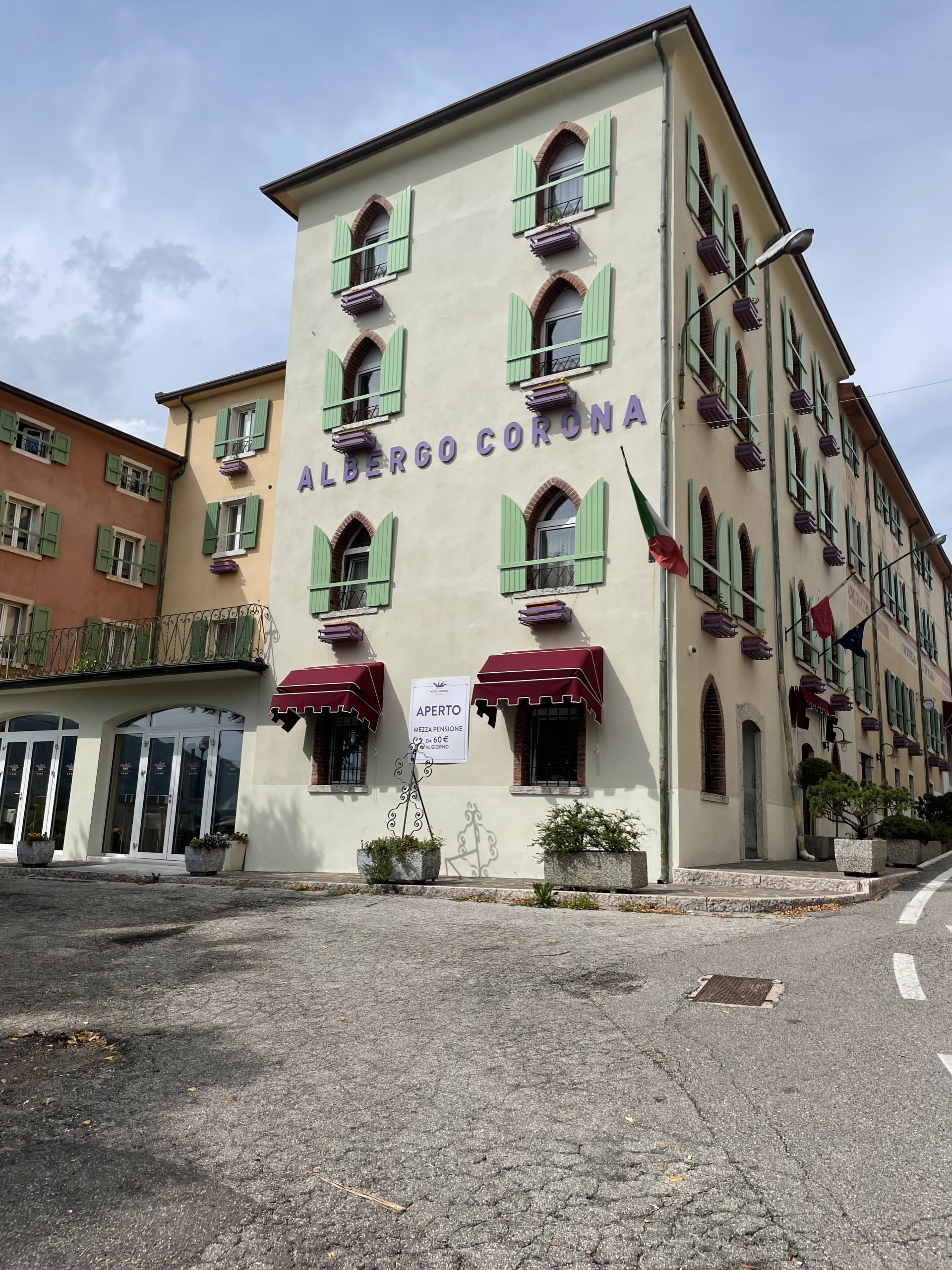 Einen knappen Kilometer hinter Spiazzi geht es an diesem Hotel rechts ab zur bekannten Wallfahrtskirche Madonna della Corona, zu der wir im Jahr 2019 schon einmal einen Vespa Ausflug unternommen haben