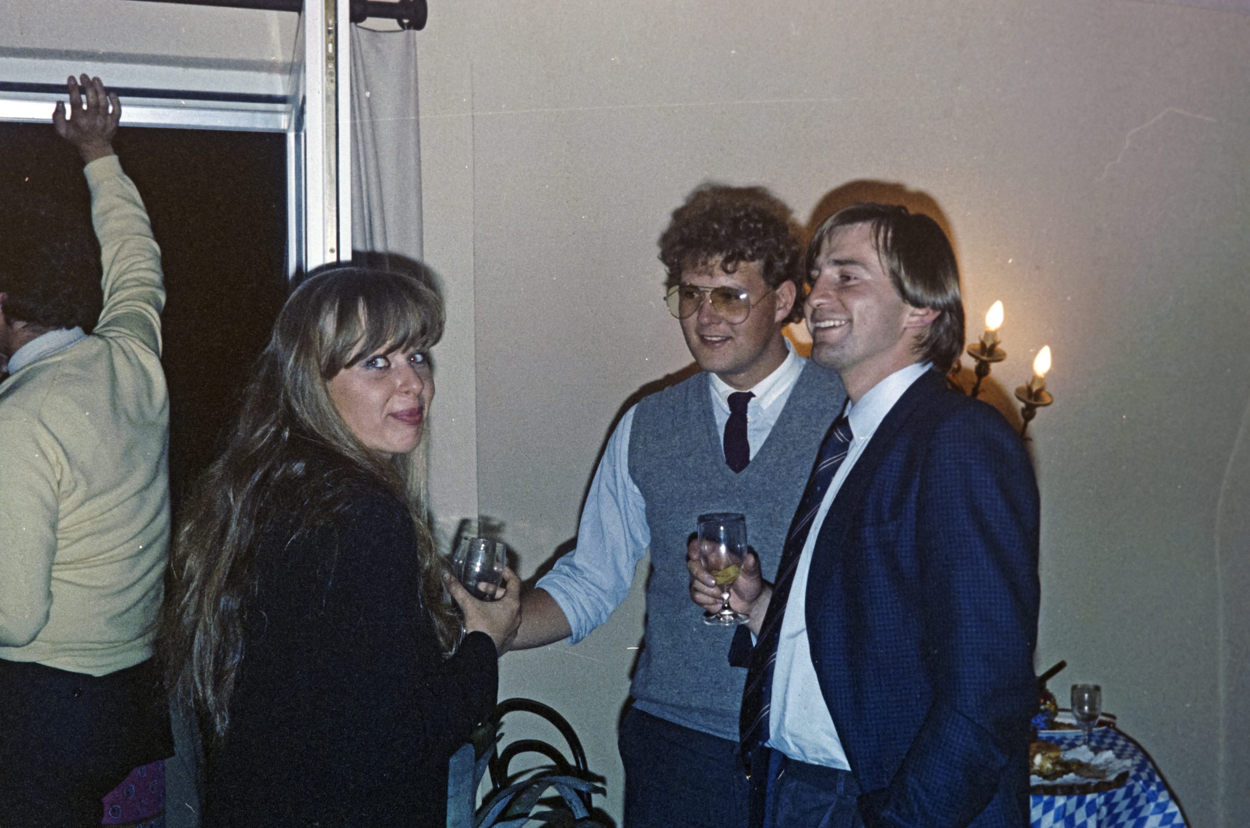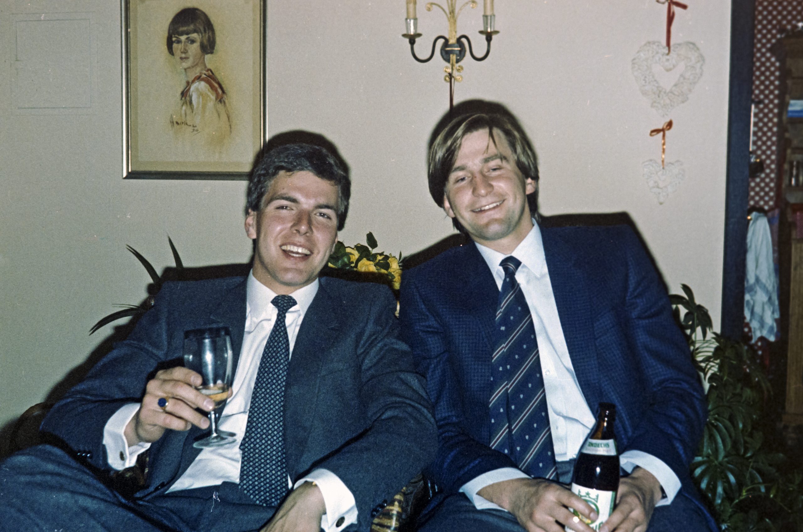 Nach meinem Heiratsantrag im Rahmen eines Skiurlaubs am 12. März des selben Jahres in Morzine-Avoriaz folgte Mitte Mai die Feier zu Nicis und meiner Verlobung. Oft ist mit der Verlobung eigentlich eine kleine Feier im Kreis der Familie verbunden ... wir luden jedoch - der Quadratmetergröße unserer Studentenwohnung am Massmannpark in der Schleissheimerstrasse entsprechend - 60 Freunde und als familiäre Vertreter meine beiden Geschwister Ulrike und Thomas ein. Die Party war sehr lustig ... und dafür, daß sie an einem Dienstag unter der Woche stattfand auch sehr gut und zudem recht lang besucht. Lediglich Tuki Wrangel war ein No Show, da sie keinen Parkplatz fand. Eine Verlobung ist im übrigen das Versprechen, mit einer anderen Person die Ehe einzugehen. Im europäischen Kulturraum findet die Verlobung in aller Regel im Rahmen einer Liebesbeziehung statt. Eingeleitet wird sie durch den Heiratsantrag einer Seite, wobei dieser traditionellerweise bei heterosexuellen Beziehungen zumeist vom Mann erwartet wird. Die Verlobungszeit ist dann insbesondere eine Vorbereitungszeit auf die später zu schliessende Ehe. Sie endet am Tag der Hochzeit, es sei denn, ein Verlobter tritt von dem Verlöbnis zurück. Das Verlöbnis wird auch durch den Tod eines der Verlobten aufgelöst. Die Bezeichnung Verlobte wird auch zur Bezeichnung eines Brautpaares verwendet. Die Verlobung ist dabei ein nicht einklagbares Eheversprechen. Während der Verlobungszeit impliziert die Beziehung zwischen den Verlobten stärkere oder schwächere soziale und wirtschaftliche Rechte und Pflichten zwischen den beteiligten Familien sowie Verwandtschaftsgruppen. Alles schöne Theorie ... wir waren auf jeden Fall mal sehr früh verlobt und dadurch auch sozial legitimiert gemeinsam in einer Wohnung zu leben. Zudem haben wir im September 1985 und damit nach 4 1/2 Jahren Verlobungs- und Probezeit dann auch geheiratet.