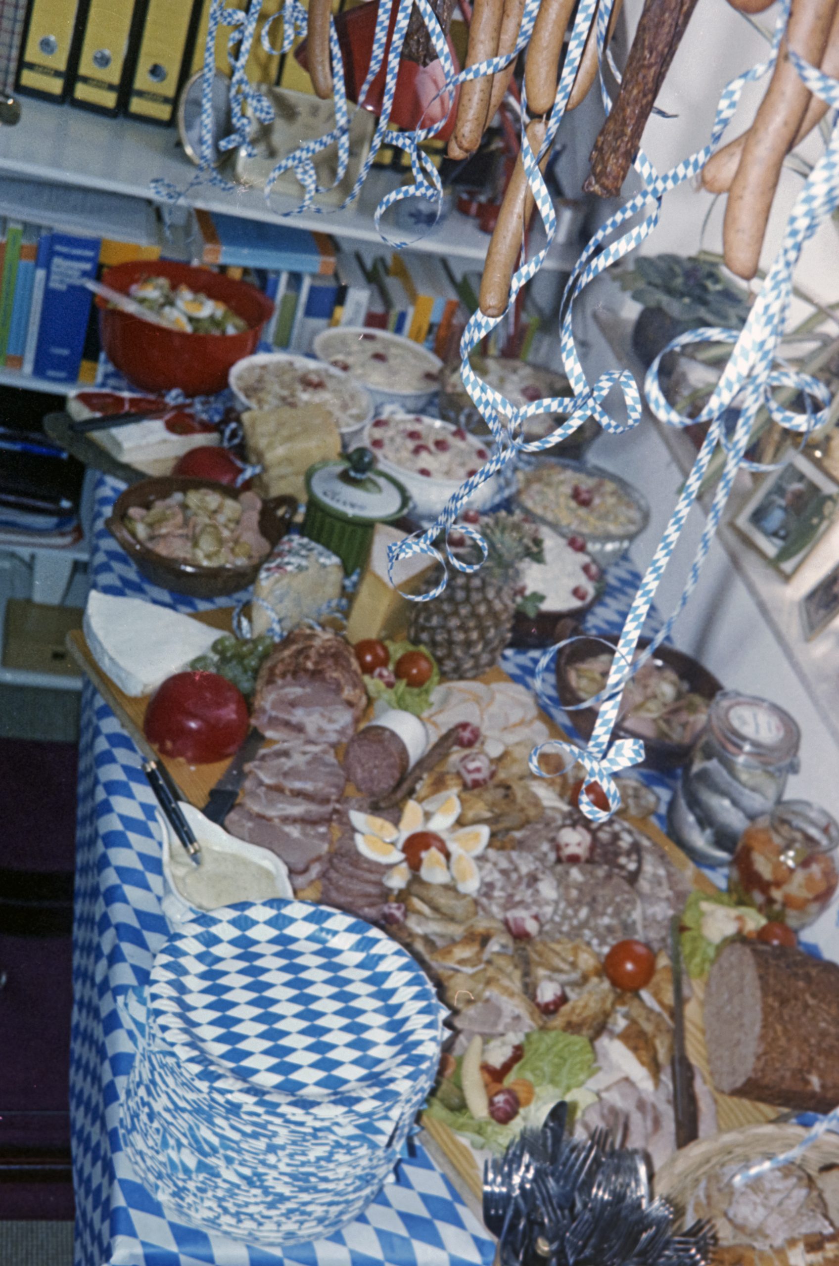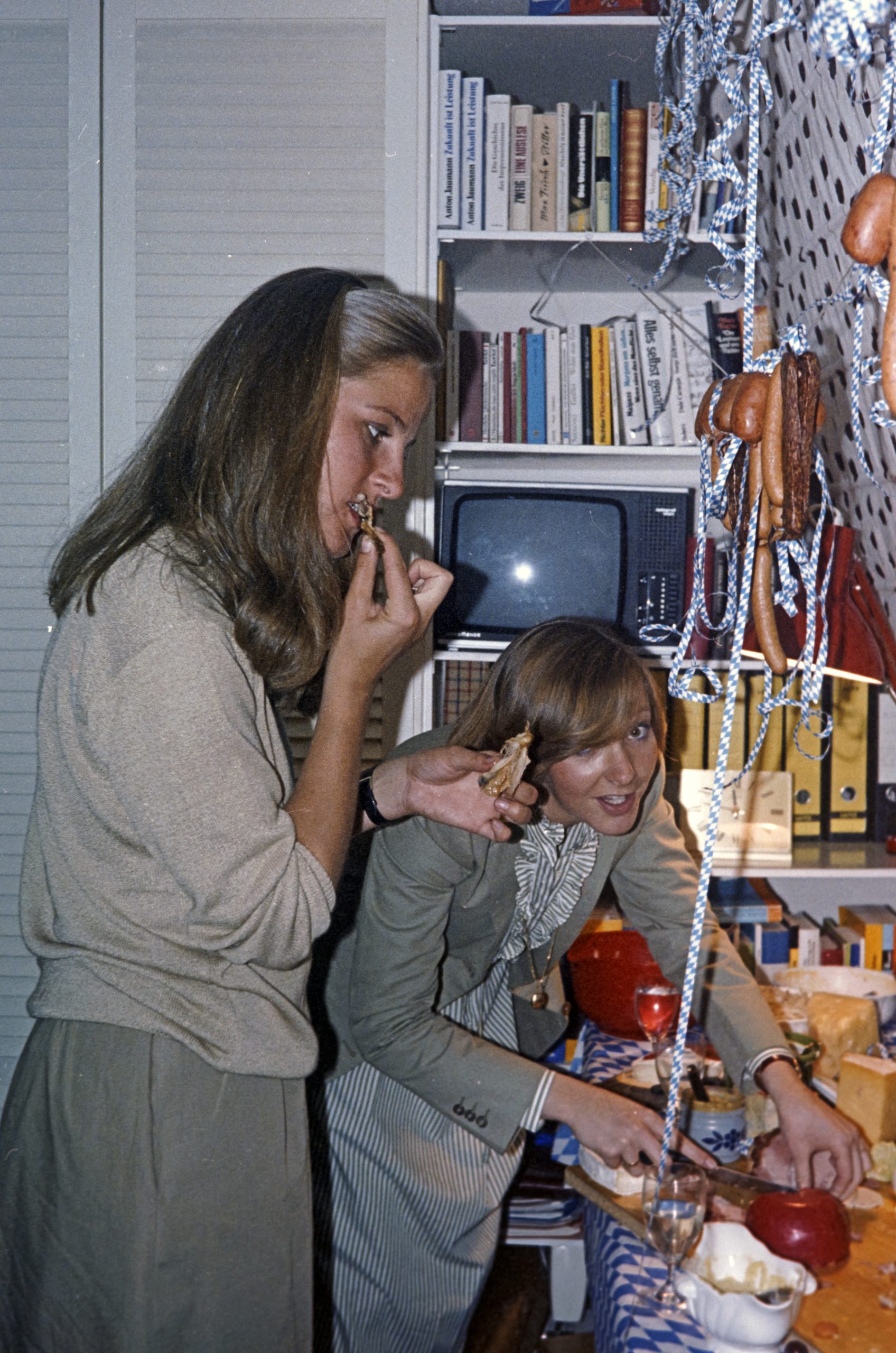 Sabine Klein und Marion Arnold-Cannet testen das Käse Buffet .... die gelben Leitzordner aus dem Regal habe ich heute noch