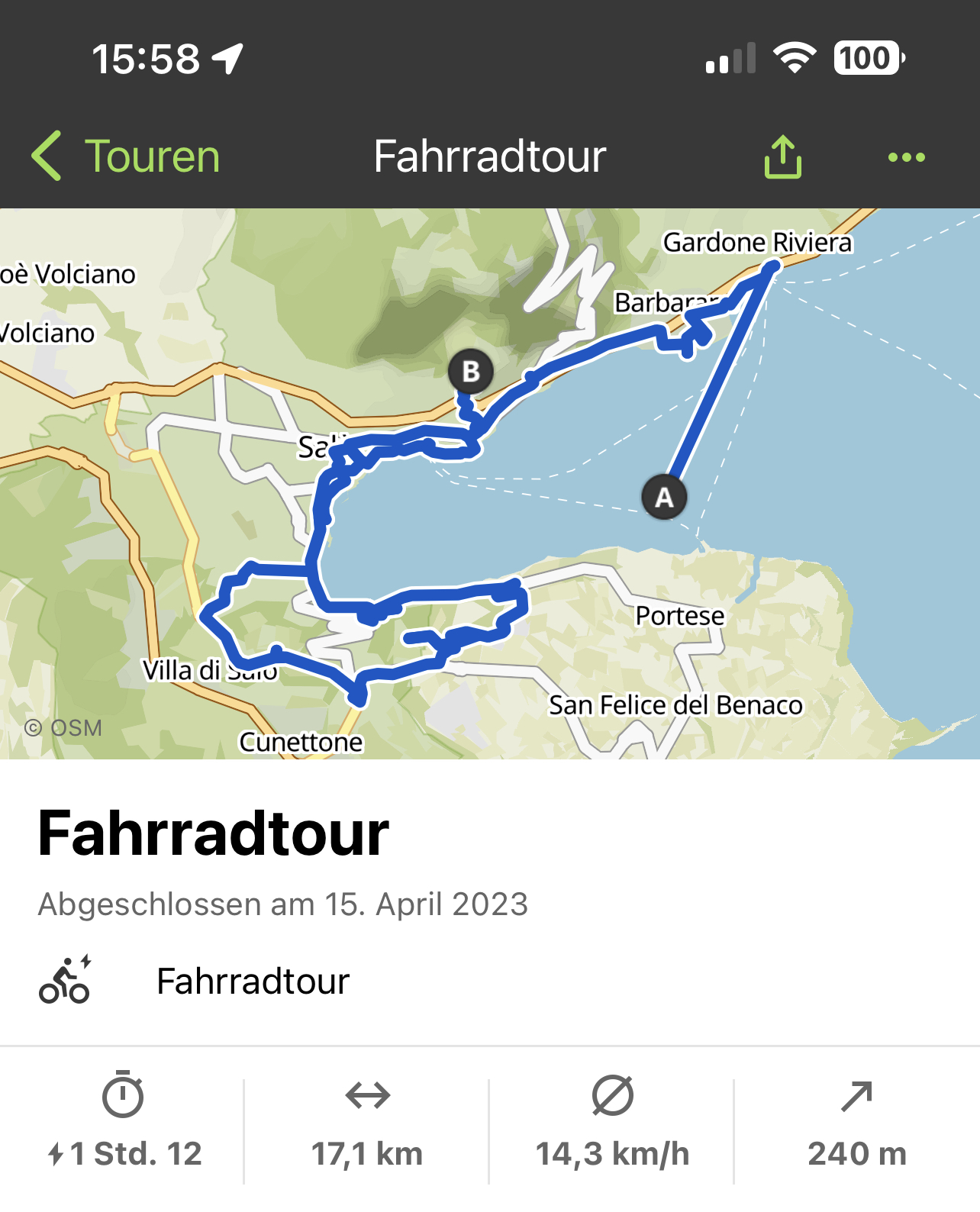 Insgesamt 17,1 km in einer Stunde und 12 Minuten ergibt eine Durchschnittsgeschwindigkeit von 14,3 km/h bei meiner Tour um die Bucht