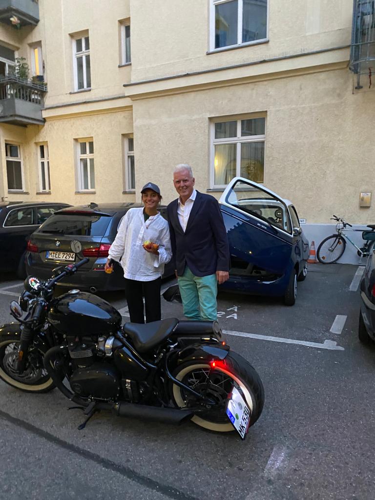 Kleebinders sind mit ihrem Microlino und ich mit der Triumph Bobber unterwegs