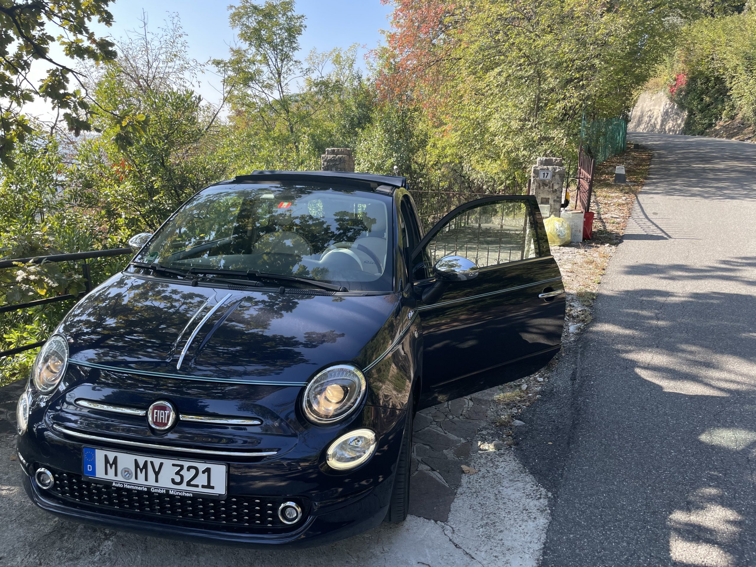Abfahrt mit unserem Fiat 500 aus der Via Panoramica nach München
