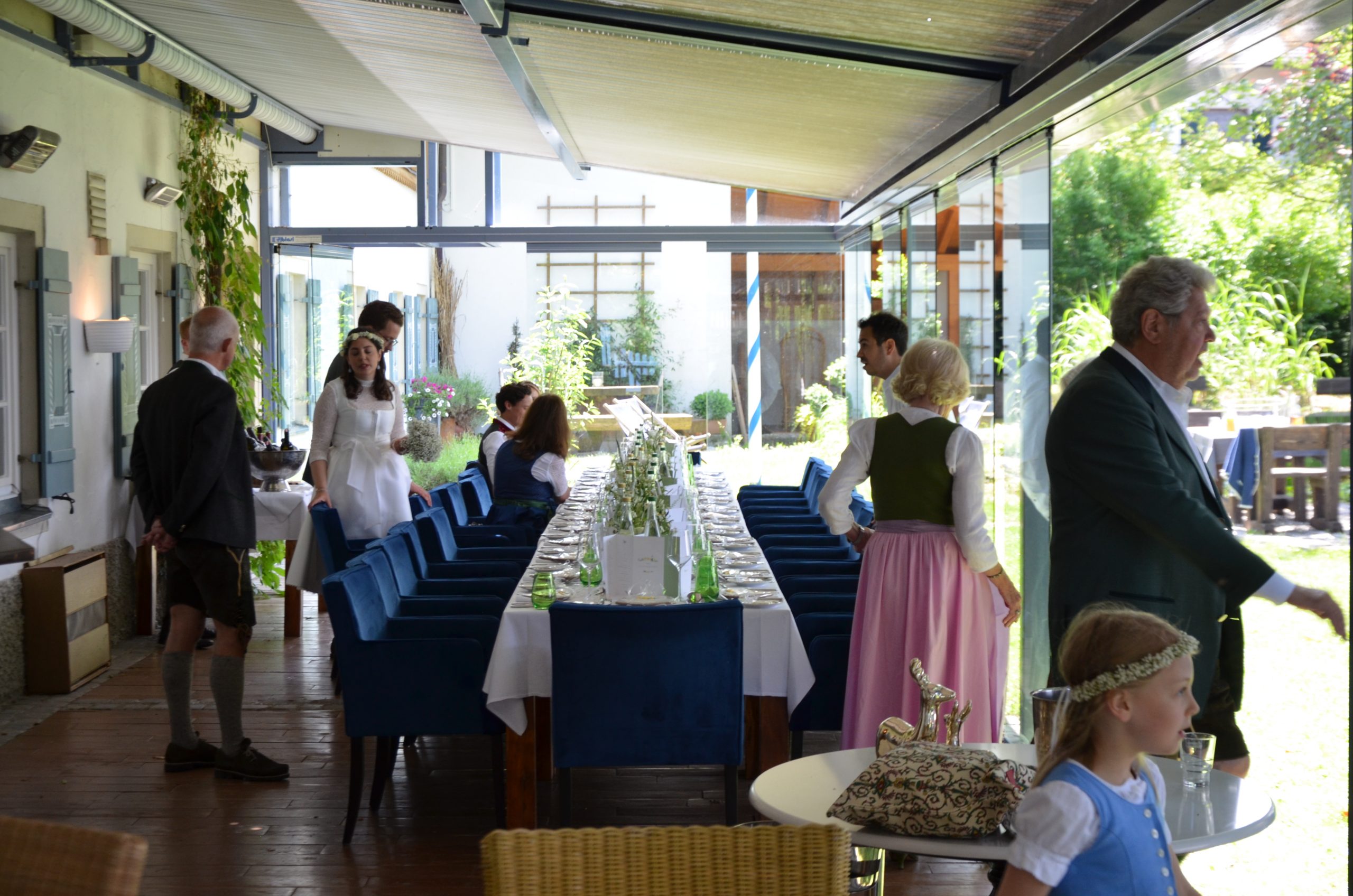 Als besonderes Geburtstagsgeschenk zu meinem 63.ten haben sich Feli und Paul diesen Tag vor dem Pfingstwochenende als Termin für ihre Standesamtliche Trauung im engsten Familienkreis ausgesucht. Nach dem offiziellen Termin mit einer besonders netten Trauung im Rathaus von Prien am Chiemsee fahren wir zu einem festlichen Mittagessen nach Frasdorf. Zwischen Chiemsee und den bayerischen Alpen liegt hier der traditionsreiche Landgasthof Karner. Das kleine denkmalgeschützte Hideaway verbindet ländliche Behaglichkeit mit einem Hauch von Luxus und das in einer der landschaftlich schönsten Urlaubsregionen, die Bayern zu bieten hat. Unweit von München und Salzburg entfernt, findet man inmitten der sanften Hügel des Voralpenlandes Ruhe, unverfälschte Natur und klare Luft zum Durchatmen. Das Boutique Hotel verzaubert nicht nur mit Architektur, geschmackvollem Interieur und charmantem Wellnessbereich, sondern auch mit zwei hochwertigen Restaurants: der Westerndorfer Stube und dem Gourmet Restaurant im Karner. Die Westerndorfer Stube bietet regionale und saisonale Spezialitäten. Hier gilt die Liebe der traditionellen bayerischen Küche. Gerne verwöhnt man Sie hier jedoch auch mit vegetarischen und internationalen Spezialitäten. Für die ganz besonderen Abende können Gäste im Gourmet Restaurant speisen. Hier verwöhnt Sie der Chefkoch Manuel Wimmer in ungezwungener Atmosphäre mit zeitgemäßer Küche auf höchstem Niveau. Schmecken Sie Leidenschaft für frische Produkte von regionalen Anbietern bei jedem Gericht und lassen Sie sich kulinarisch verwöhnen. Vom Stil her basieren die Gerichte auf der klassischen „Haute Cuisine“, interpretiert werden diese jedoch leichter und moderner. Das junge Küchenteam, rund um den Chefkoch Manuel Wimmer, bietet im Gourmet Restaurant zwei verschiedene Menüs an. In unserem Restaurant erleben Sie eine authentische, einzigartige Atmosphäre gepaart mit moderner Küche und exzellentem Service. Ausklingen lassen kann man den Abend in der Bar des Landgasthofs, mit hochwertigen Weinen aus dem Weinkeller, bayerischem Bier oder Cocktails. Bei herrlichem Wetter saßen wir mit der Hochzeitsgesellschaft auf der schönen Außenterrasse. Im Anschluß an das köstliche Mittagessen ging es - ins nicht weit entfernte Pfifferloh - und dort ins Haus von Barbara und Konni Bernheimer weiter, wo wir das schöne und harmonische Fest mit der Hochzeitstorte, köstlichen Getränken und Würsteln vom Grill ausklingen lassen.