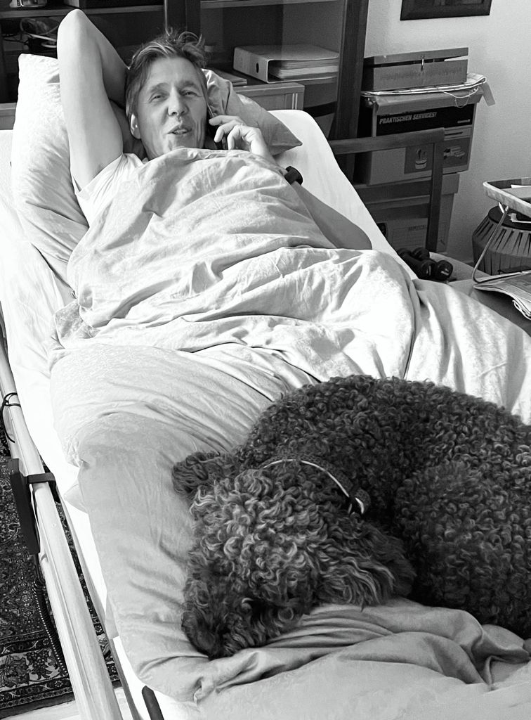 Mit dem zweiten Patienten Mathias in Düsseldorf sind wir nur per VideoStream verbunden ... er kuriert seinen Oberschenkelmuskelabriss auch ohne Nadeln zum Glück erfolgreich aus ... wobei der Heilungsprozess sicher auch durch die Fürsorge seines Lieblingshundes beschleunigt wird