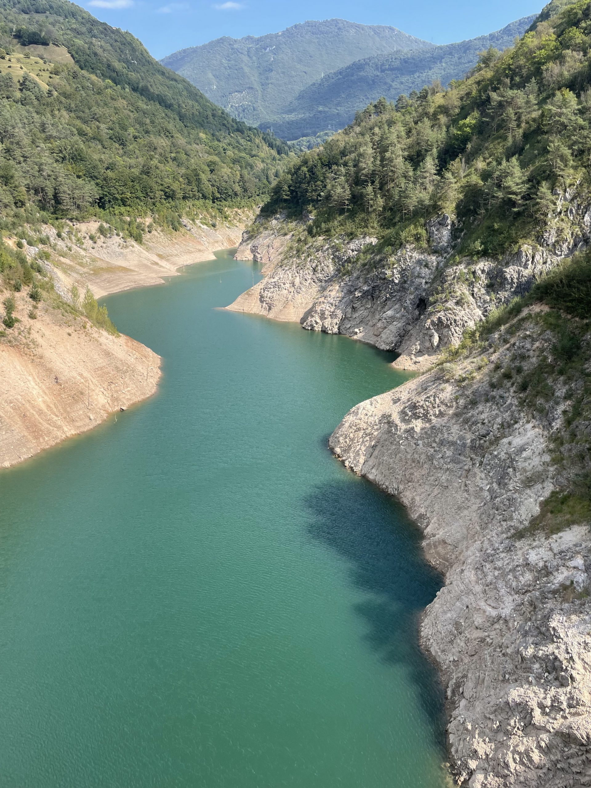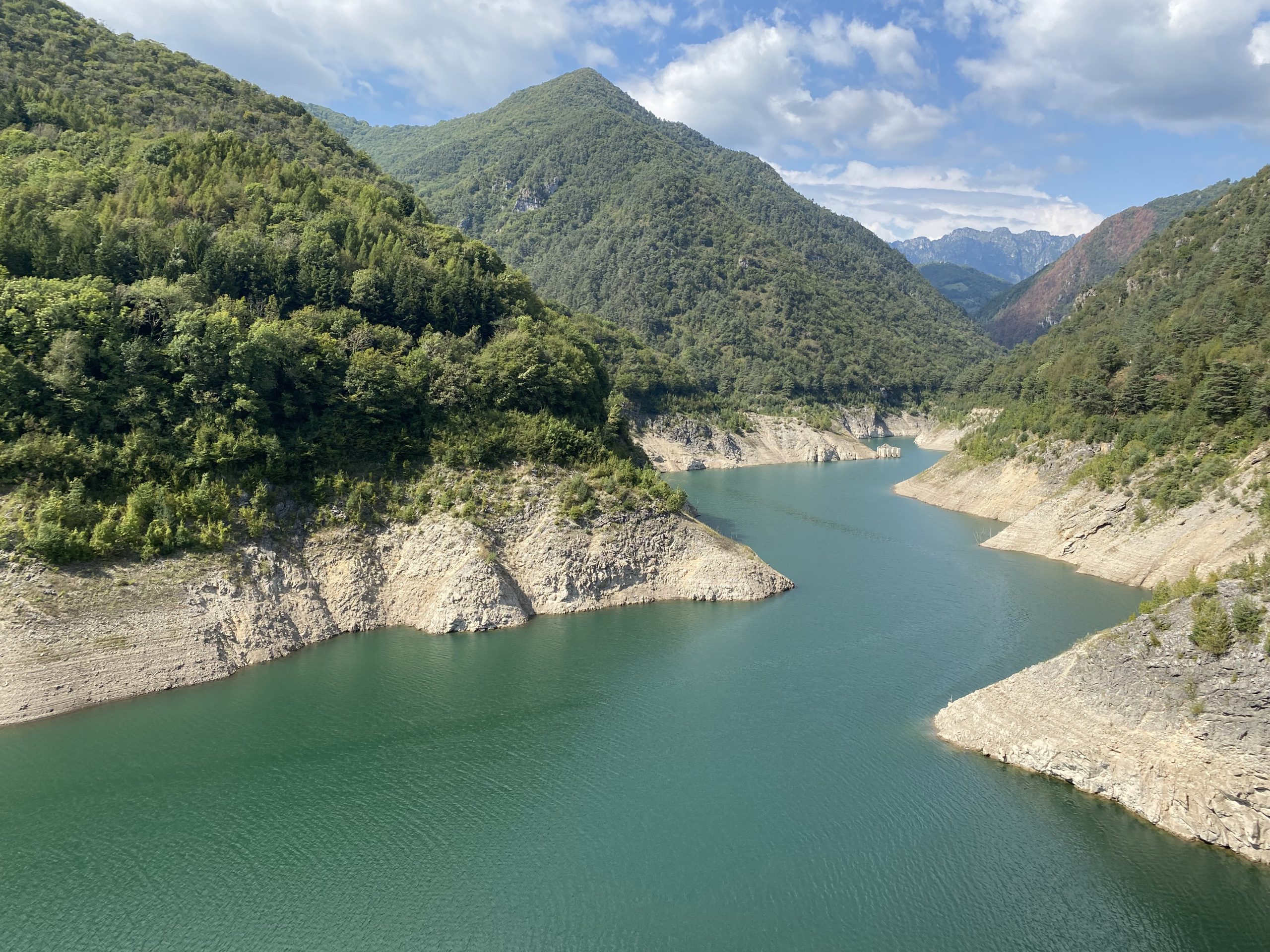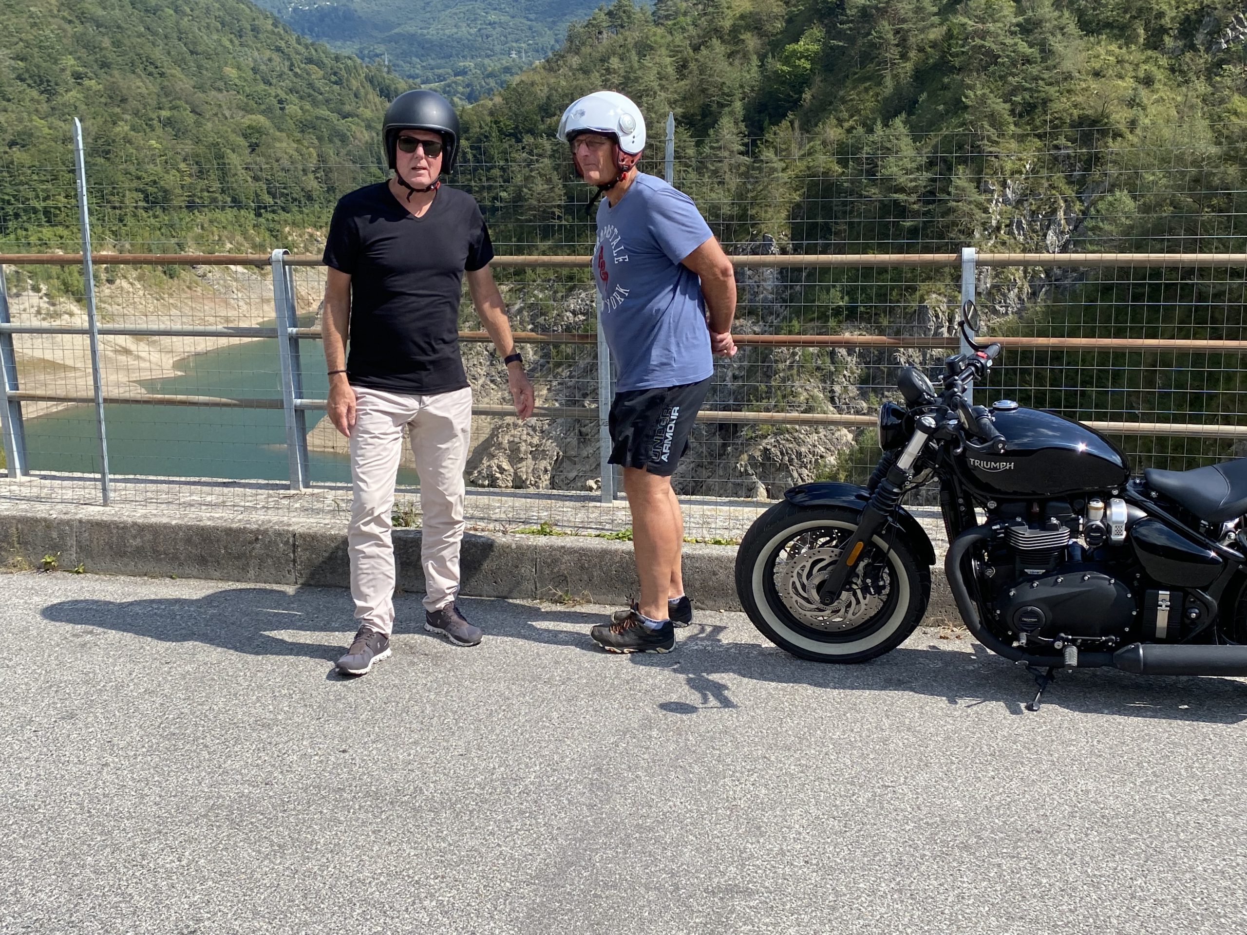 Zu unserem Hochzeitstag bekommen Annette und ich Besuch. Mit Jasmin und Michi Plank sowie Fri Bianchi sind besonders langjährige Freunde zu Gast bei uns in Gardone. Ein schöner Anlass, um tagsüber Ausflüge zu unternehmen und den wunderbaren Abend mit einem herrlichen Essen zu verbringen. Der erste Ausflug ist eine Bike Tour an den Lago di Valvestino, ein landschaftlich schöner kleiner Stausee, der wie ein Fjord ausschaut und nur wenige Kilometer westlich des Gardasees liegt. Von zahlreichen hohen Felswänden umgeben, erinnert der Lago di Valvestino eher an einen norwegischen Fjord denn an einen Bergsee in Norditalien. Aber gerade diese einzigartige Landschaft macht den Lago di Valvestino so interessant; die Anfahrt zum See erfolgt entweder über Gargnano am Gardasee-Westufer oder über den Lago di Idro. In jedem Fall ist der Weg hier schon das Ziel. Die Serpentinen der engen Bergstraßen sind gesäumt von viel Natur, hohen Gipfeln und teilweise atemberaubenden Aussichten. Mit Fertigstellung der Staumauer bei Ponte Pola im Jahr 1962 wurde mit der Anstauung des Lago di Valvestino begonnen. Die Staumauer ist bis zu 124 Meter hoch und hat eine Scheitellänge von 283 Metern. Neben der touristischen Bedeutung für Urlauber wird mit dem Wasser des Lago di Valvestino ein Pumpspeicherwerk gespeist, welches die angrenzenden Gemeinden mit Elektrizität versorgt. Die Jahresleistung liegt bei rund 37 Megawatt. Der Lago di Valvestino beherbergt mehrere Höhlen und einsame Badebuchten, die zwar nur zu Fuß erreichbar sind, dafür aber noch wirklich unberührte Natur bieten. Massentourismus ist am Lago di Valvestino ein Fremdwort, da der See ausschließlich über eine kurvenreiche Bergstraße zu erreichen ist, die im Sommer bei Motorradfahrern besonders beliebt ist. Wer Ruhe und Erholung liebt, das Wandern in unberührter Berglandschaft, Radfahren in den Bergen oder Baden im frischen Wasser eines Bergsees - der wird den Lago di Valvestino lieben. Das Baden im Stausee haben wir dann selber doch nicht umgesetzt - durch das niedrige Wasser hätten wir ganz schön tief runtersteigen müssen - sondern im Rahmen unseres zweiten Ausflugs mit dem Boot am Gardasee erledigt.
