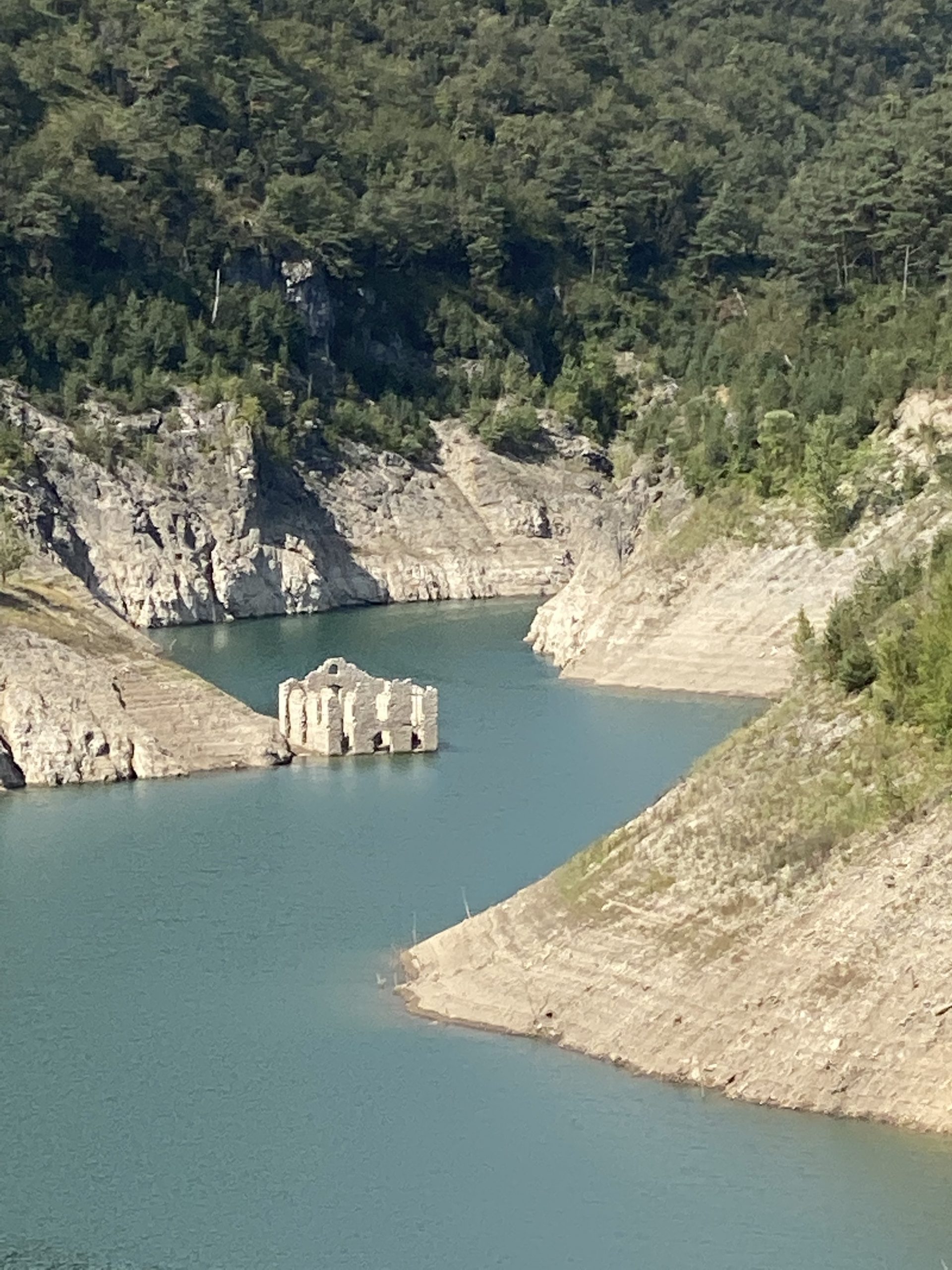 Die verschiedenen Arme des Lago di Valvestino bei einem recht niedrigen Wasserstand; so ist auf dem rechten Bild sogar noch die Ruine eines Hauses zu sehen, das bei der Anstauung im 1962 in den Fluten versank