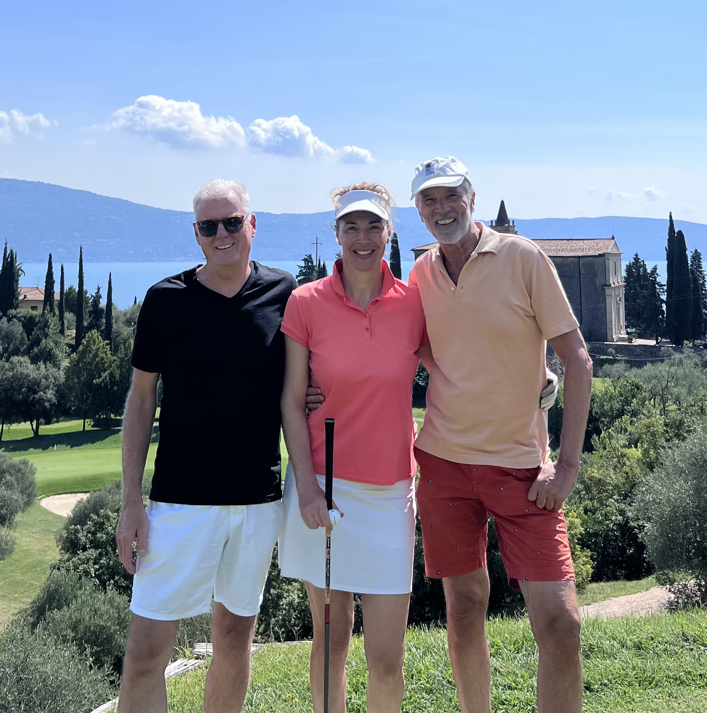 Stefanie, Georg, Michael und ich genießen eine schöne Runde im Golfclub Bogliaco. Dies gemeinsam mit der immer noch souverän spielenden 80jährigen Heide Vaubel im Flight. Heide lebt im Sommer in Roino oberhalb von Bogliaco und sonst in unserer unmittelbaren Bogenhauser Nachbarschaft in der Donaustrasse. Sie stammt aus Bad Driburg und war früher eine Top Golferin mit Single Handicap