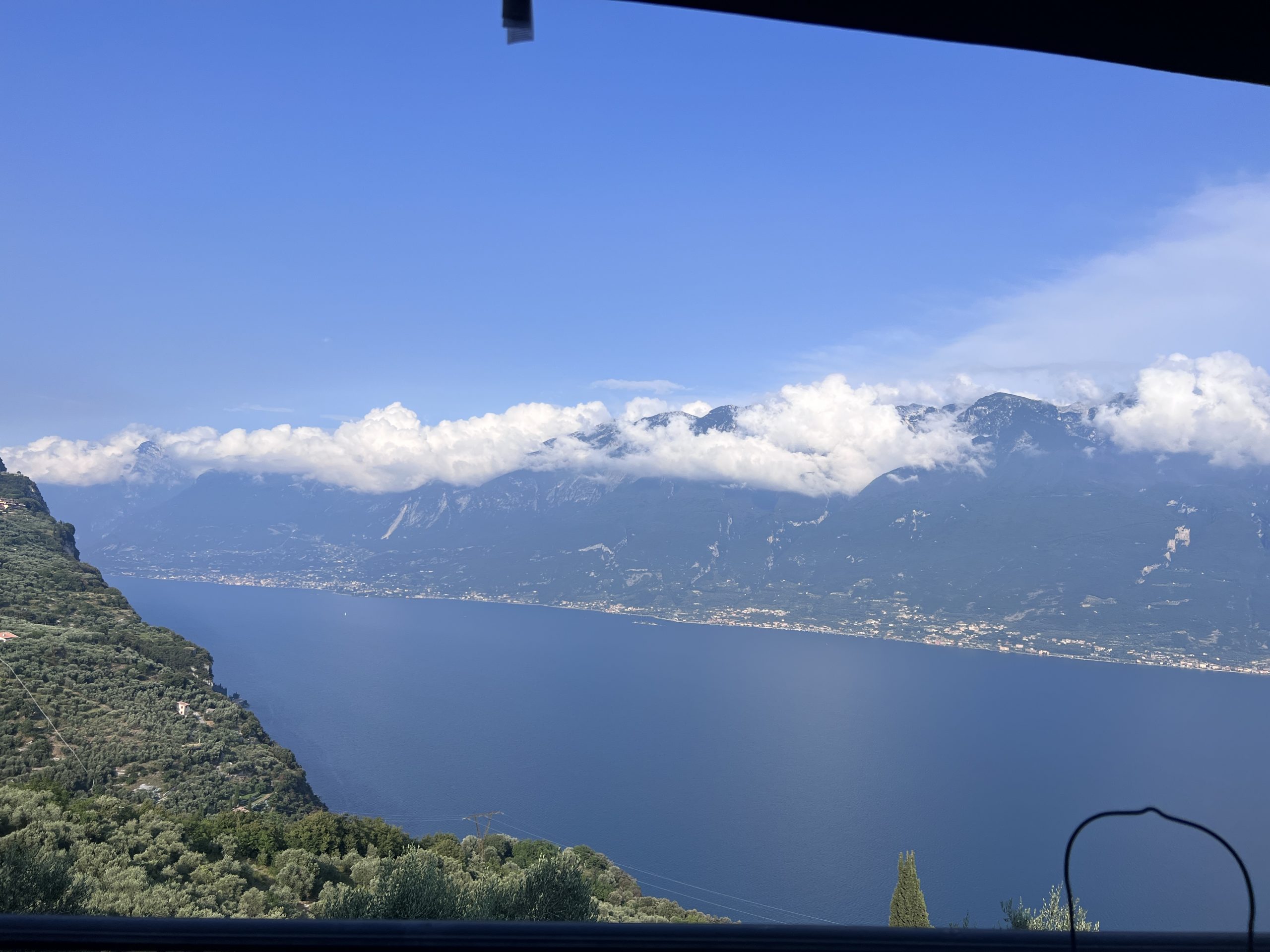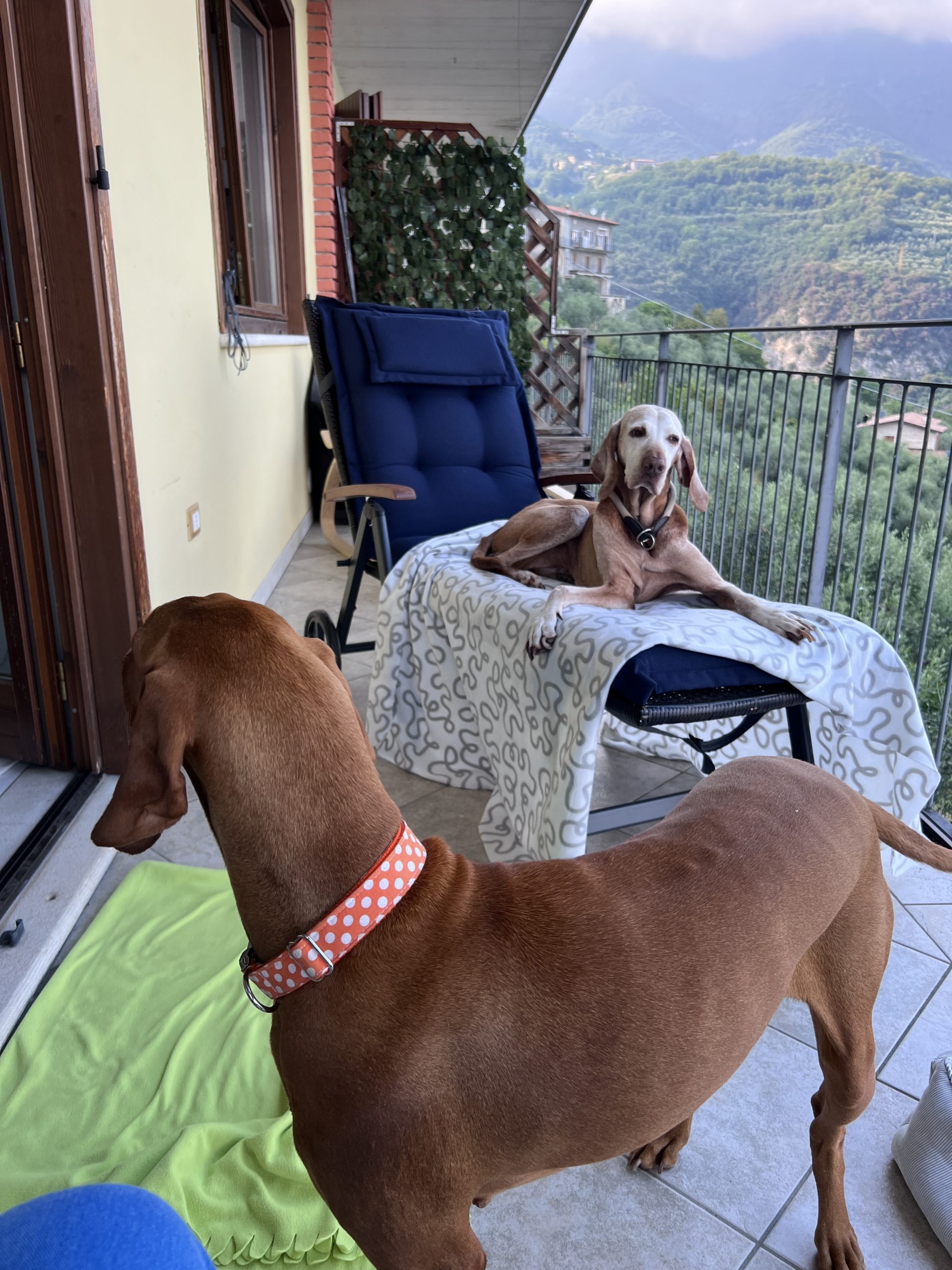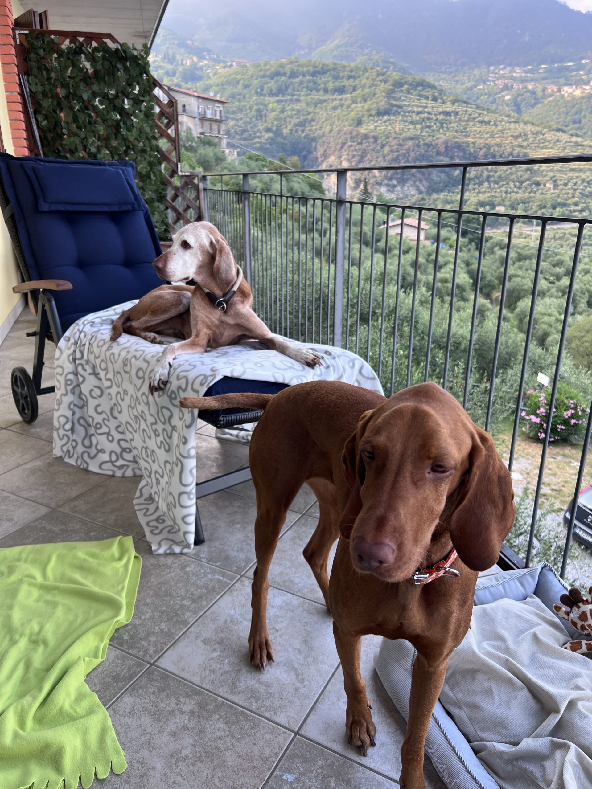 Tati und Ginger machen es sich auf dem Balkon bequem und geniessen den herrlichen Ausblick auf den See mit dem Massiv des Monte Baldo im Hintergrund